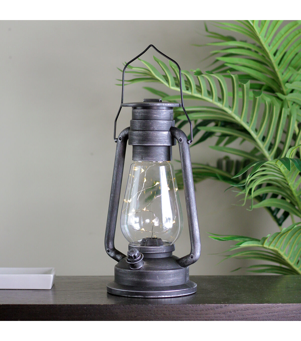 Light up your Summer with this lantern. Perfect addition to any evening party or for an romance ambience with your loved one. This stylish lantern will be be the ideal addition to your decor year round. Features a large handle for carrying and hanging Includes 20 count white micro lights inside Unique brushed silver coloring On/off switch on bottom on lantern Faux rotary knob on front Uses 3 'AAA' batteries - not included Perfect for hanging in the garden or placing on a table top Indoor/outdoor use - if using outdoors it is recommended to keep in a covered area Dimensions: Lantern Without handle: 12"H x 7"W x 5.5"D With handle: 15.5"H x 7"W x 5.5"D Material(s): plastic