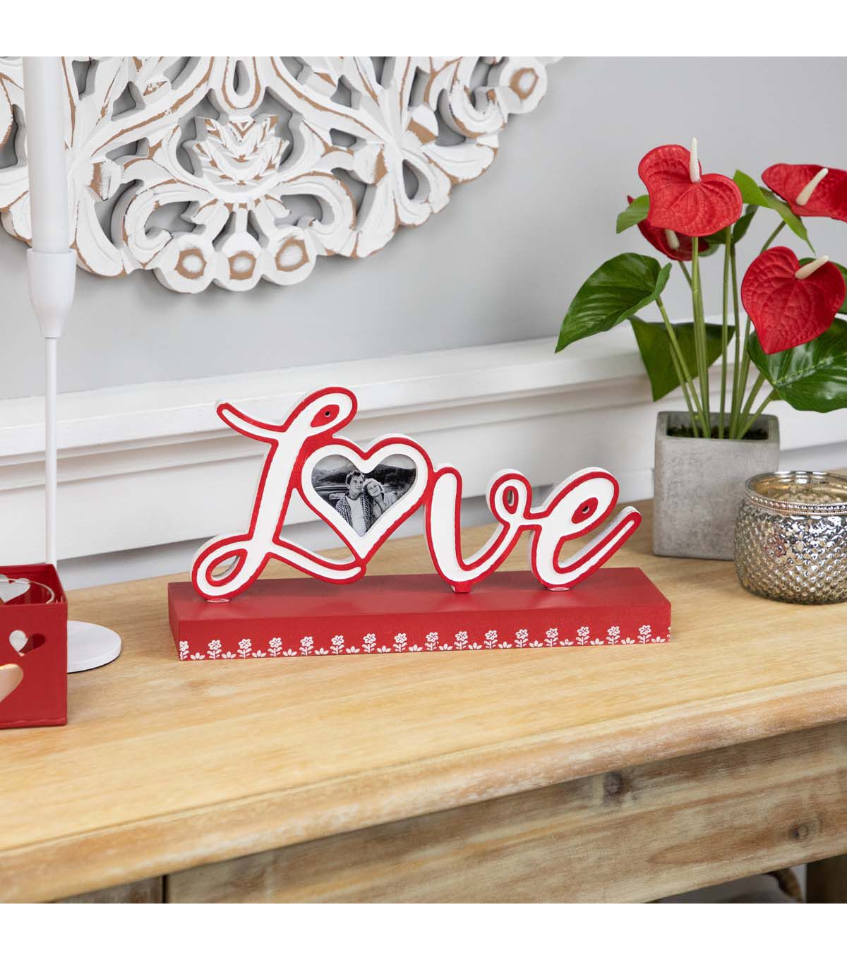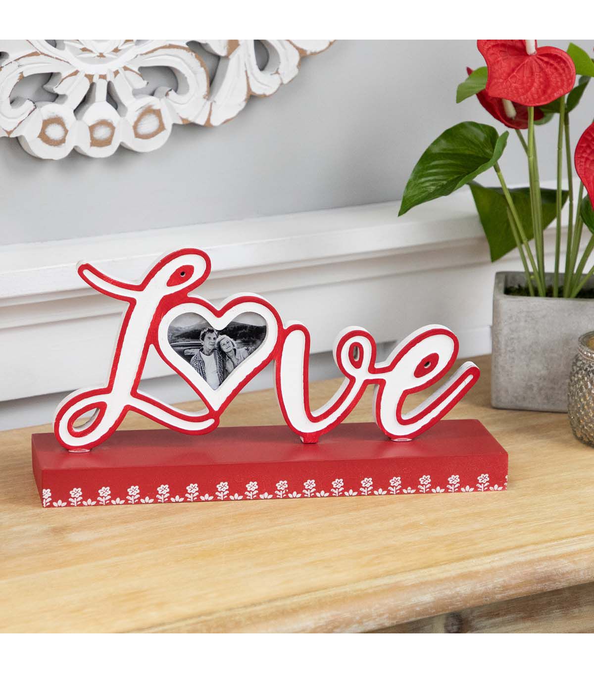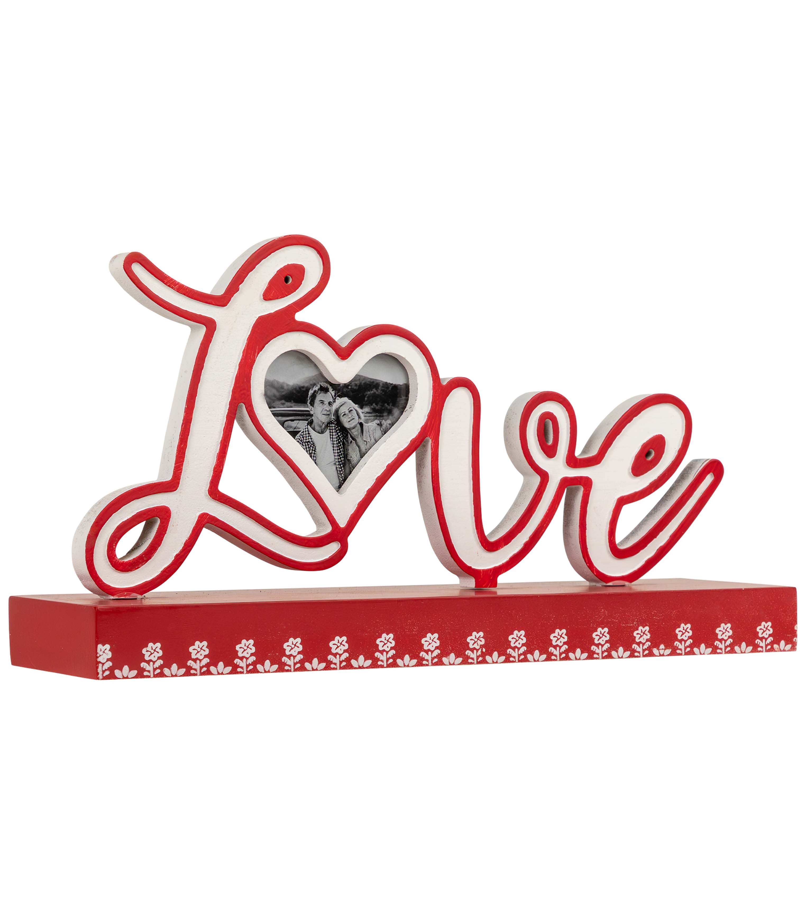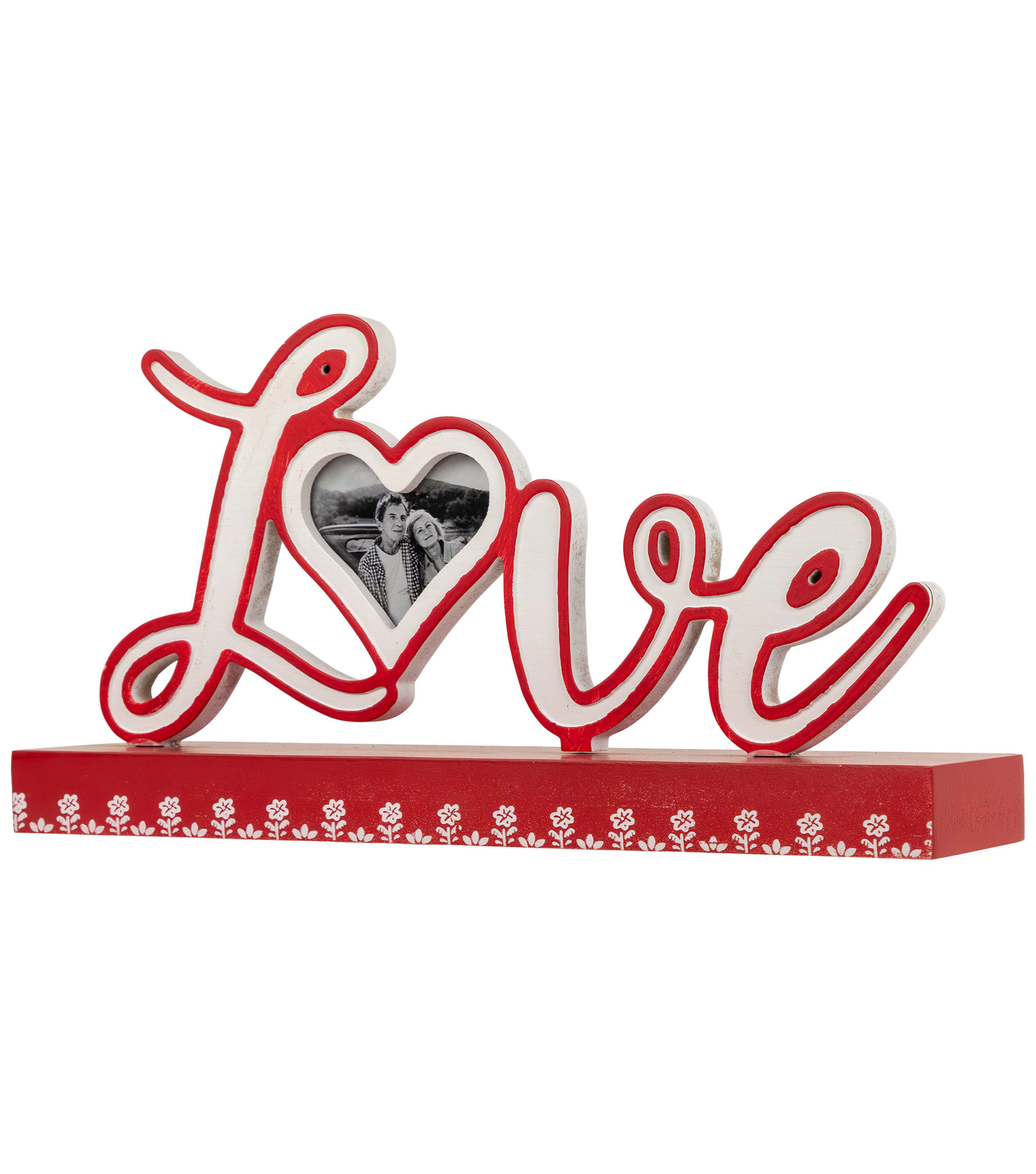 Add a touch of romance to your decor with the Northlight Love tabletop photo frame decoration. This piece features the word "Love" in elegantly cutout letters with the "o" cleverly designed as a heart-shaped photo frame. The vibrant red base is adorned with delicate white flower accents, making it a charming addition to your decor. Display your cherished memories with style in this heartwarming tabletop decoration.