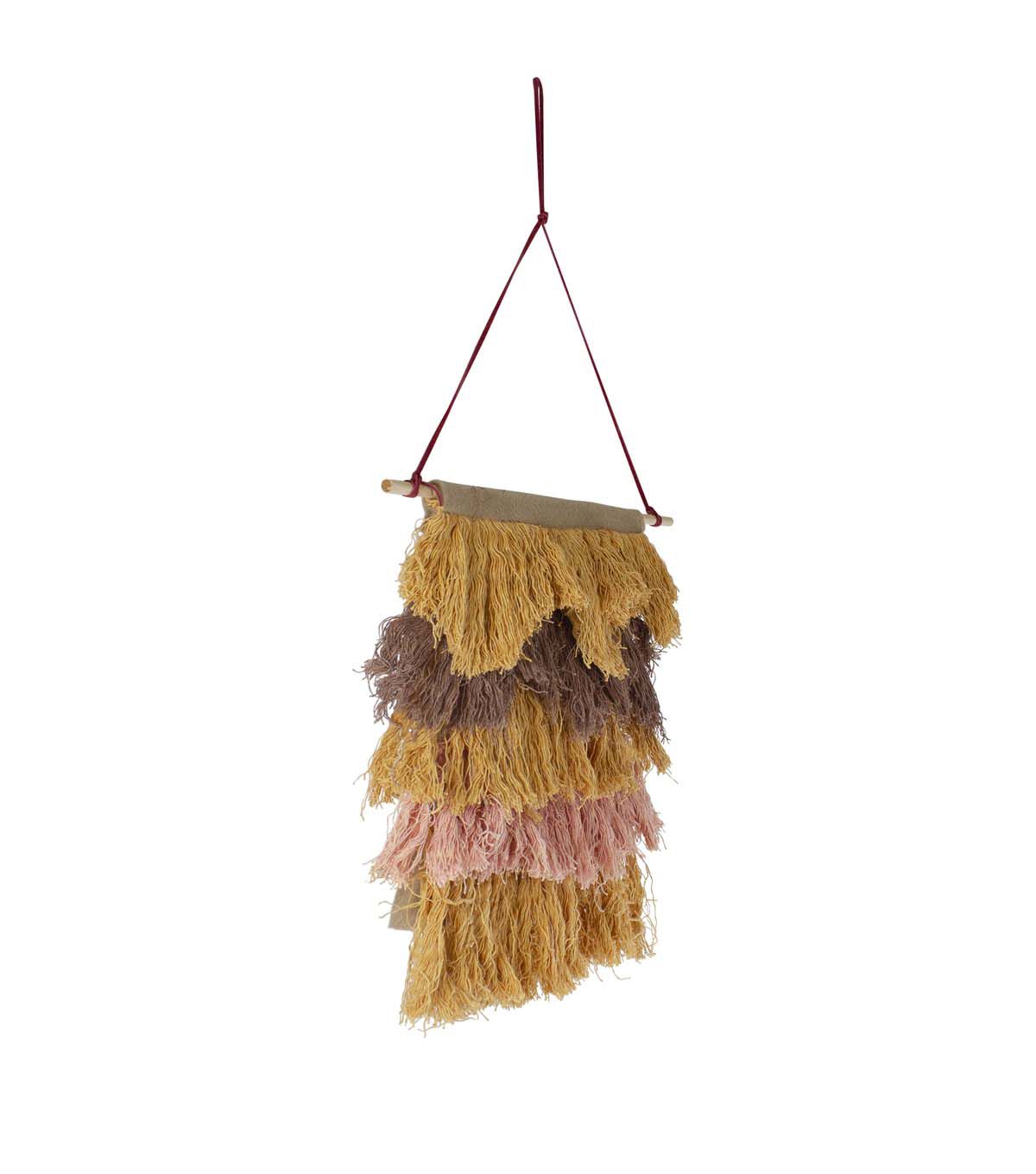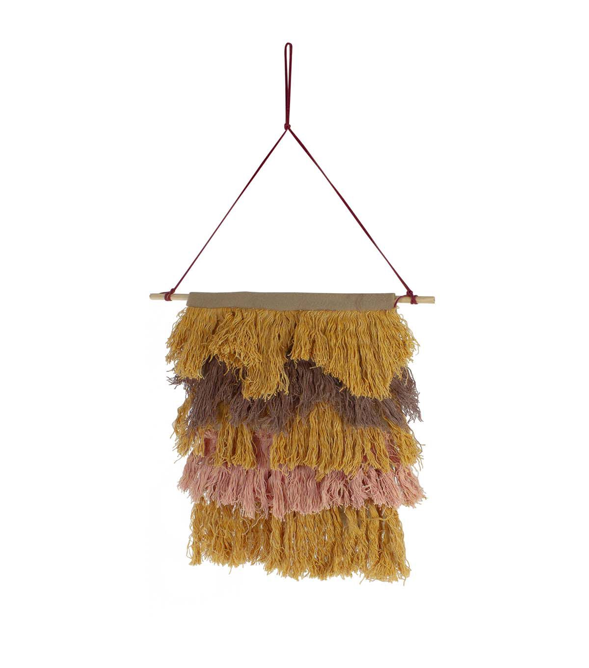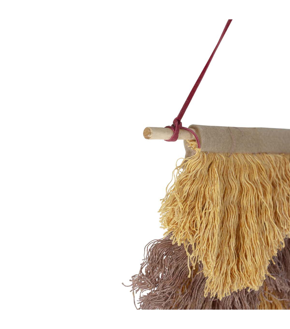 Layered strings of brown yellow and pink are sewn on a tan felt backdrop
