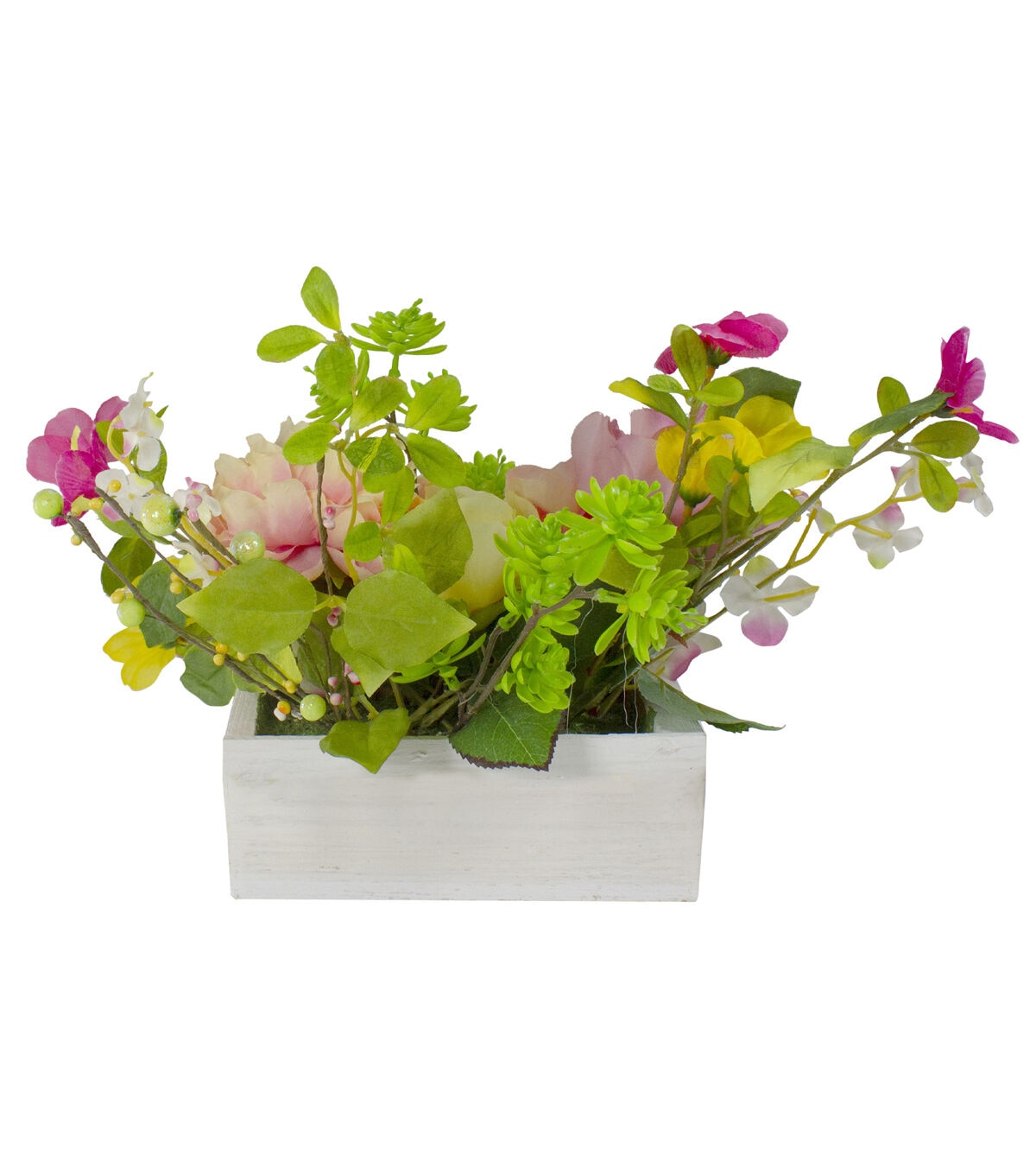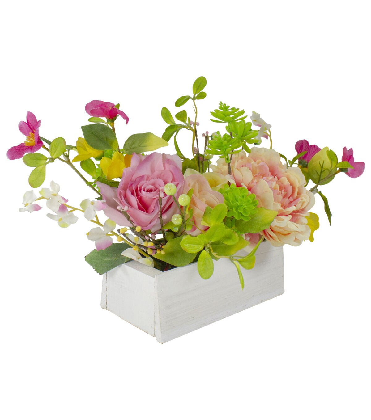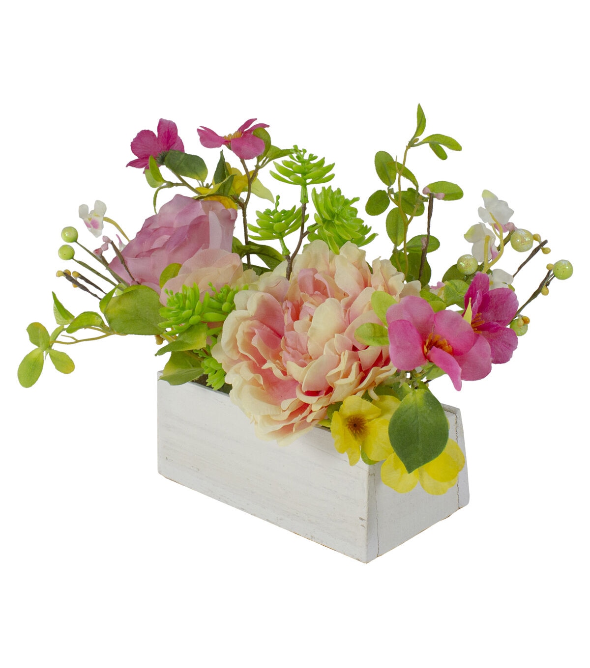 This rustic wood planter box adds a touch of nature with pops of color to your decor. This beautiful arrangement features a pink blush peony pink and yellow roses and realistic foliage. Place in your home or office or give as a long lasting gift to a loved one. Features: White wood planter floral and foliage box Designed with pink and yellow peony and roes flowers Accented with small white and pink flowers and a variety of green foliage Flowers are settled into a weathered white wooden planter box Small pink buds and green berries embellished with iridescent glitter Burlap bottom prevents scratches on surfaces Overall dimensions: 10"H x 14"W x 10"D Planter box: 3"H x 8.25"W x 4.5"D Material(s): polyester/plastic/wood/foam