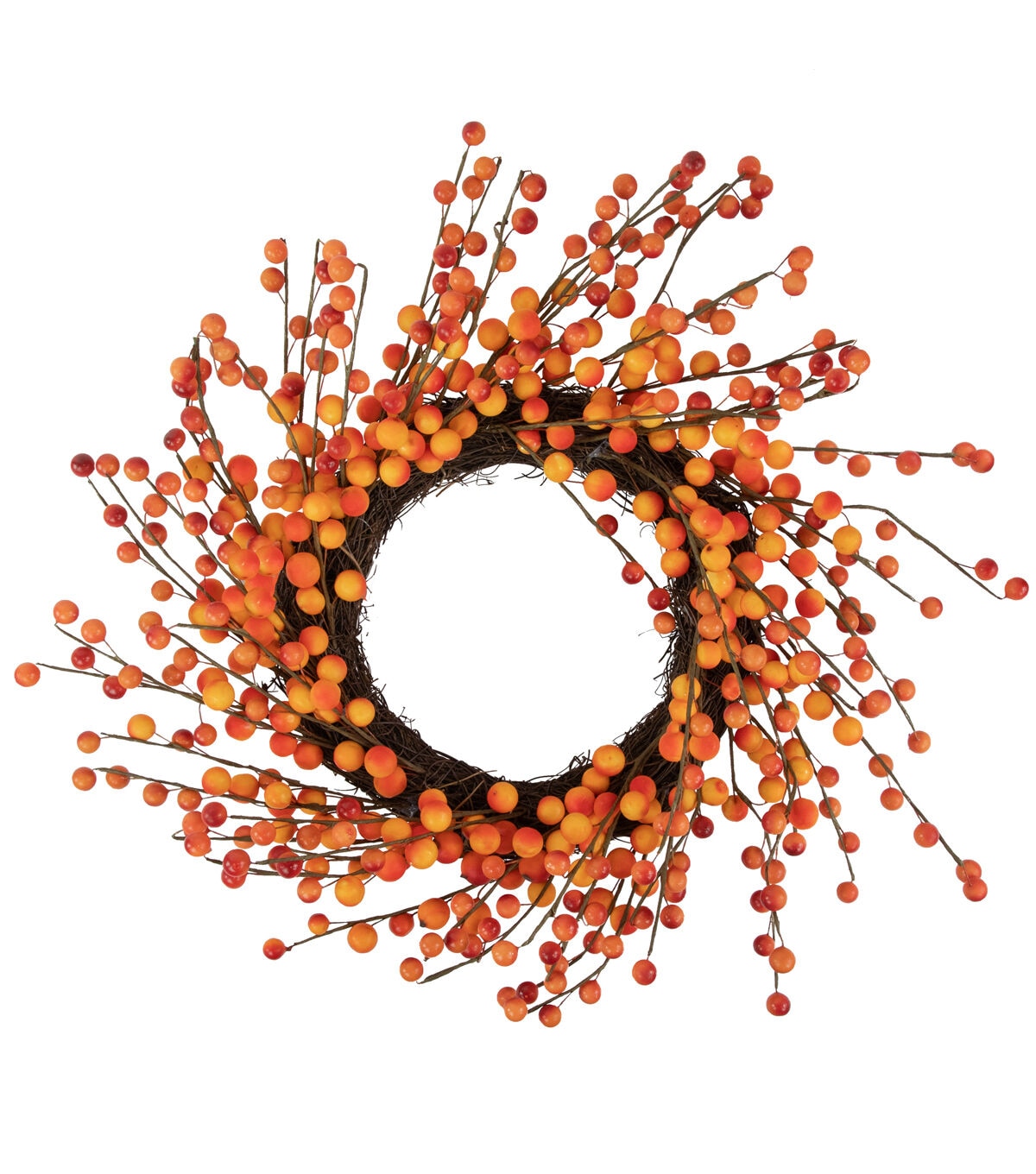 Capture the feeling of a crisp fall day with this beautiful autumn wreath. It features red and orange berries with a brown twig backing that will give a pop of color to your home décor. Display this vibrant wreath on doors walls windows or over your mantle.