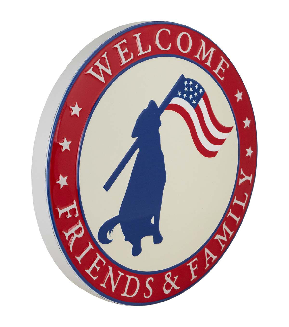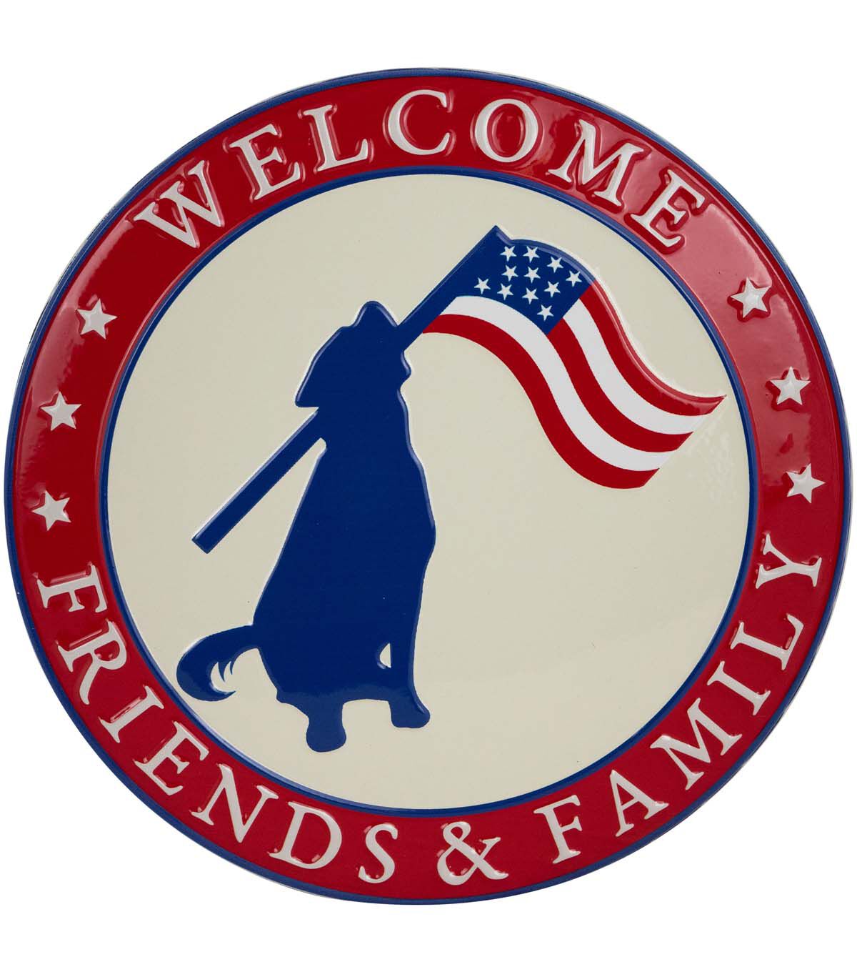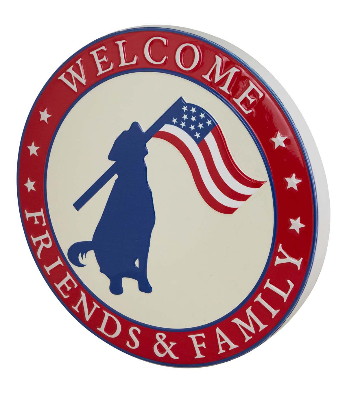 Welcome Friends and Family Patriotic Dog Metal Wall Sign - 13.75"