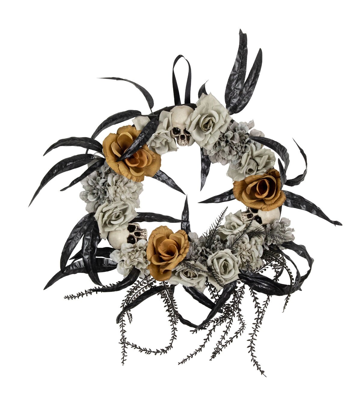 This horrifyingly chic wreath is the perfect addition to your Halloween decor. A beautiful arrangement of gray and orange roses is accompanied by 3 eerie skulls. Gray hydrangeas and black foliage are tucked in all the right places giving it a full look. Ideal for doors walls or as part of your terrifying holiday table centerpiece.