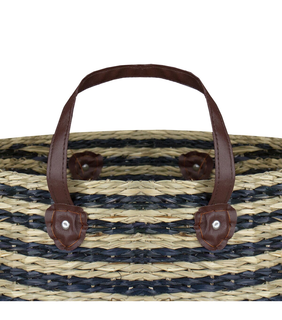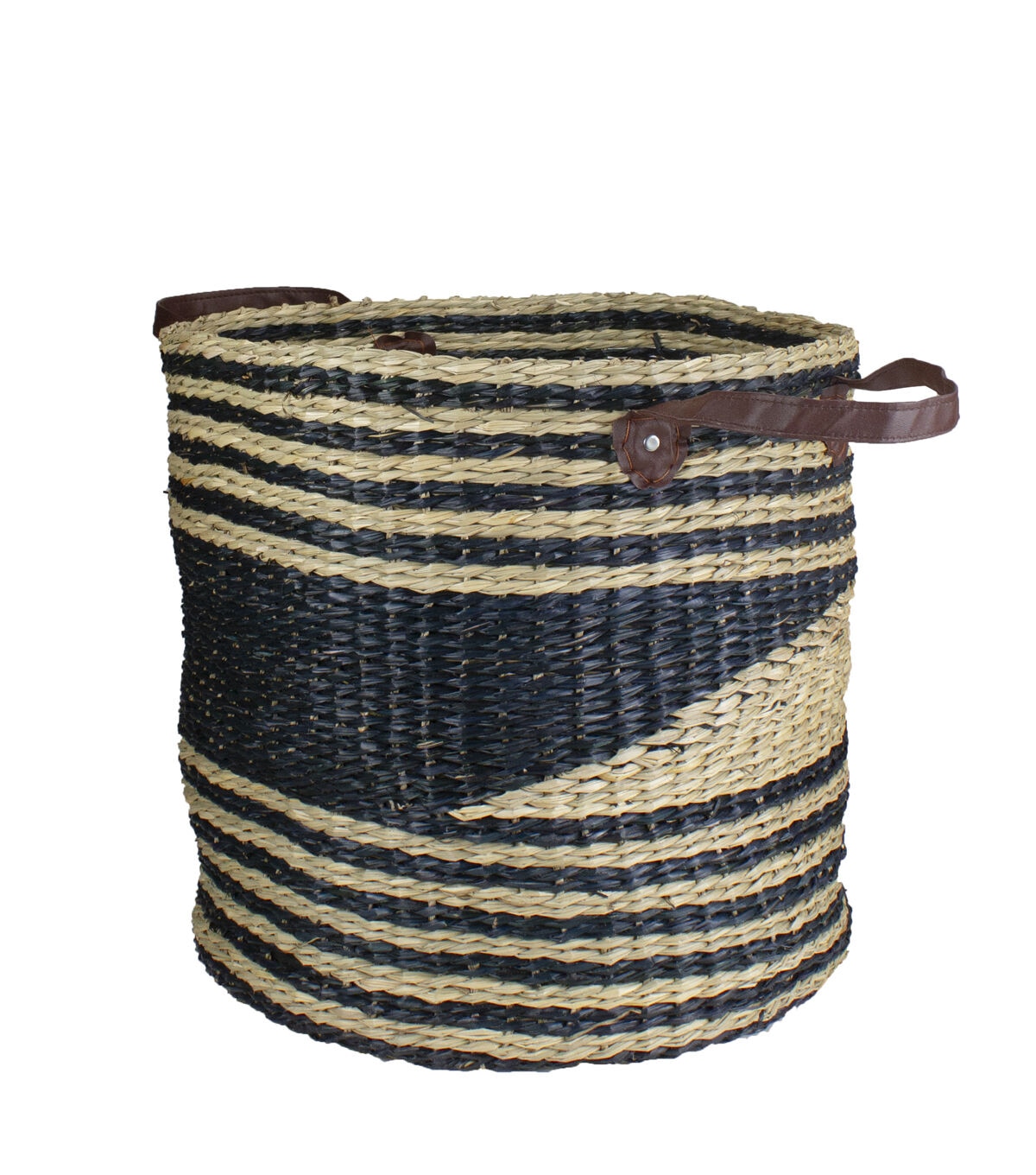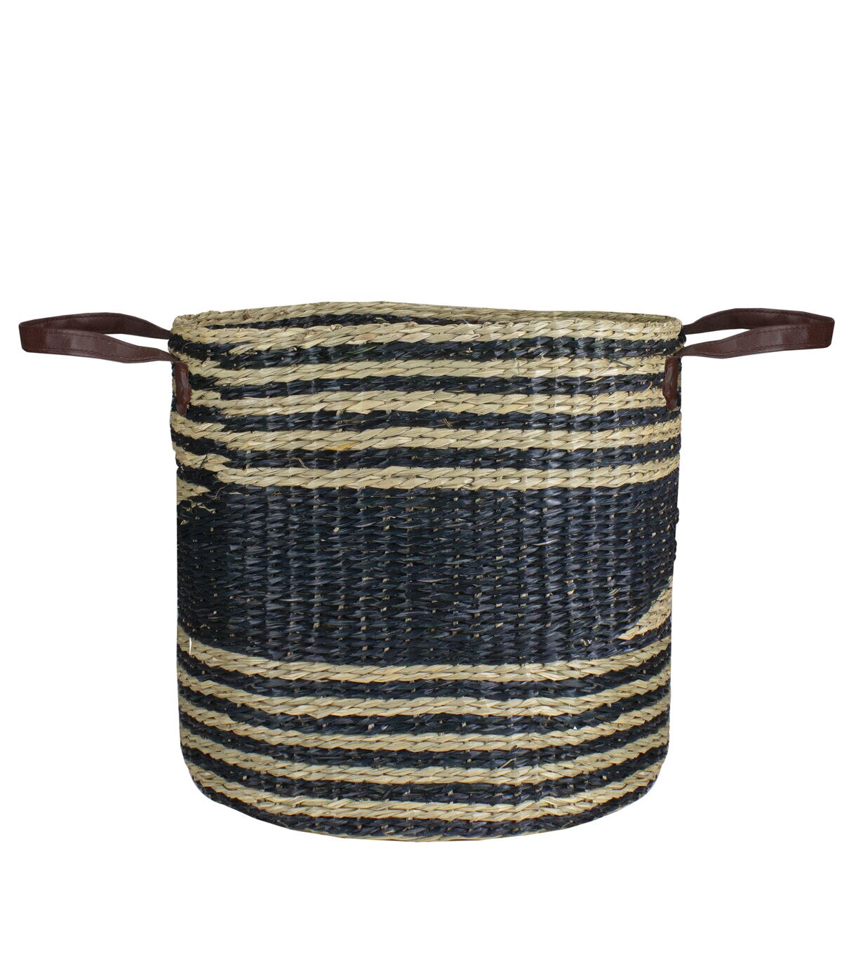 Add old-fashioned country charm to the home with this large woven basket with handles. This simple wicker style basket is wonderful in the living room or kitchen to add a rustic touch. It is great a functional piece to store blankets or to display as a simple accent piece by itself. Features: Wicker basket weave design Wide and over-sized basket Features large brown handles for easy carrying Beige in color with black accents Can hold various items Sturdy flat bottom Recommended for indoor use only Dimensions: Overall dimensions: 20" high x 16" diameter (including handles) Basket dimensions: 15" high x 16" diameter Material(s): seagrass/faux leather