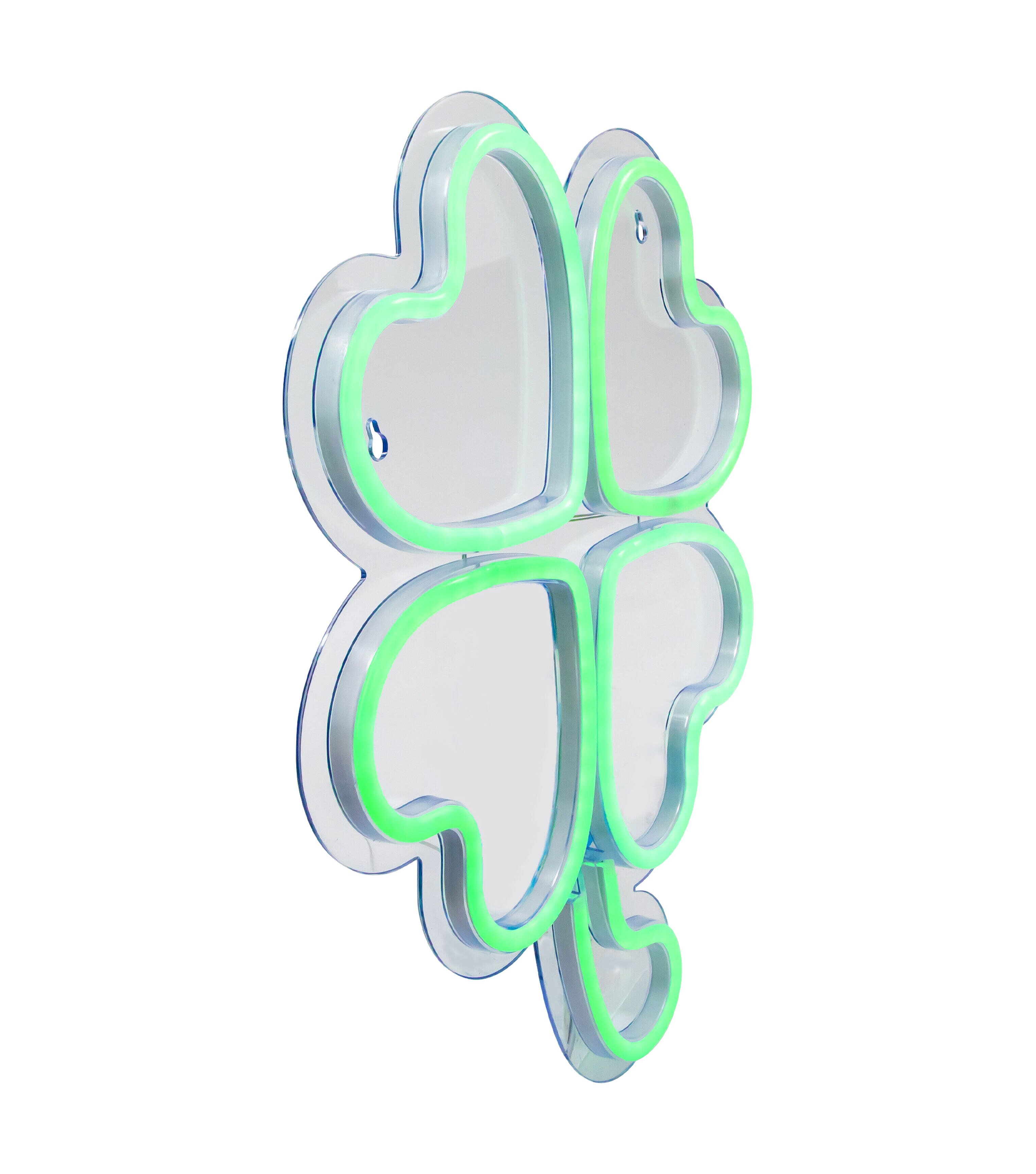 Freshen up your St. Patrick's Day decor with this modern neon style shamrock silhouette. Vibrant bulbs add light and color. The perfect statement piece for walls or windows. Easy installation makes holiday decorating a breeze.. Features: Color: green. One-sided design. Bulbs stay cool to the touch. LED lights use 90% less energy. 6ft lead cord. Product Features: Super bright and vibrant tubes. UL certified and approved for indoor use only. Cannot be connected together with other lighted items. Comes ready-to-hang from 2 keyholes on each side. 2 peel and stick hooks included. Class 2 power supply. Powered by USB - power plug included. Input: 100-240 volts 50/60 hertz.35 amps. Output: 5 volts 1 amps Dimensions: 15"H x 11"W x.75"D. Material(s): PVC/wire/metal
