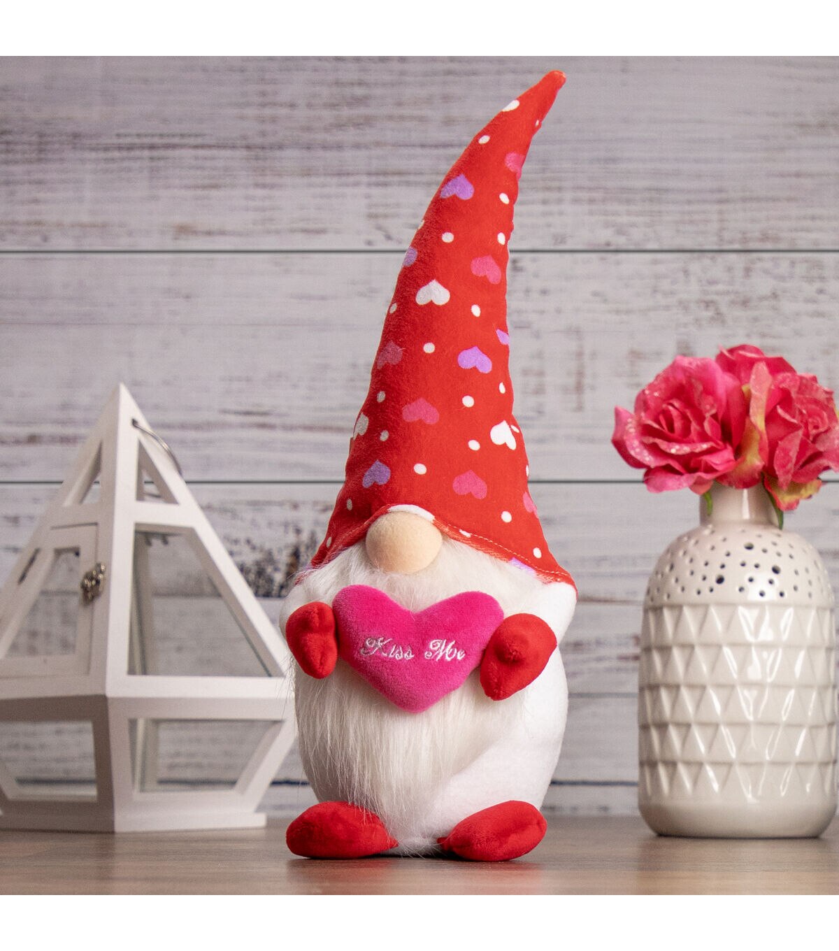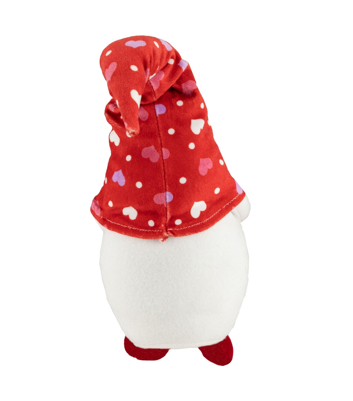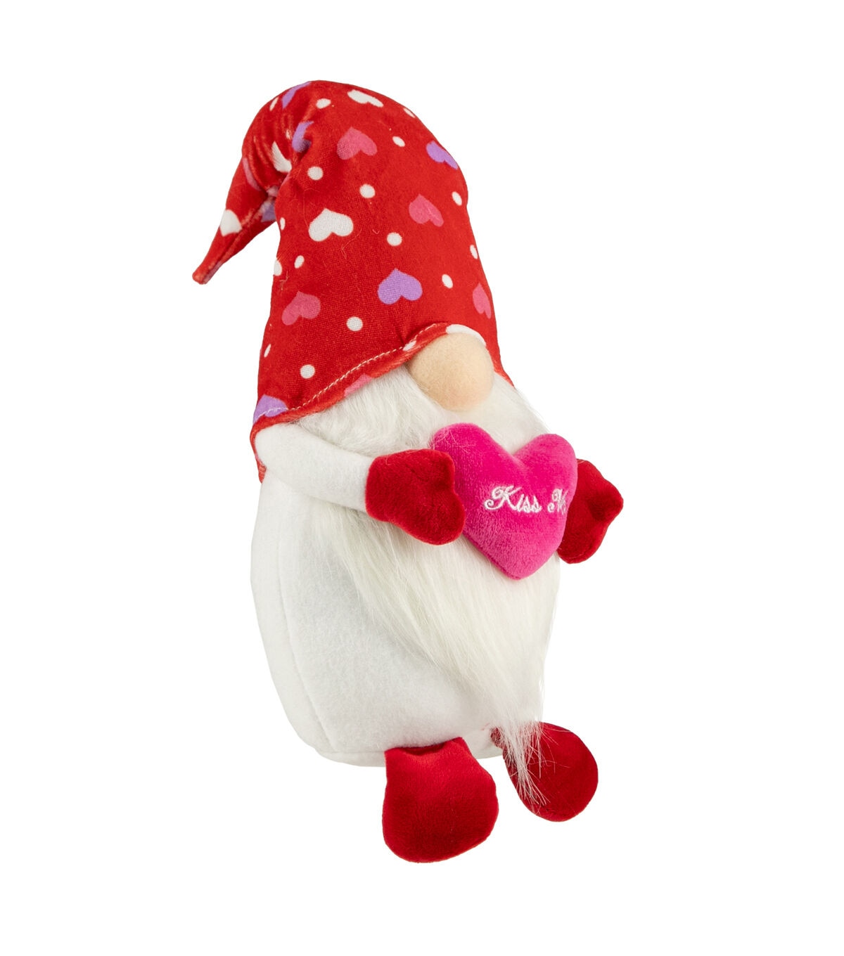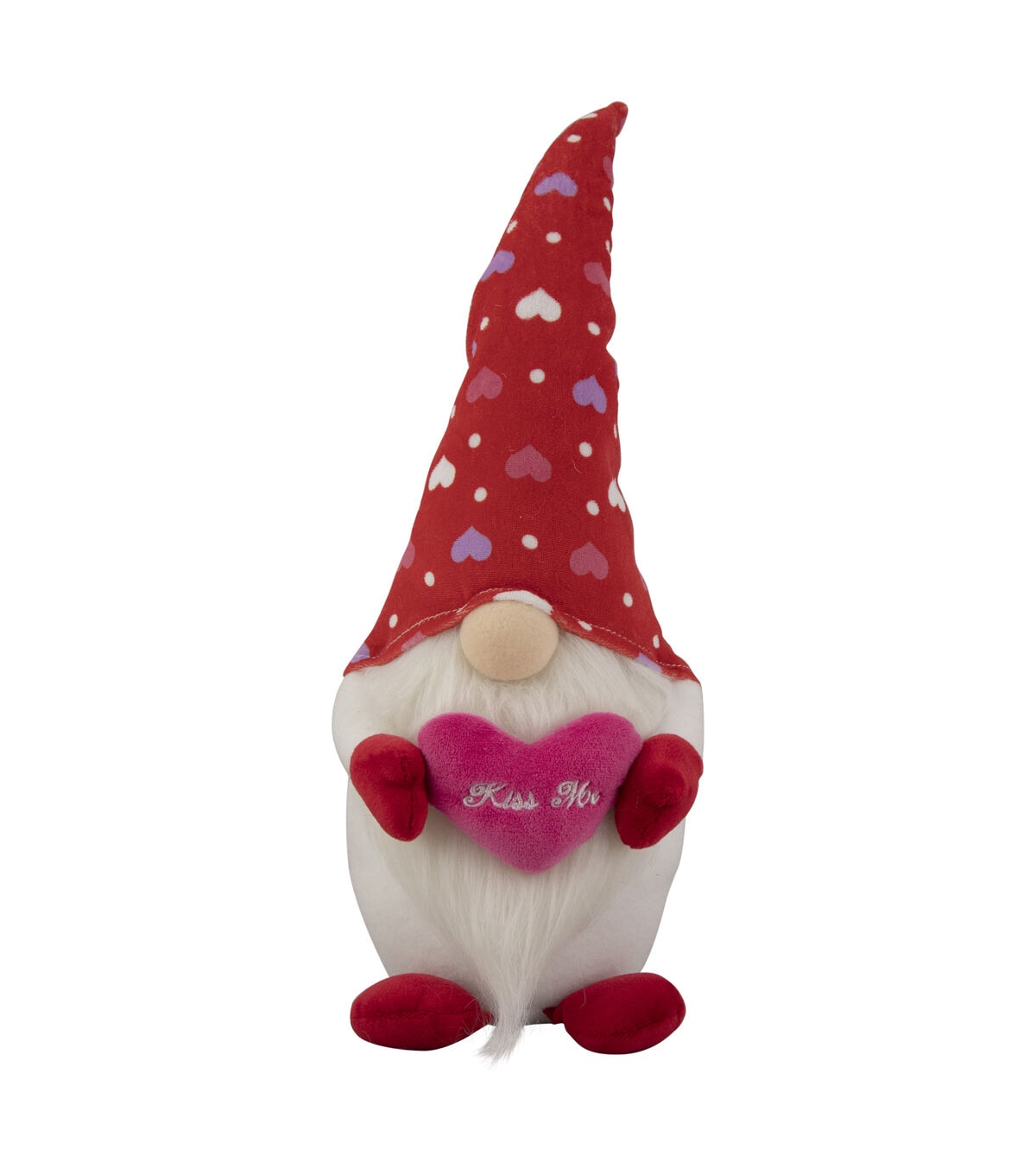Gnomes are best known for guarding Earthly treasures providing good luck and are perfect for protecting your goodies. This gnome is wearing a red hat with purple white and pink hearts and holds a pink hear that says kiss me. The gnome had the traditional long white beard with its bulbous nose poking out from under his hat. Place this gnome on your mantle or on any table of your choice for a fun festive touch. Product Features: Valentine's day gnome figure. Wears a large red hat with pink purple and white hearts. Hold a pink heart that reads 'kiss me'. Gnome has long white beard and bulbous nose. Weighted bottom keeps gnome steady. Recommended for indoor use only Dimensions: 16"H x 5.5"W x 5"D. Material(s): fabric/faux fur