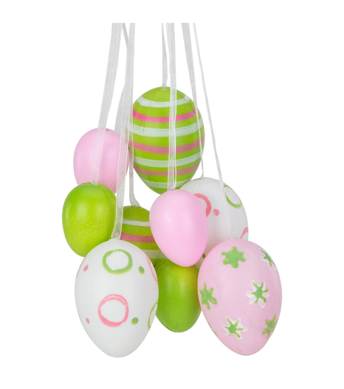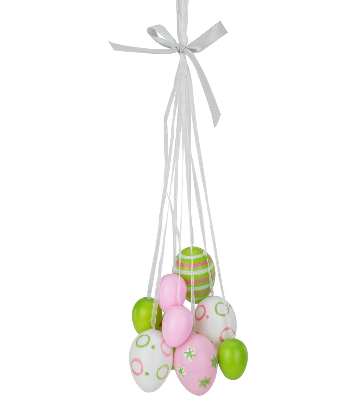 Spring into Easter with this cluster of pastel pink green and white Easter eggs. The eggs feature decorative stripes polka dots and floral-painted designs. The top of the Easter egg cluster is accented with a white satin ribbon bow so it comes ready to hang. Create a unique centerpiece while leaving table space open for all of your holiday treats. Features: Features a cluster of pastel pink green and white Easter eggs. Eggs feature decorative stripes polka dot and floral painted designs. Comes ready-to-hang on a satin ribbon. Recommended for indoor use only Dimensions: 11.75"H x 4"W x 3"D. Material(s): plastic