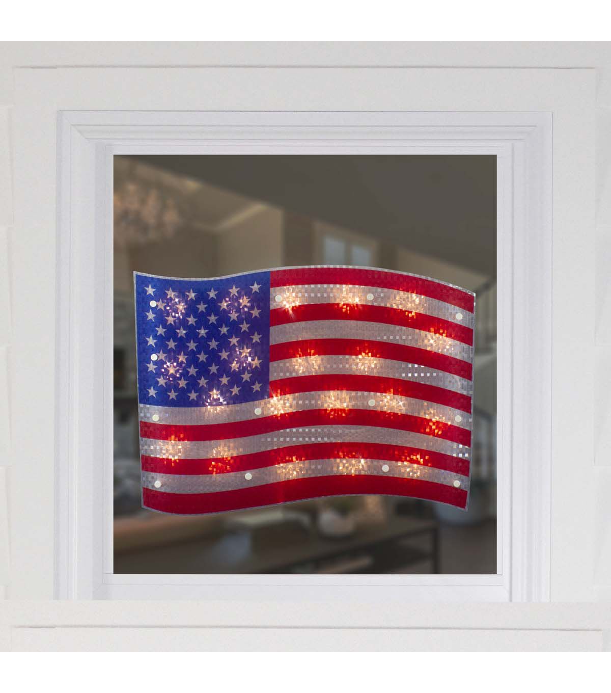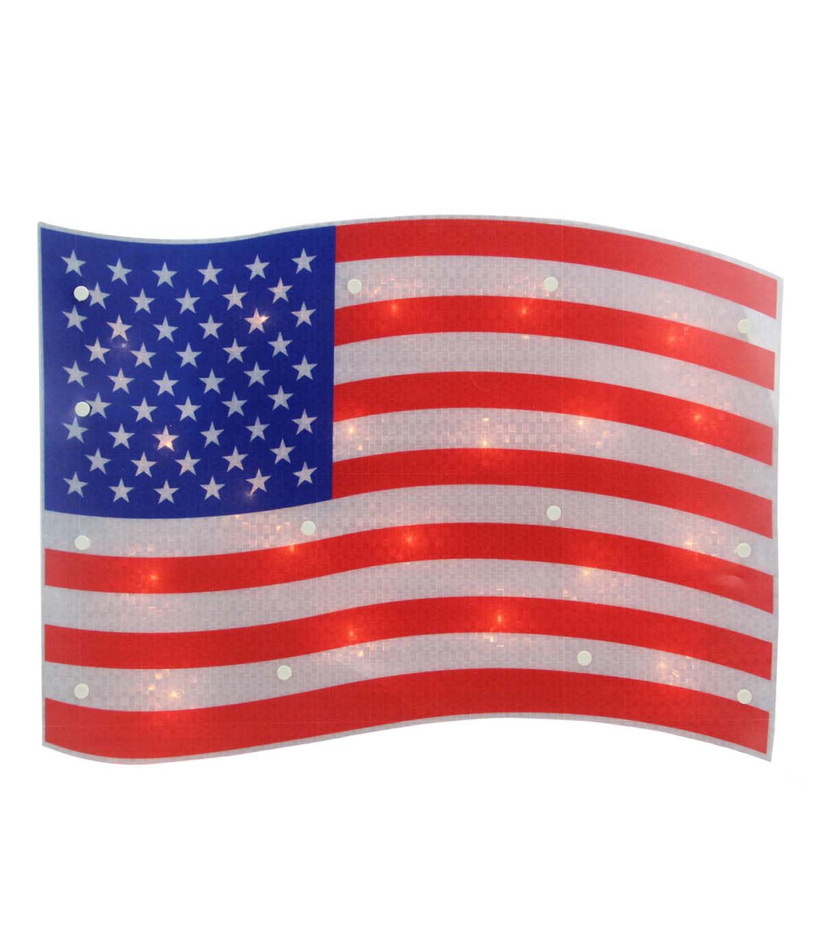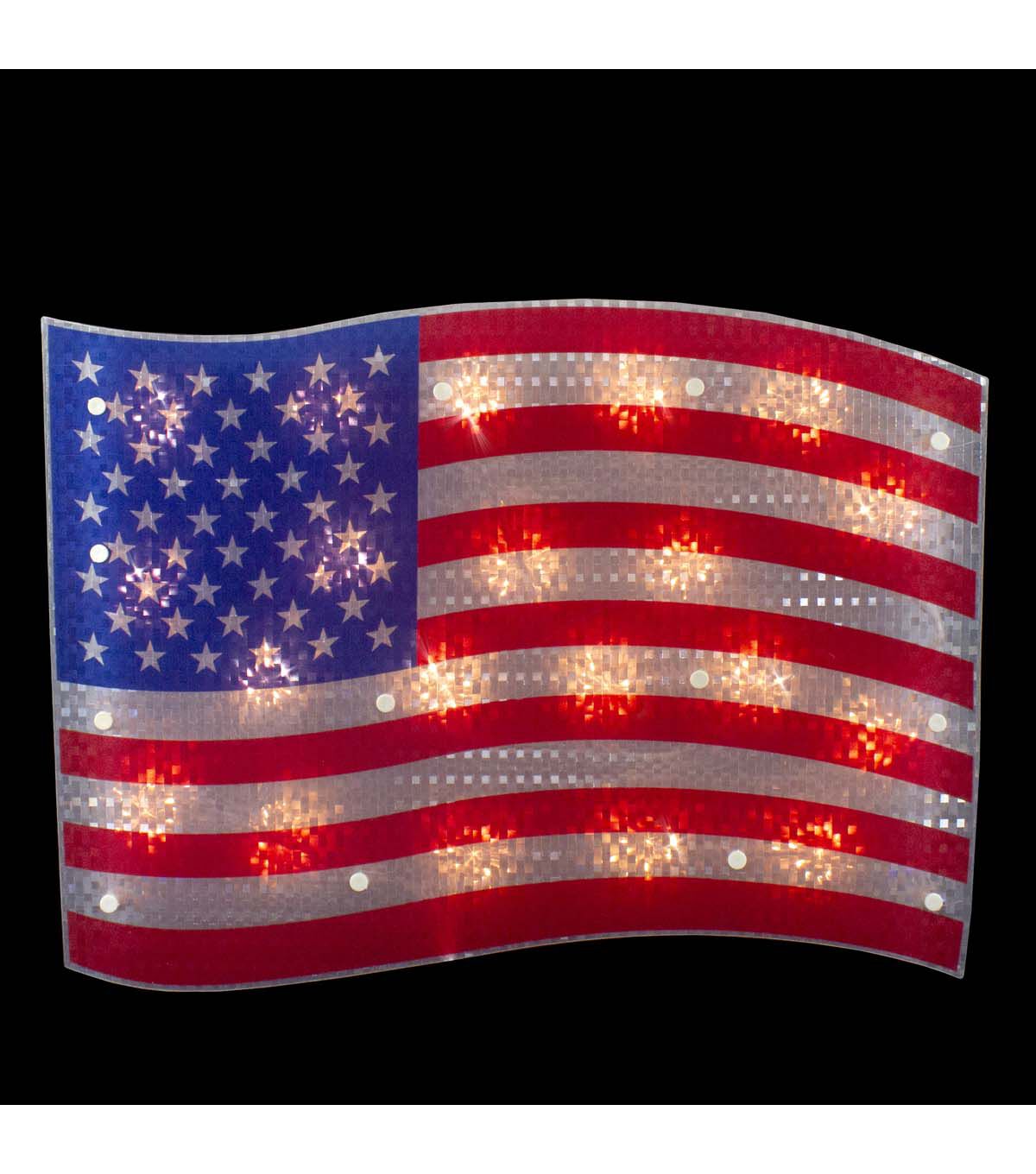 Display your patriotism with our 4th of July American flag decoration. The flag itself is a unique holographic red white and blue and pre-lit by 20 clear lights. It includes a suction cup and is ready for hanging. If one of the bulbs burns out the rest will stay lit. Also perfect for your Memorial Day and Labor Day parties.