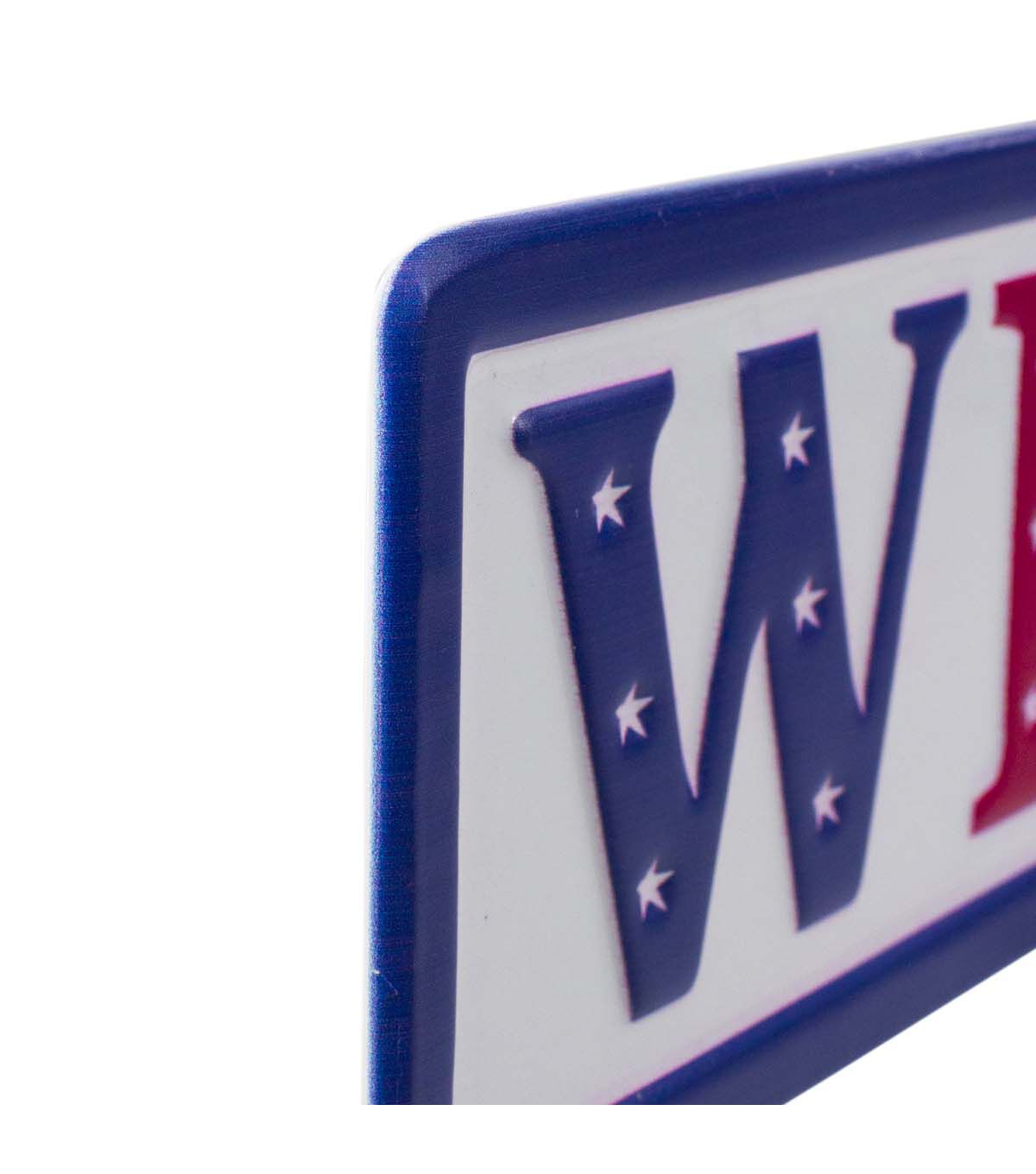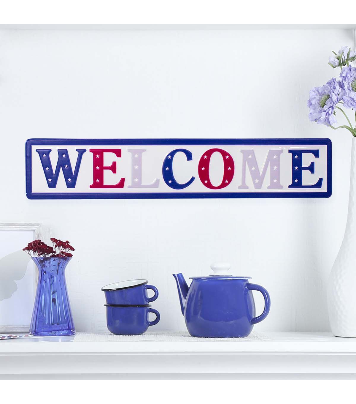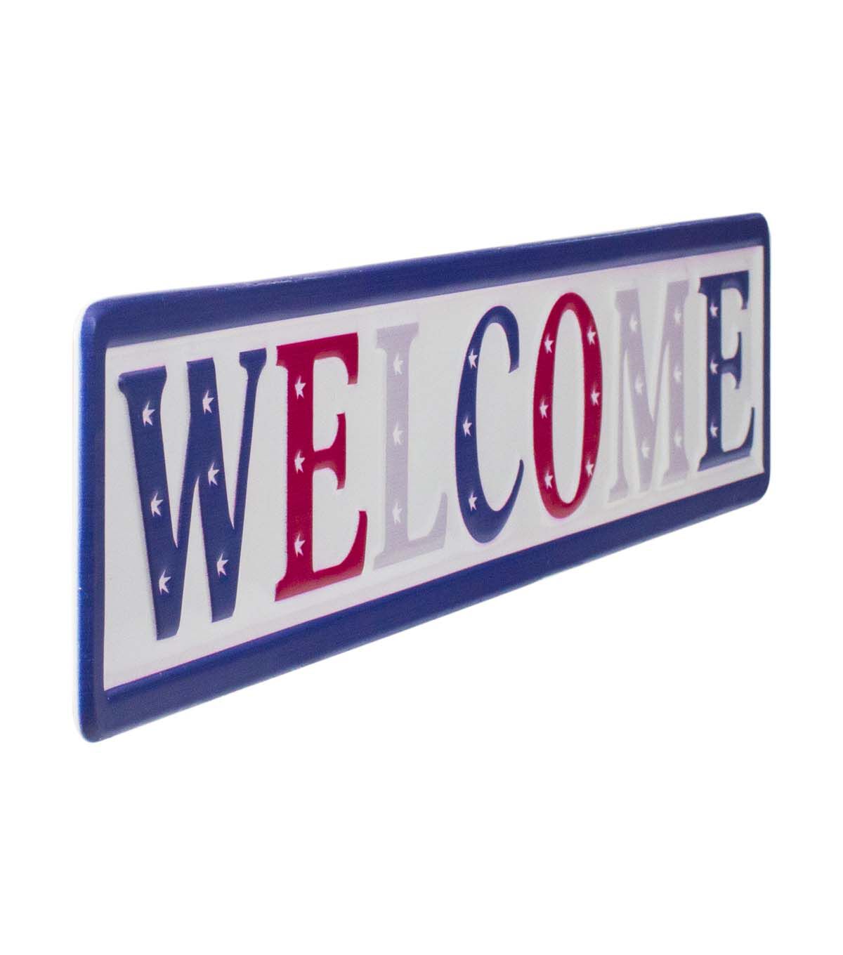 Show off your patriotic style this season and greet your guests with this "WELCOME" wall plaque. Featuring the phrase "WELCOME" in red white gray and blue this metal wall plaque will fit perfectly into your holiday decor. It also makes a perfect gift for your family and friends.