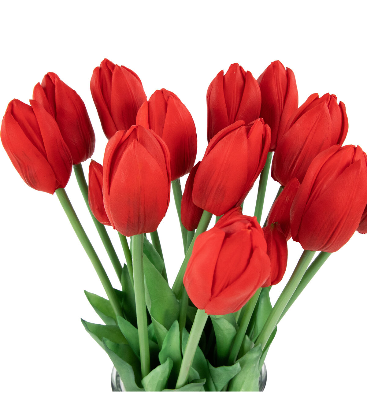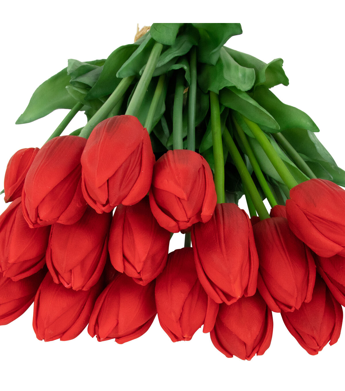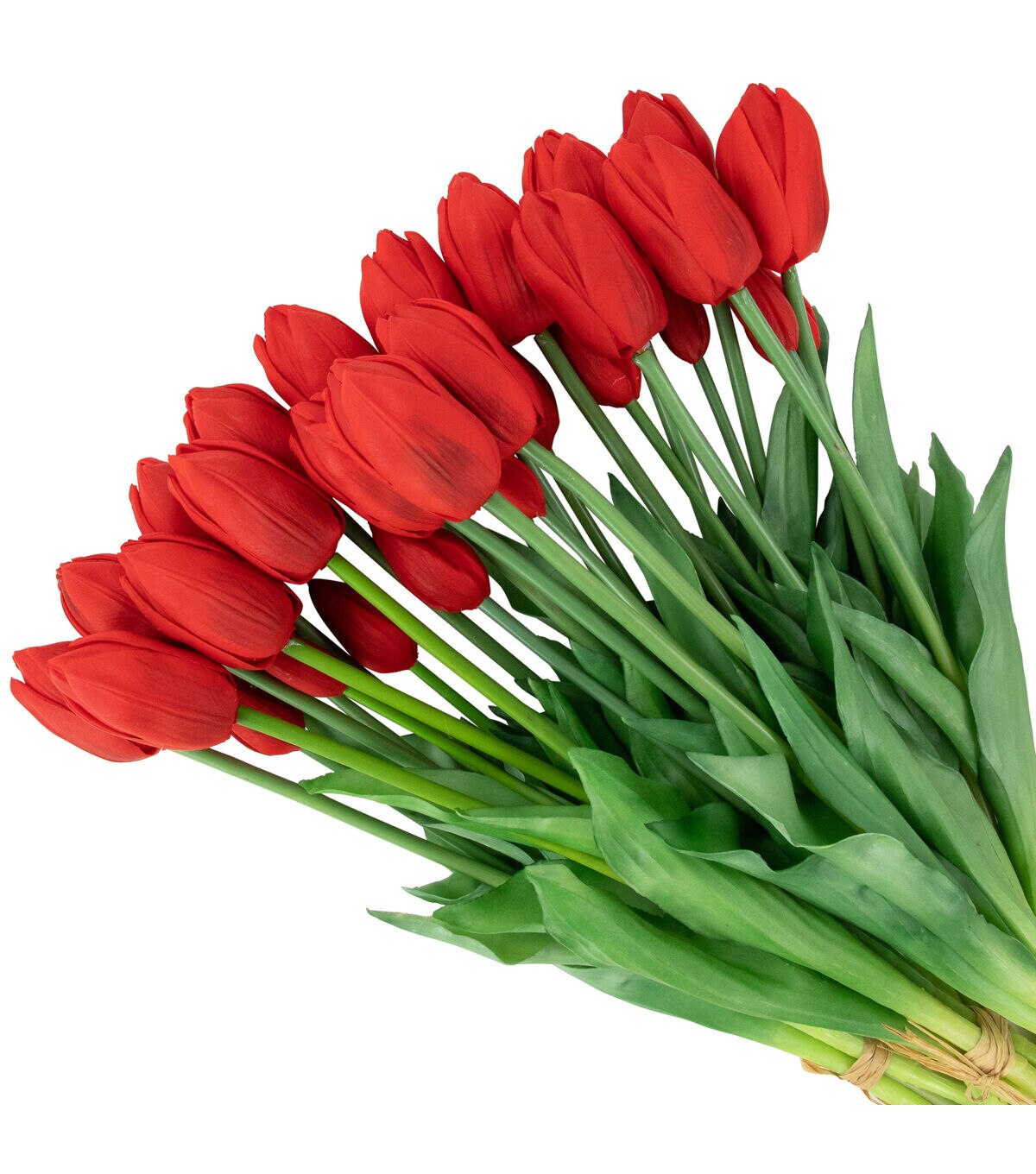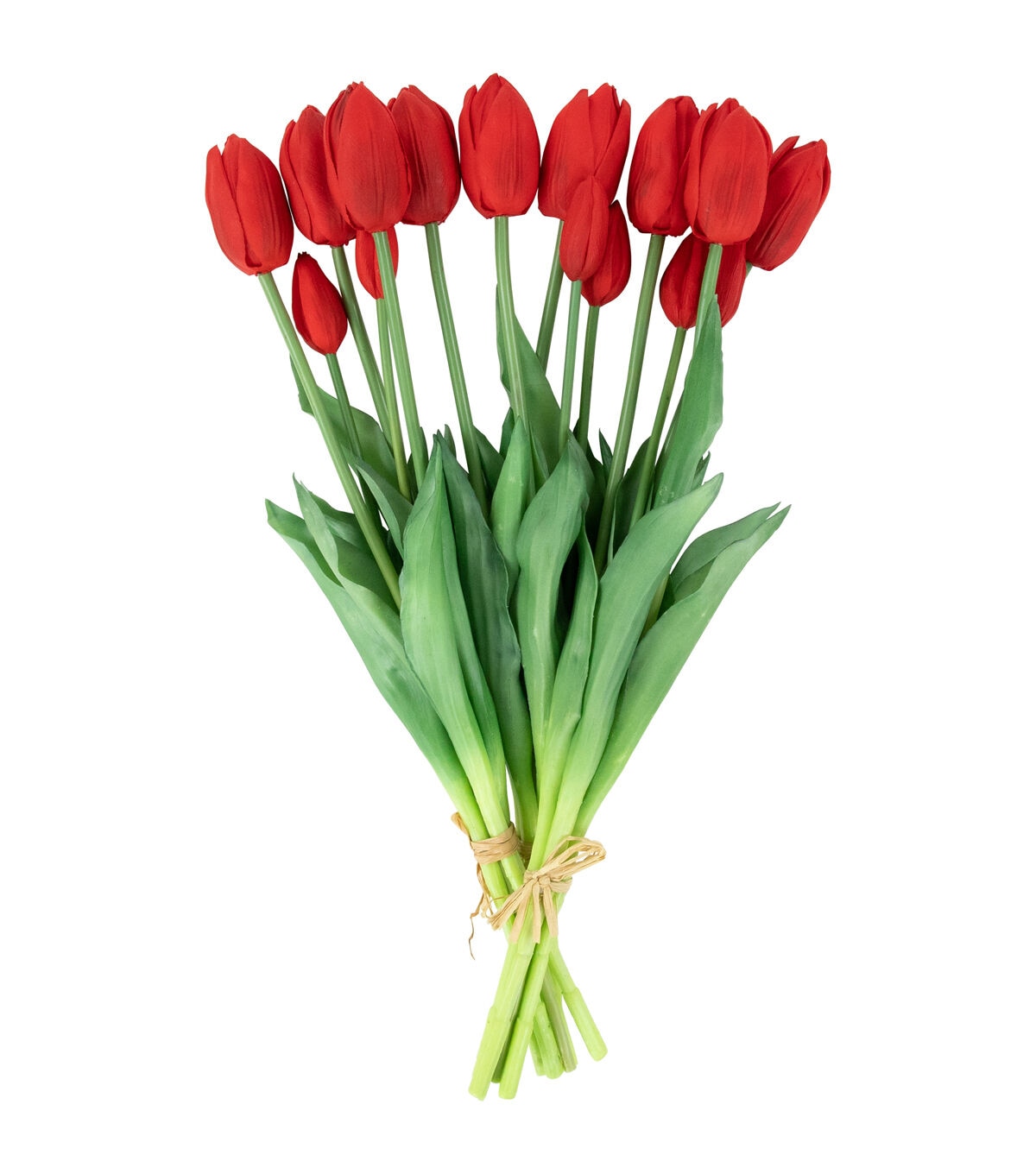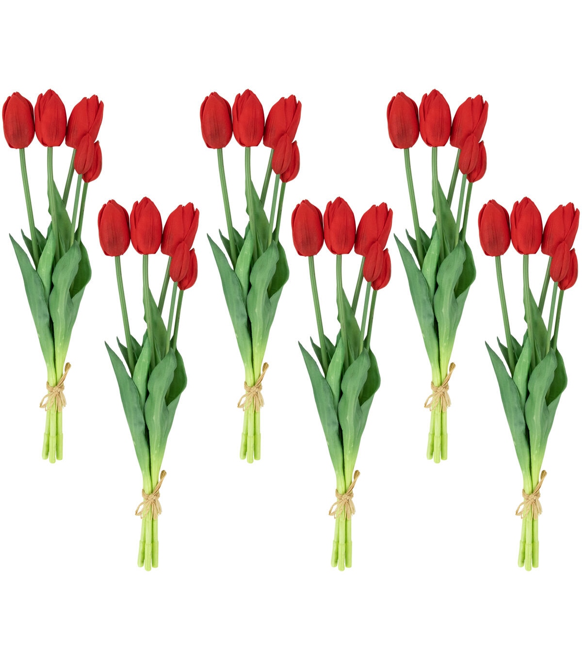 Create the perfect Easter centerpiece with these bundles of red faux tulips. These highly realistic flower bundles will add just the right touch of color to your Spring decor. Each bundle of 5 tulips are wrapped in a jute cord that is secured nicely in a bow. These lifelike tulips are perfect alone in a vase or add them to your floral arrangement for depth and dimension.