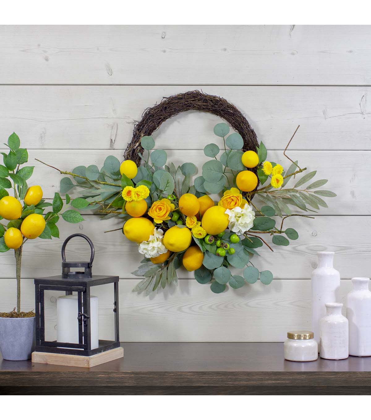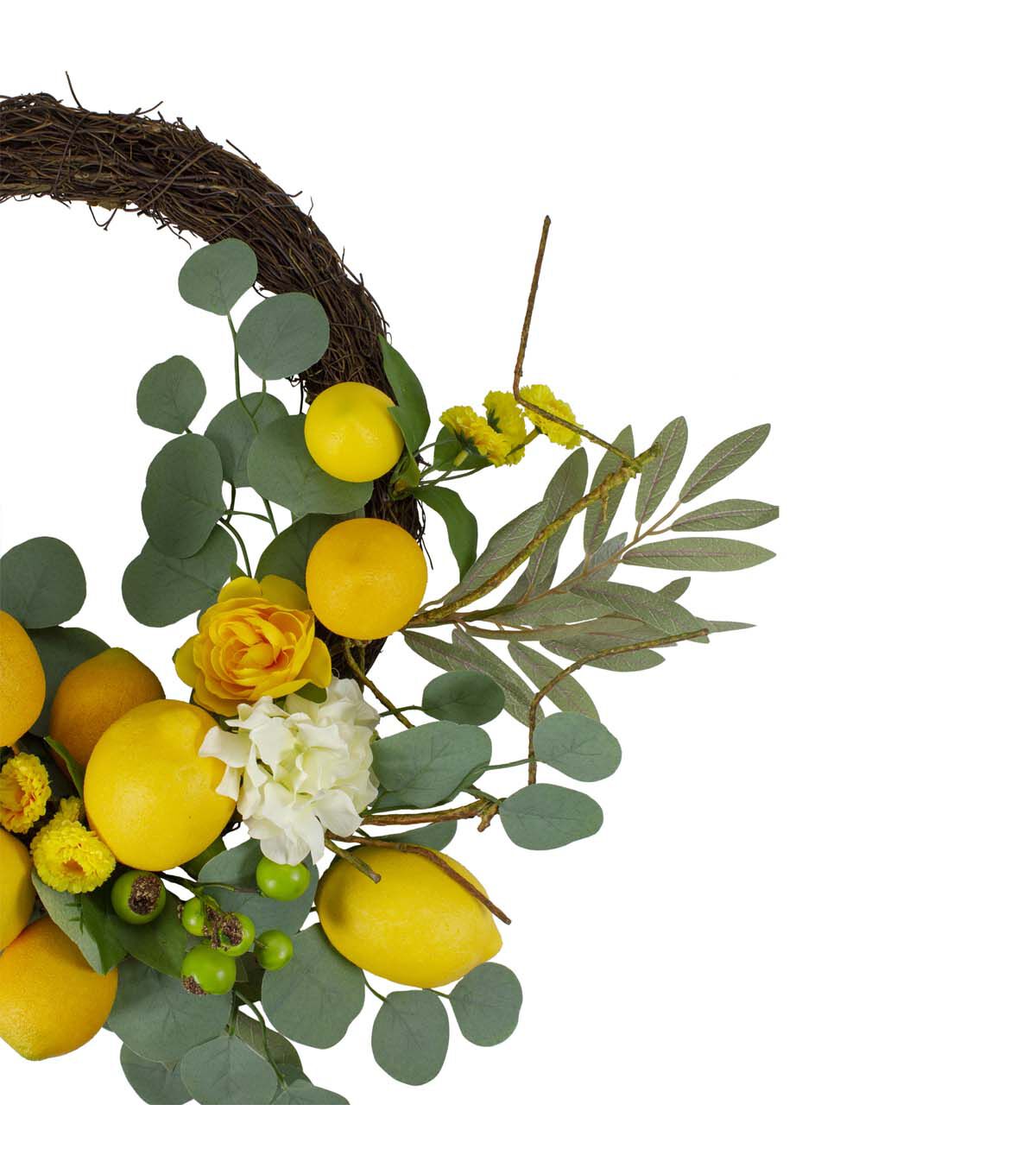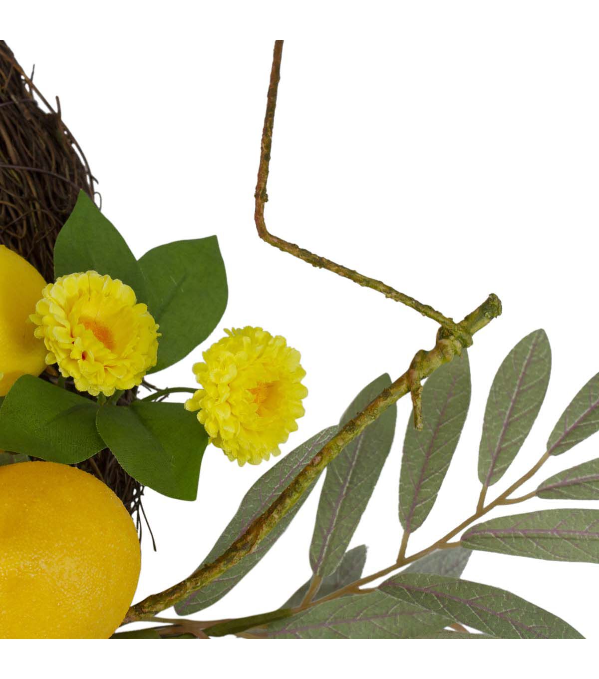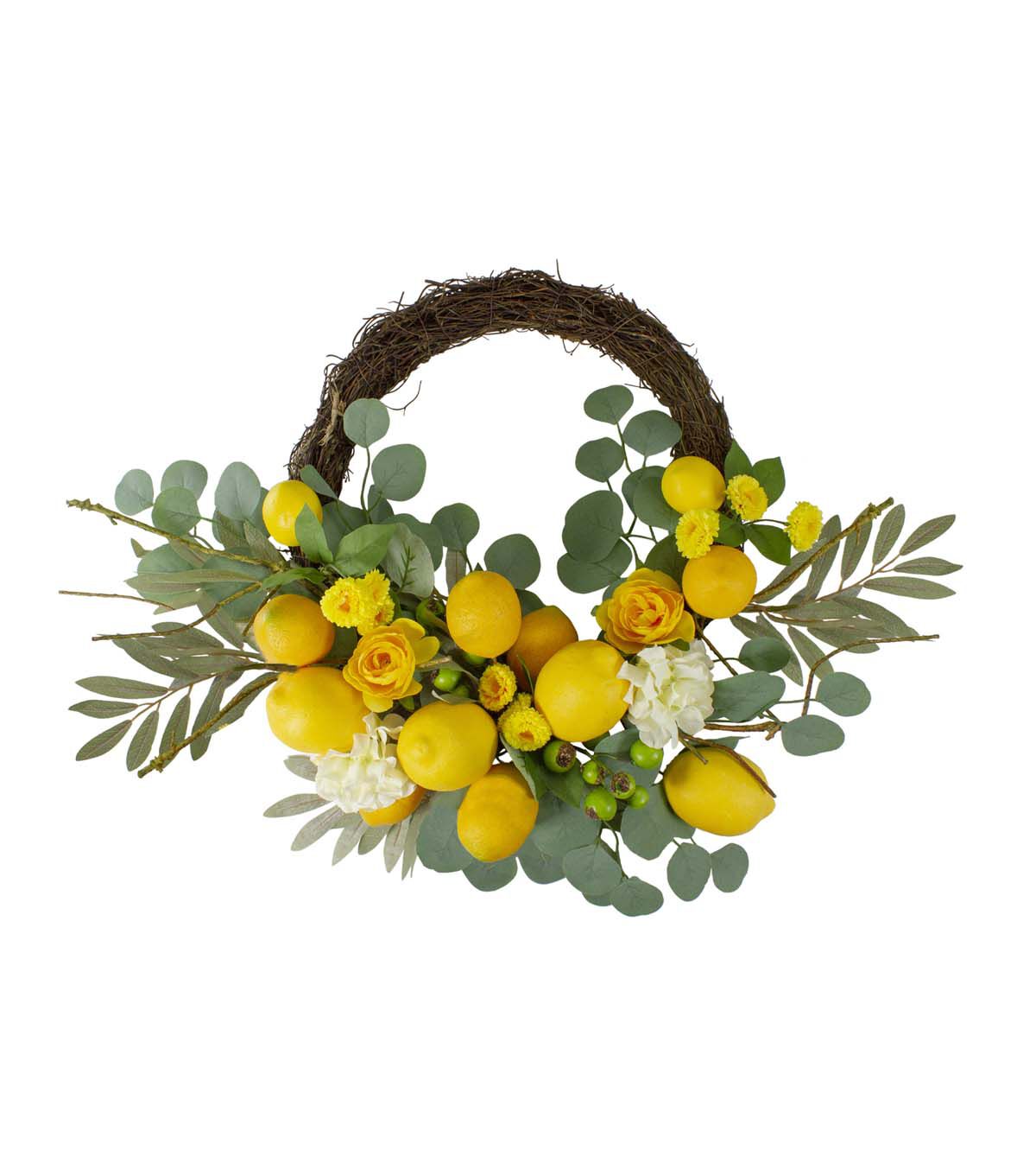 Add a refreshing twist to your spring decor with this semi citrus wreath. Realistic lemons are arranged on a circular twig grapevine. Hydrangeas and crab apples are nestled in the lush green foliage. Hang anywhere in your home or office for an instant pop of color.