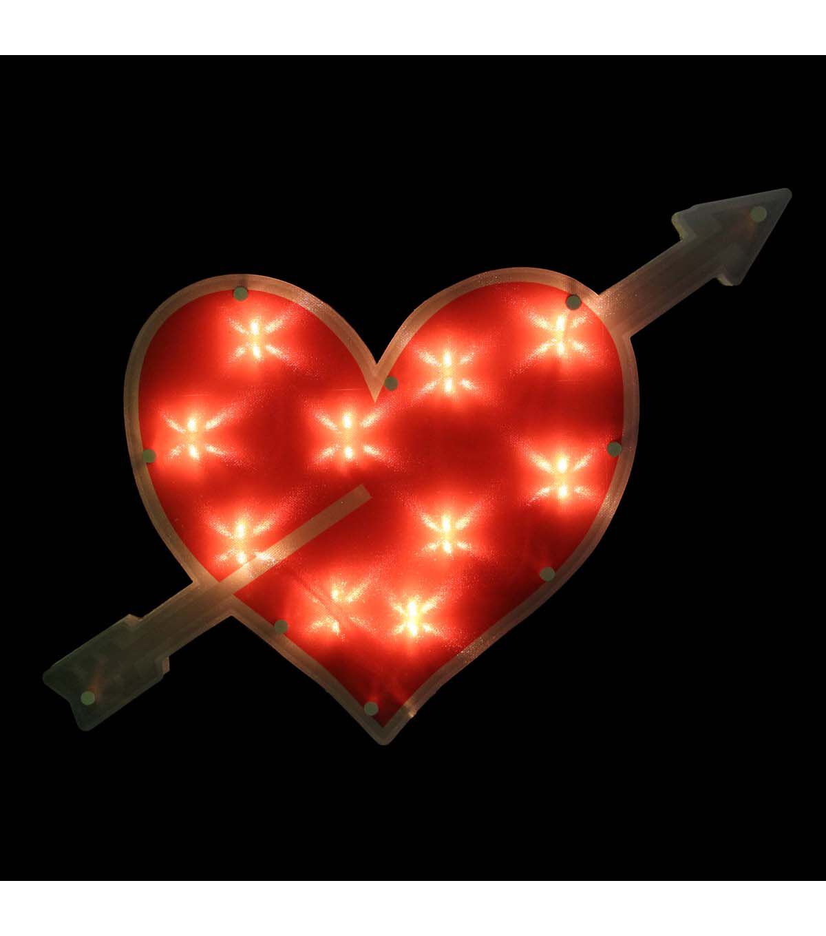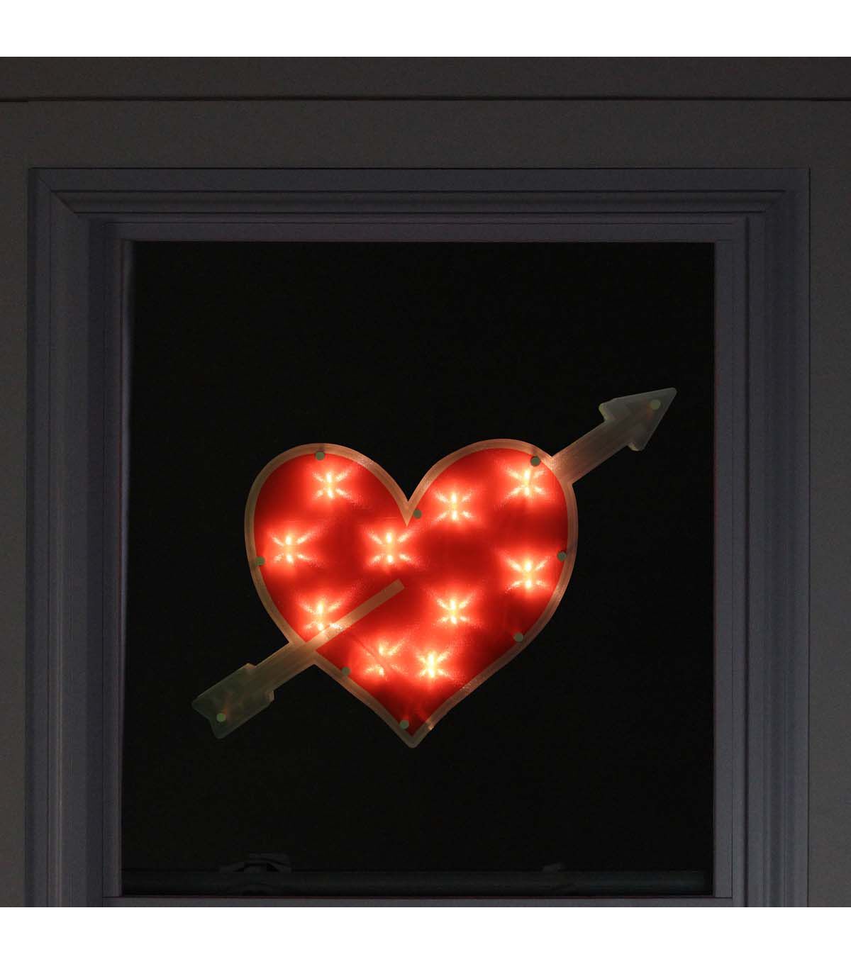 Northlight's 18" Pre-Lit Red Heart With Arrow comes with 10 clear mini bulbs on a white wire, and a 25" white lead cord. The one-sided design makes it easy to hang on any surface. Plus, it's fully assembled and comes with replacement bulbs and a spare fuse. The suction cup included allows for easy installation, and the UL certification ensures that it's safe to use both indoors and outdoors.