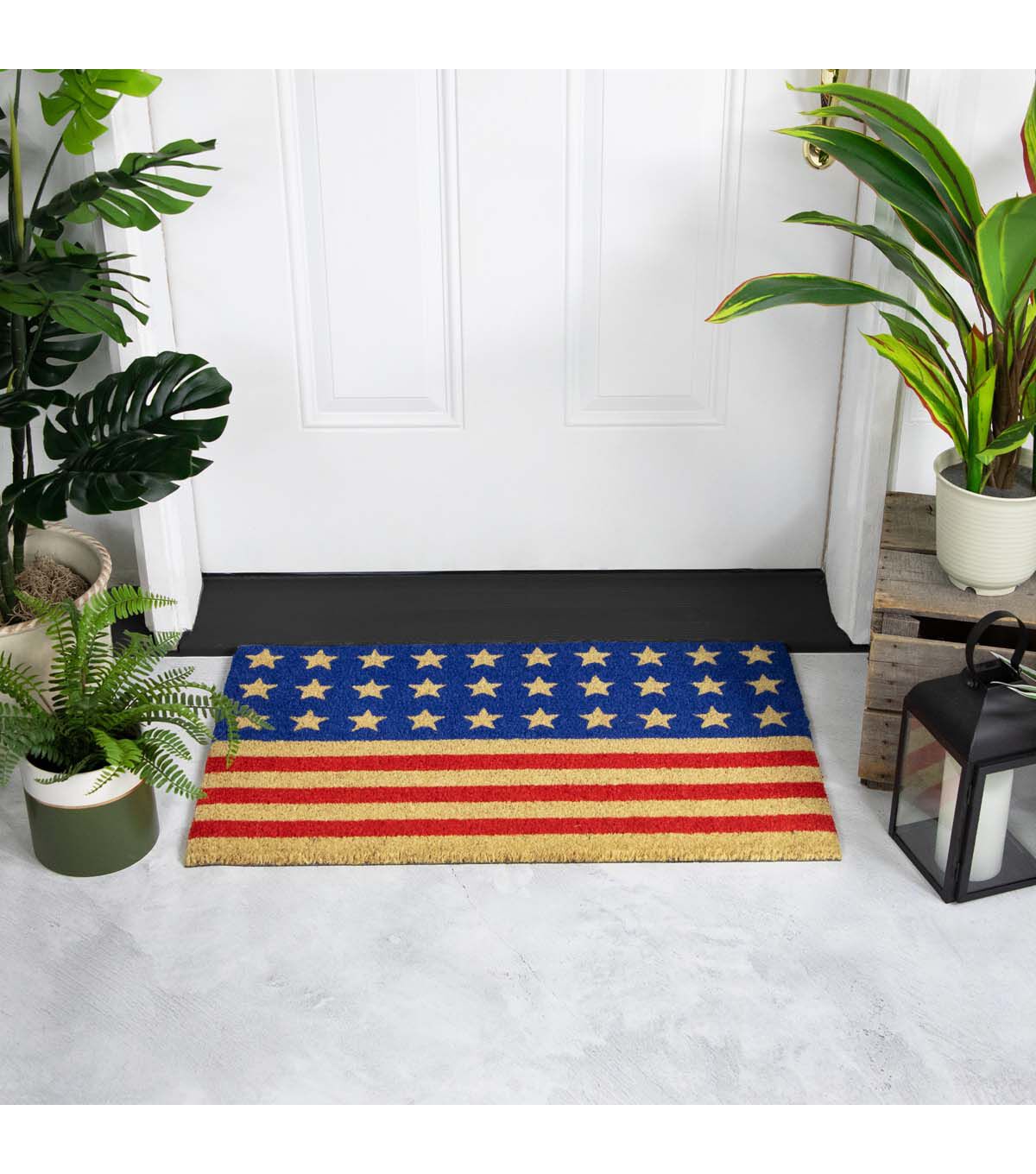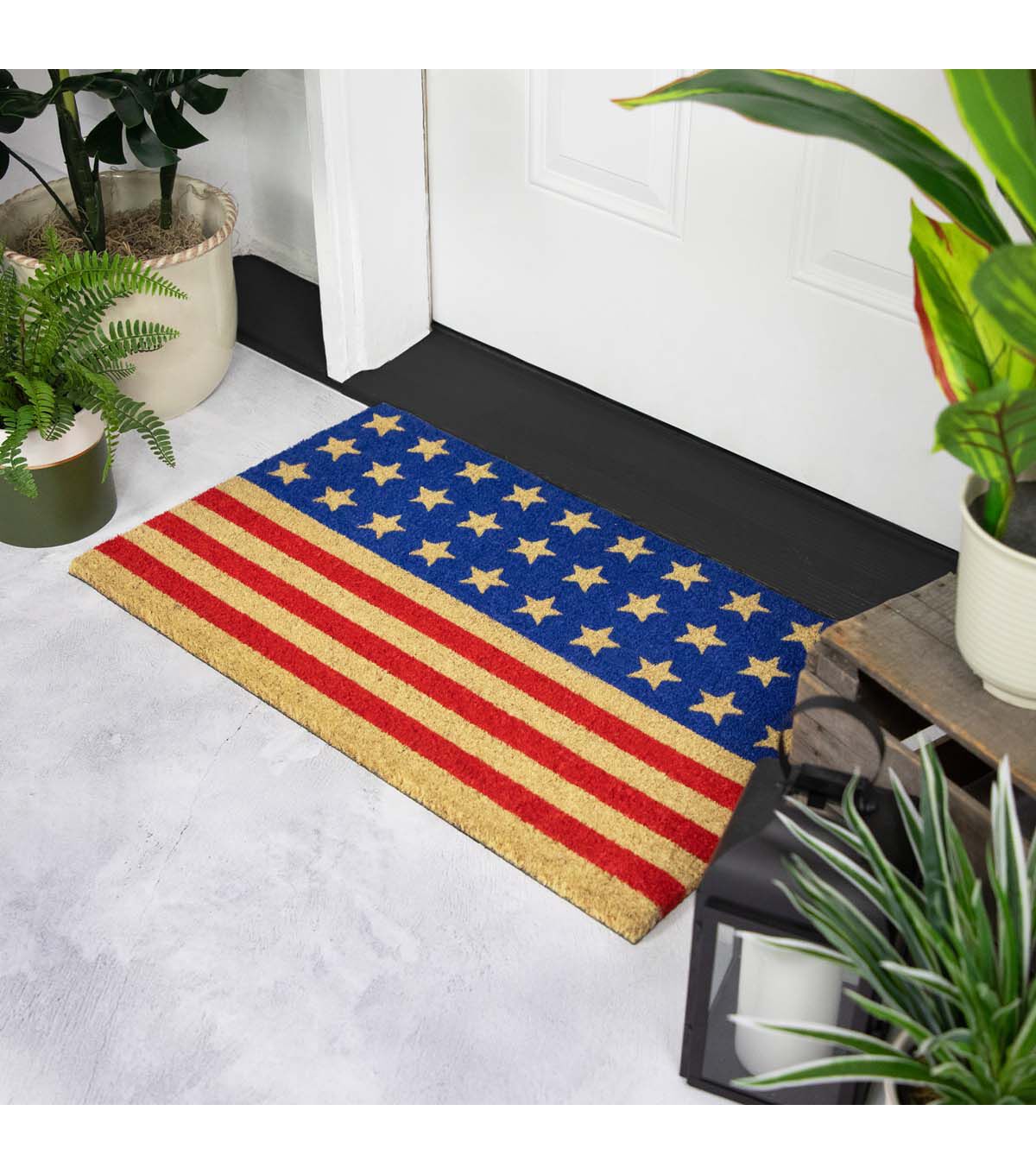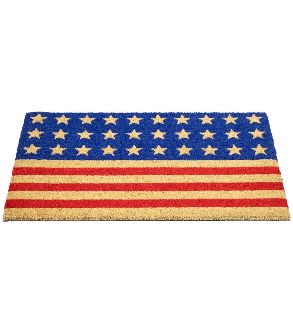 Welcome guests to your home with this stars and stripes outdoor doormat a perfect way to show off your patriotism this summer! This eye-catching doormat features a vibrant American flag inspired design in classic red and blue. Featuring bold stars and stripes that will make a statement at your doorstep. Made from durable coir this outdoor doormat will withstand heavy foot traffic and the elements making it perfect for displaying for the 4th of July Memorial Day or all year long to show love and honor for your country of USA. Make a lasting impression on your guests with this patriotic doormat.