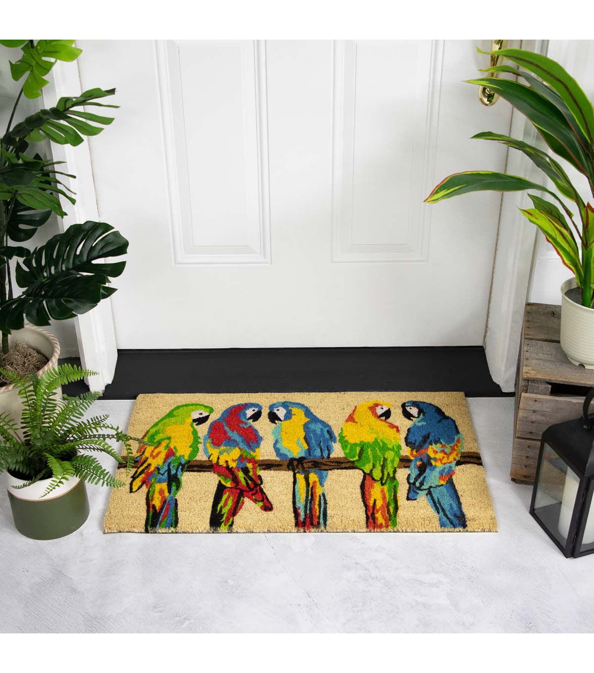 Add a burst of color and whimsy to your doorstep with this multicolor Parrots outdoor doormat. This vibrant doormat features a playful design of multicolor parrots perched on a branch against a toffee-colored background. Made of durable coir material it effectively traps dirt and moisture from shoes keeping your entryway clean and tidy. Perfect for both indoor and outdoor use this doormat is a charming way to welcome guests to your home.