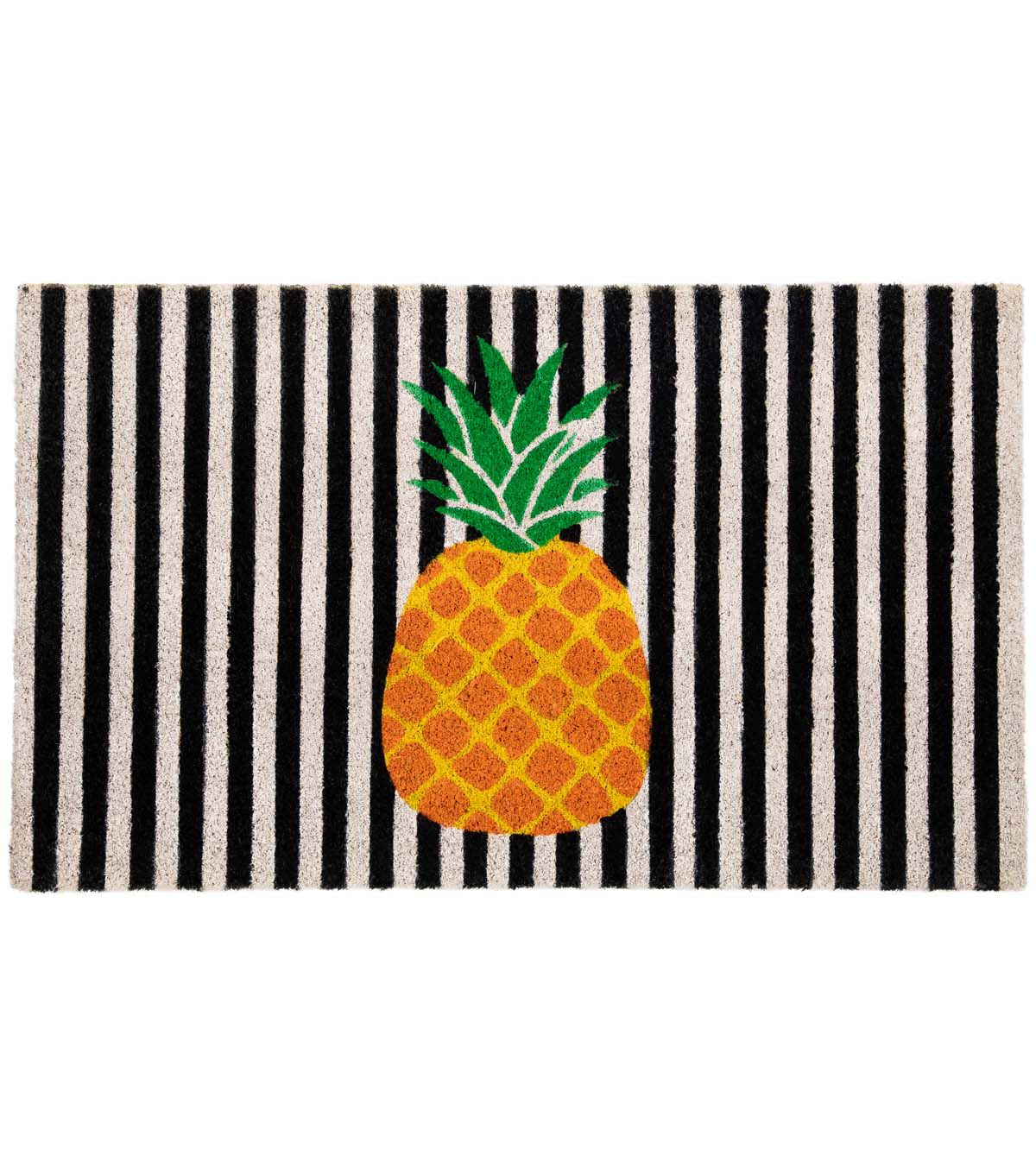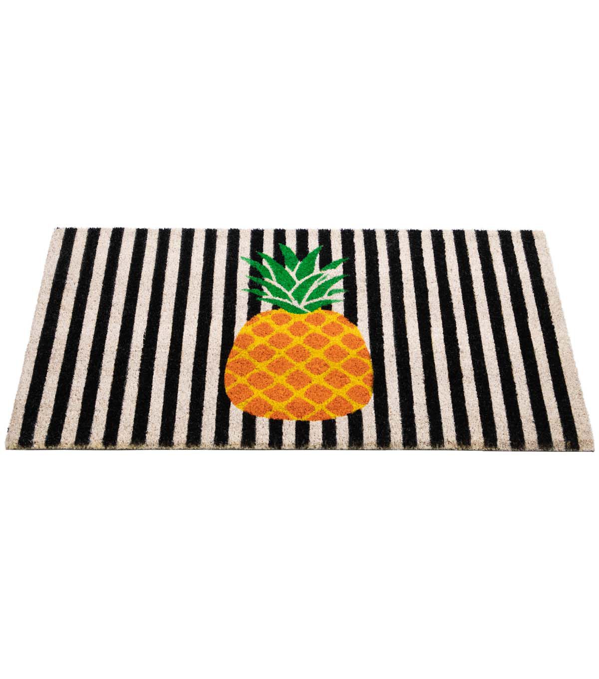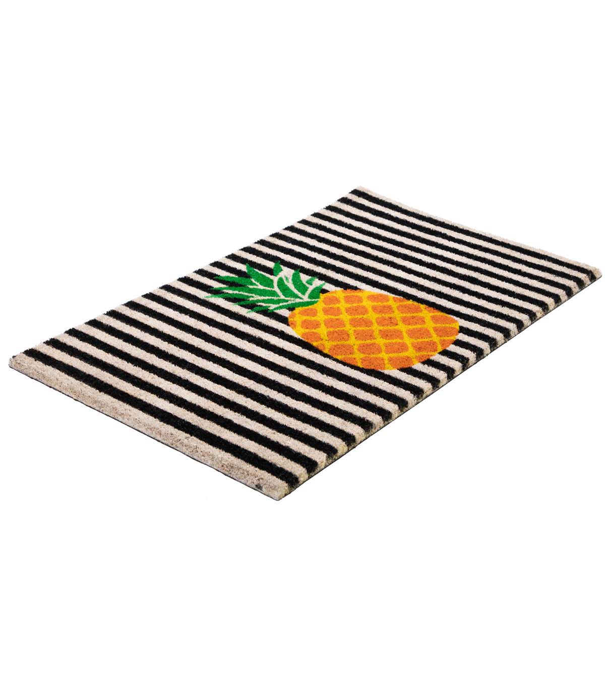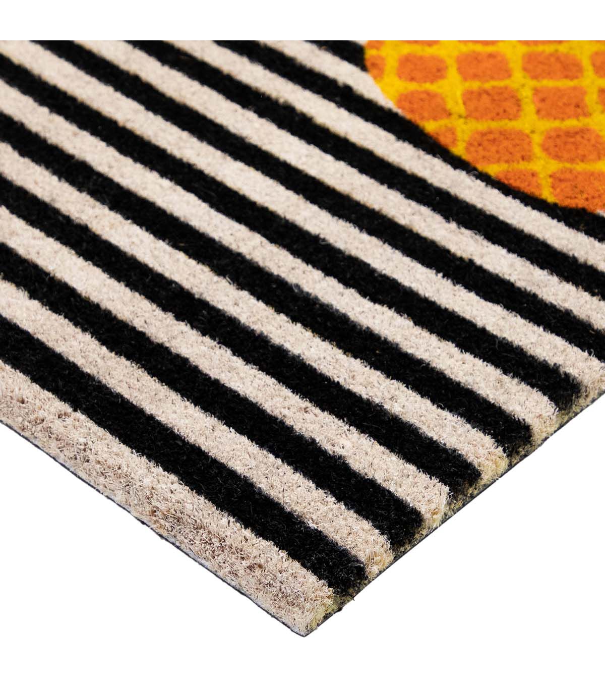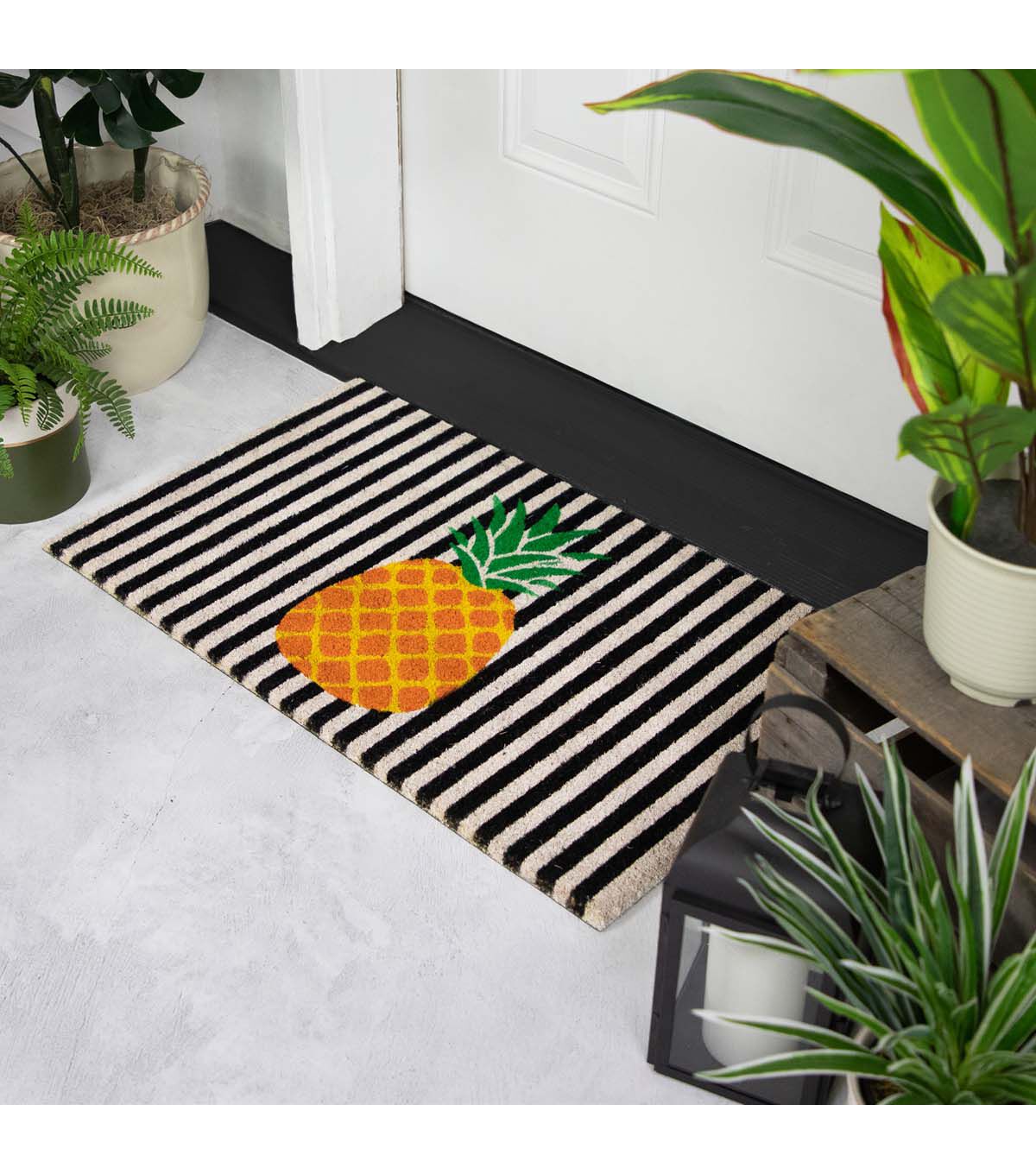Welcome your guests in style with this charming pineapple doormat. The bright and bold black stripes paired with the tropical orange pineapple design add a pop of color and personality to your outdoor space. Made from all-natural coir fibers this doormat is durable and weather-resistant ensuring it can handle all kinds of outdoor elements. With its charming design and high-quality construction this doormat is sure to impress your guests and make a statement at your front door.