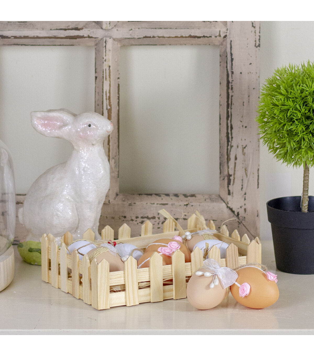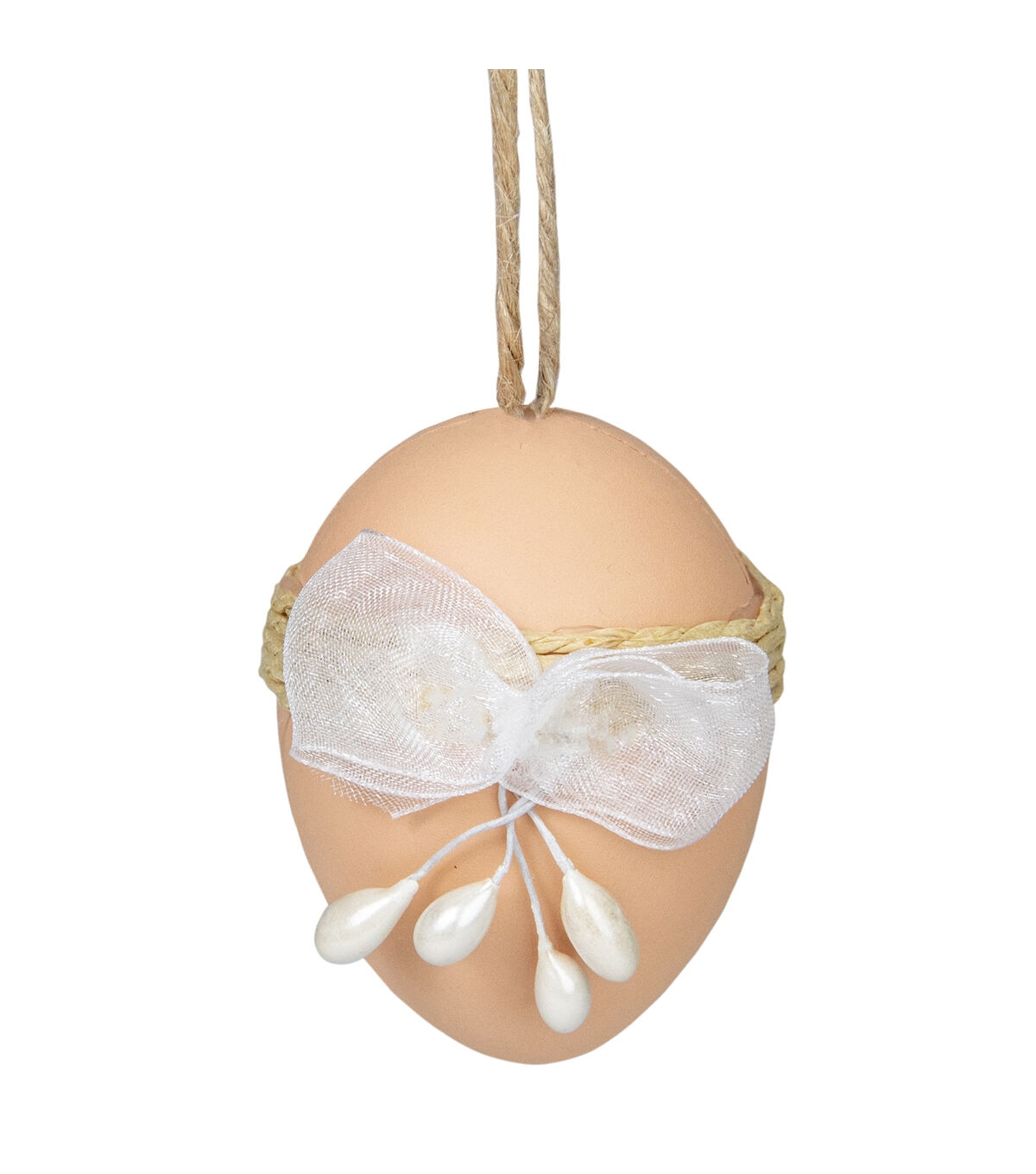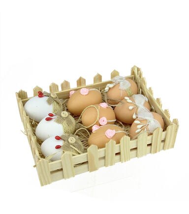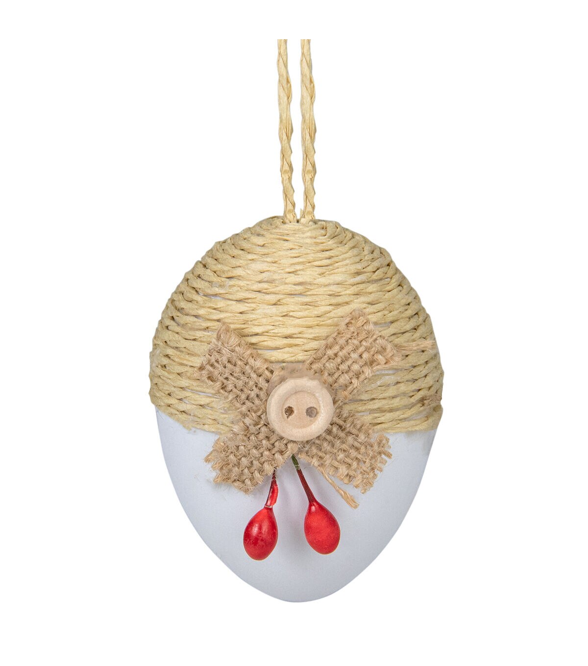Any place that this set of ornaments get hung will become a joy to behold! Sports white and natural hues the Easter egg-shaped adornments boasts of decorative burlap and jute designs. Comes ready-to-hang the decorative pieces are ideal for trimming trees or hanging above doors. Product Features: Assortment of white and natural colored Easter eggs. Eggs feature decorative burlap and jute designs with buttons white and red berry accents and ribbon bows. Fully dimensional ornaments. Each comes ready-to-hang on a jute cord. Comes in a picket fence style basket. Recommended for indoor decorative use only Dimensions: 2.25" high x 1.5" diameter. Material(s): foam Set includes 9 of the item shown