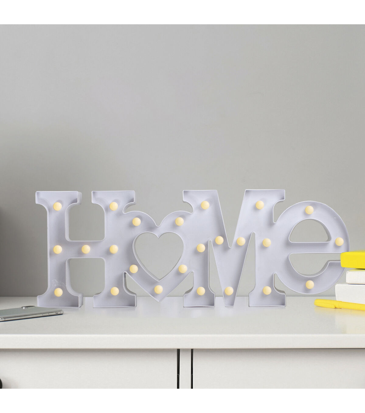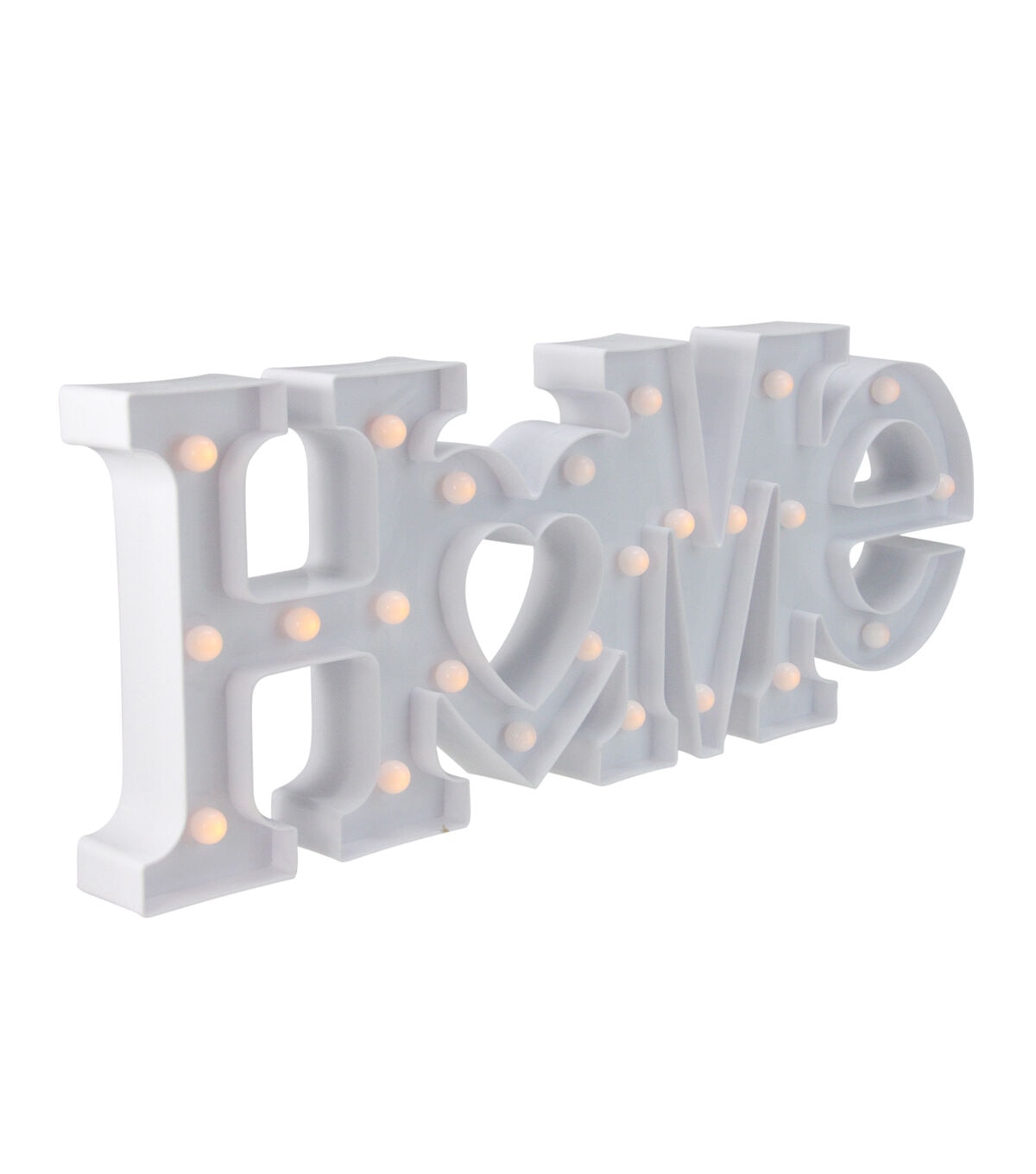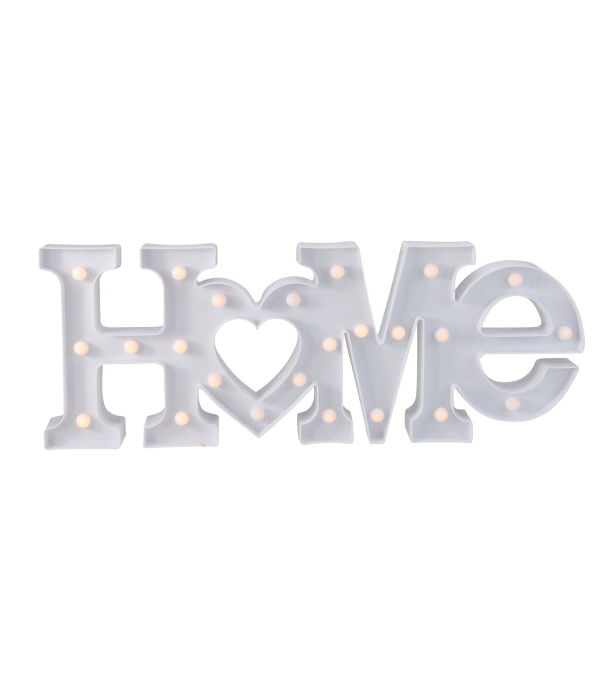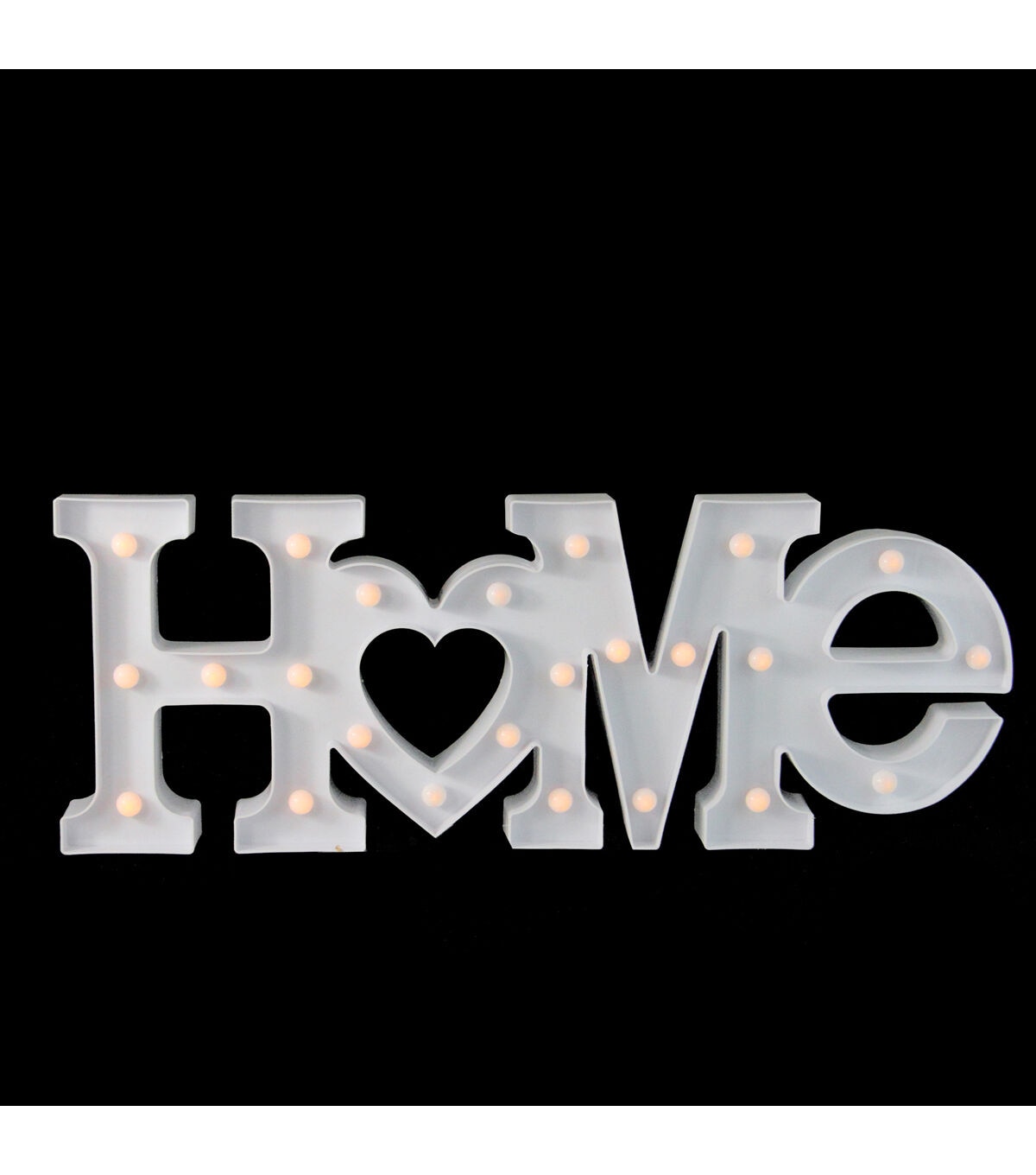 Light up your walls with our modern lighted marquee sign. The sign which is shaped to read 'Home' is lined with warm white lights that give off a soft glow. This sign will be a great addition to your decor for years to come. Product Features: Illuminated by 23 LED lights Color: warm white bulbs One-sided design LED lights use up to 80% less energy Bulbs stay cool to the touch Requires (2) "AA" size batteries - not included Convenient on/off switch on the back Comes ready-to-hang with two keyhole hooks on the back Dimensions: 7.5"H x 20.5"W x 1.5"D Material(s): plastic