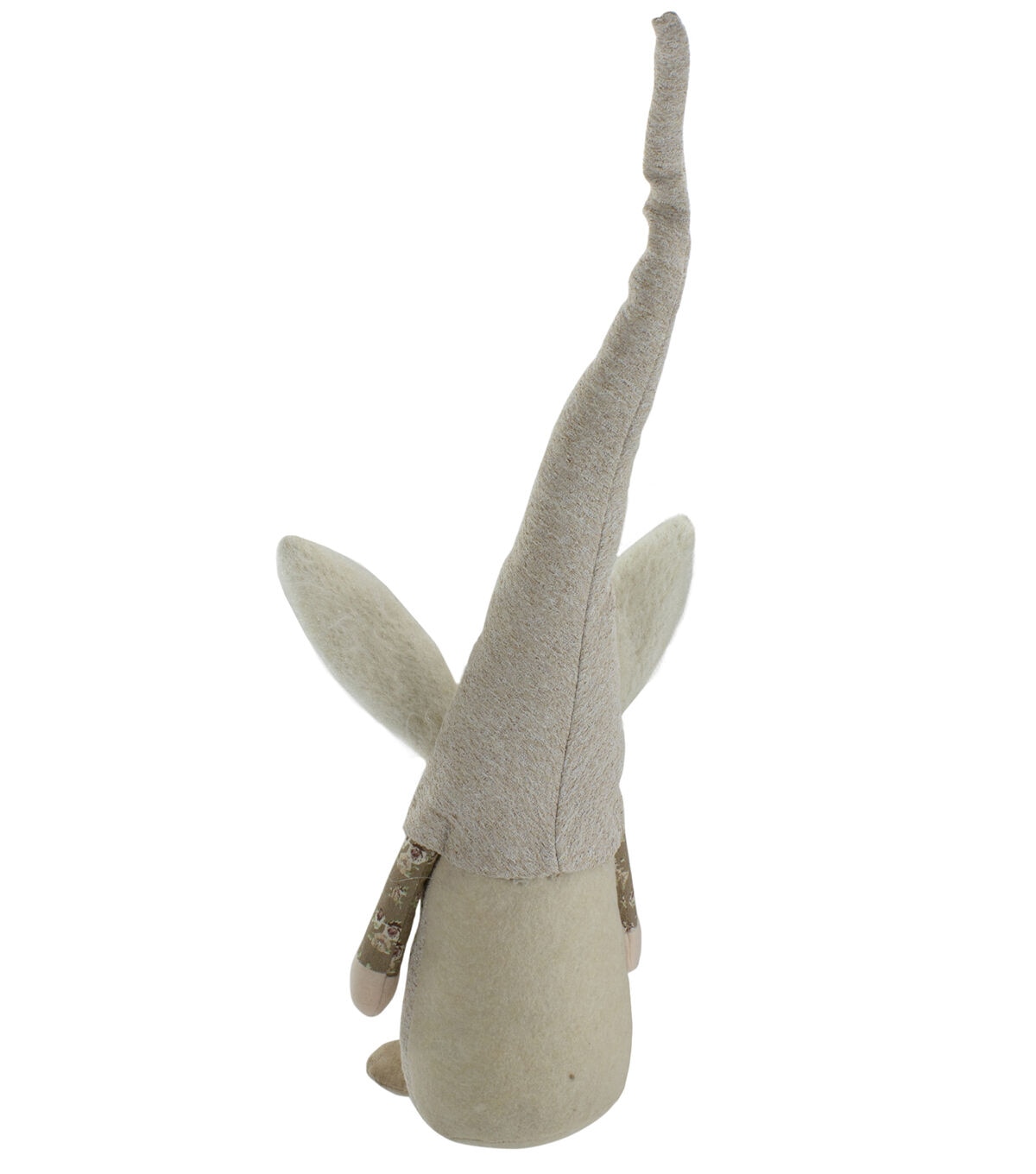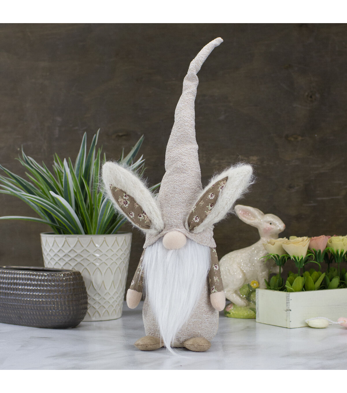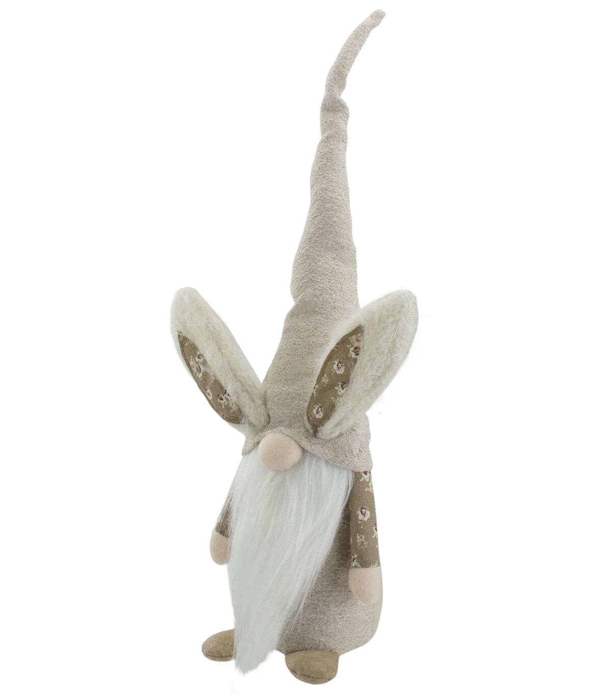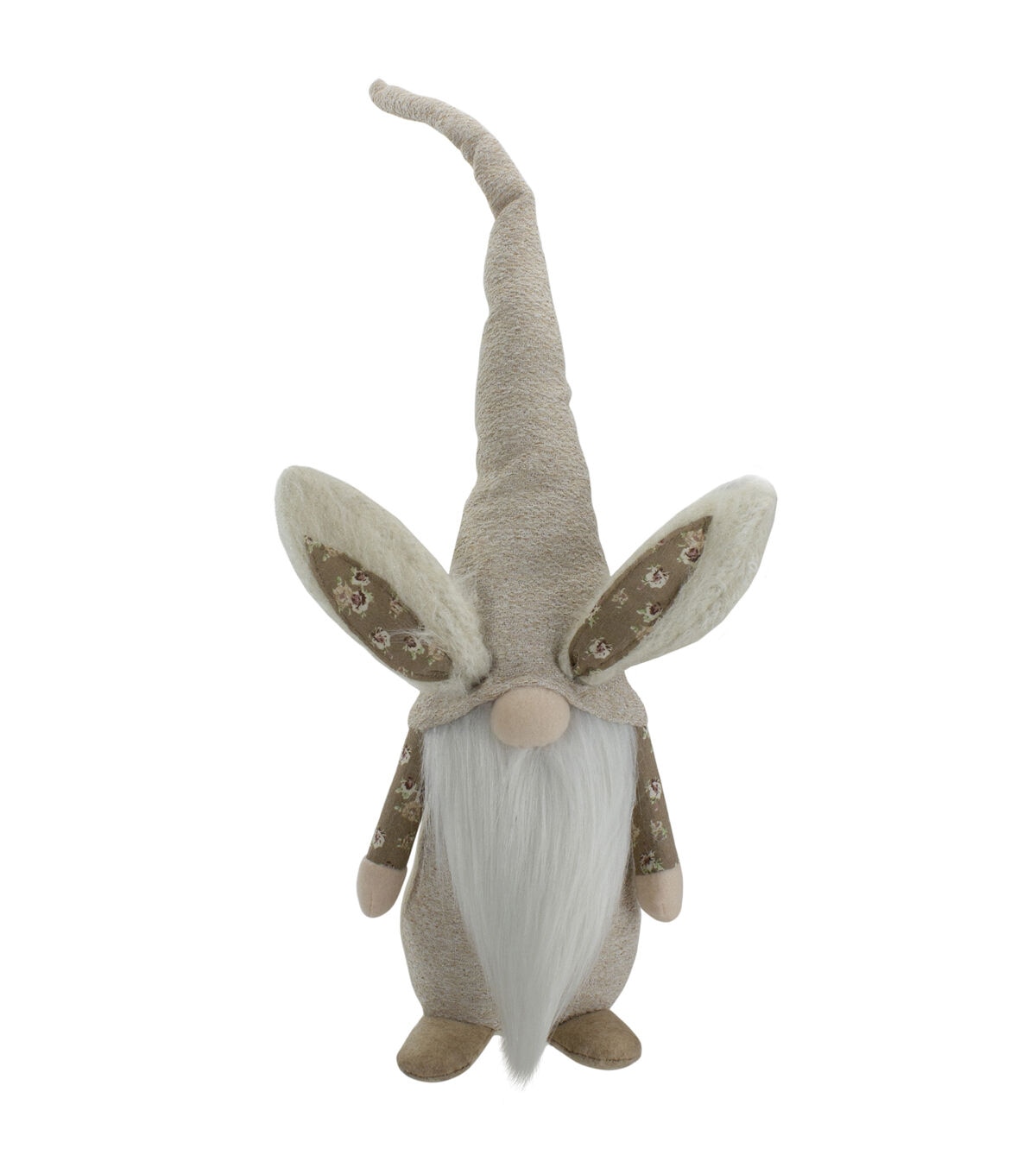 . Features: Spring gnome figure with a brown and beige body. Wears a textured beige bendable hat with bunny ears. Bunny ears have a floral and fluffy design. Arms also have a floral design. Wears smooth brown shoes and mittens. Long white faux fur beard. Has a weighted bottom for stability. Recommended for indoor use only Dimensions: 20"H x 10"W x 5"D. Material(s): polyester/cotton- 10 x 20 x 5 inches