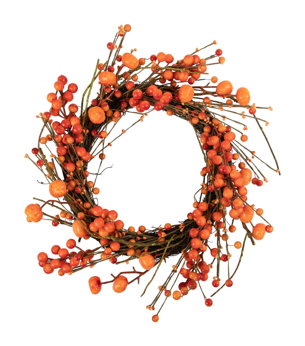Capture the feeling of a crisp fall day with this beautiful autumn wreath. It features red and orange berries with a brown twig backing that will give a pop of color to your home décor. Display this vibrant wreath on doors walls windows or over your mantle.
