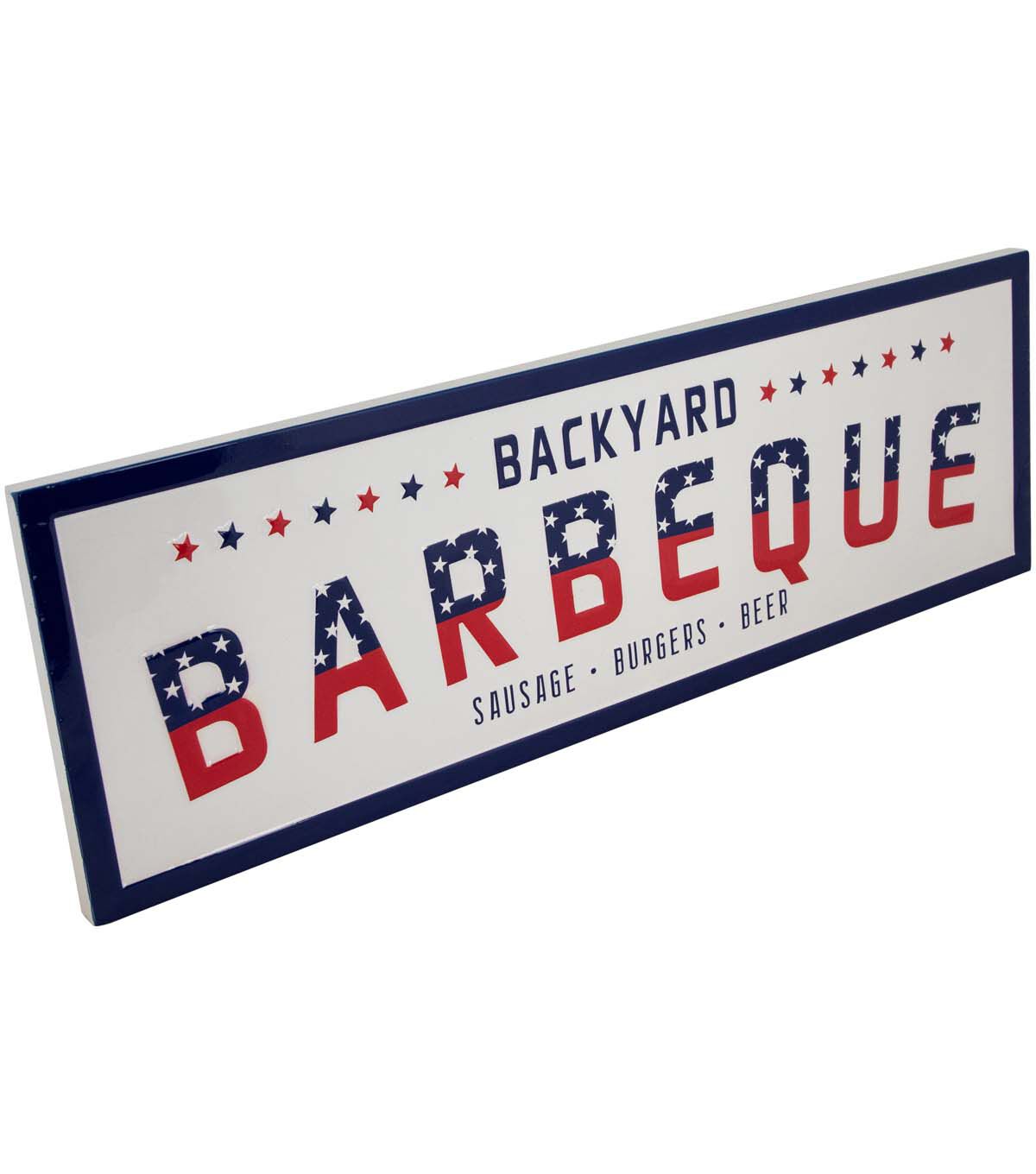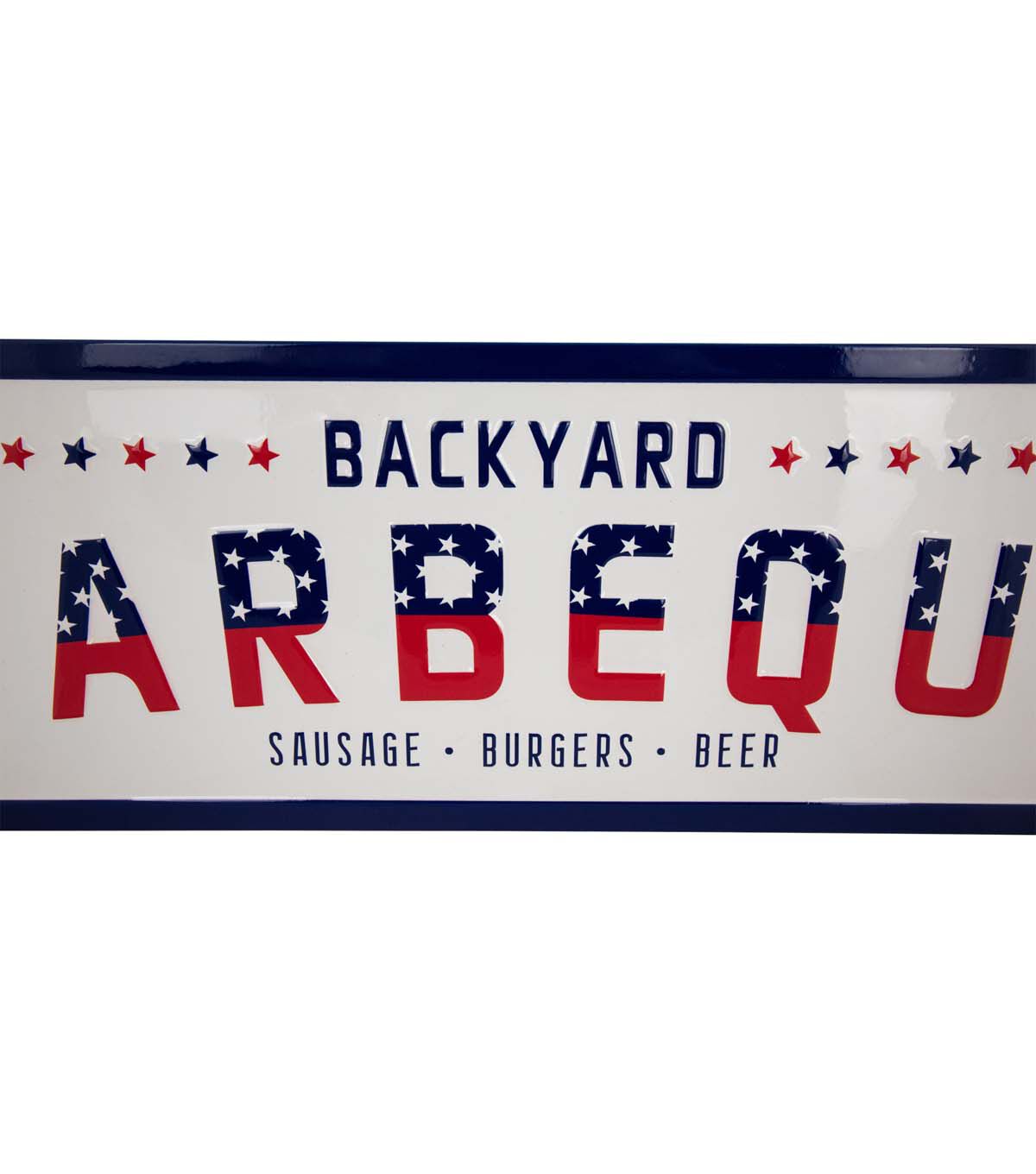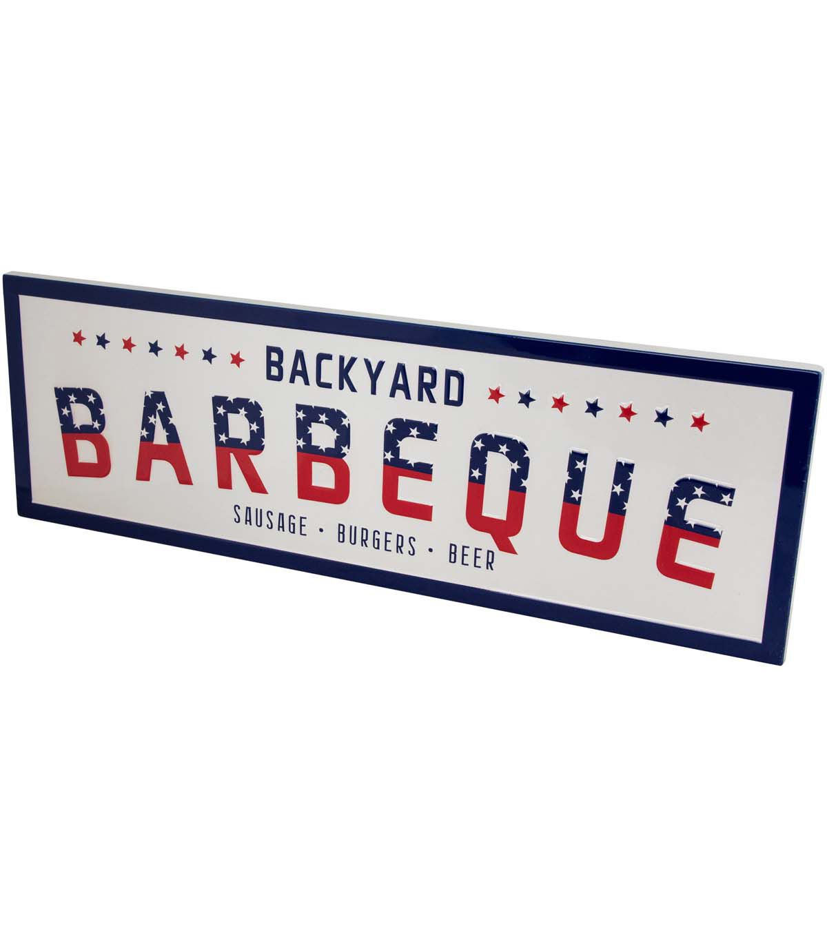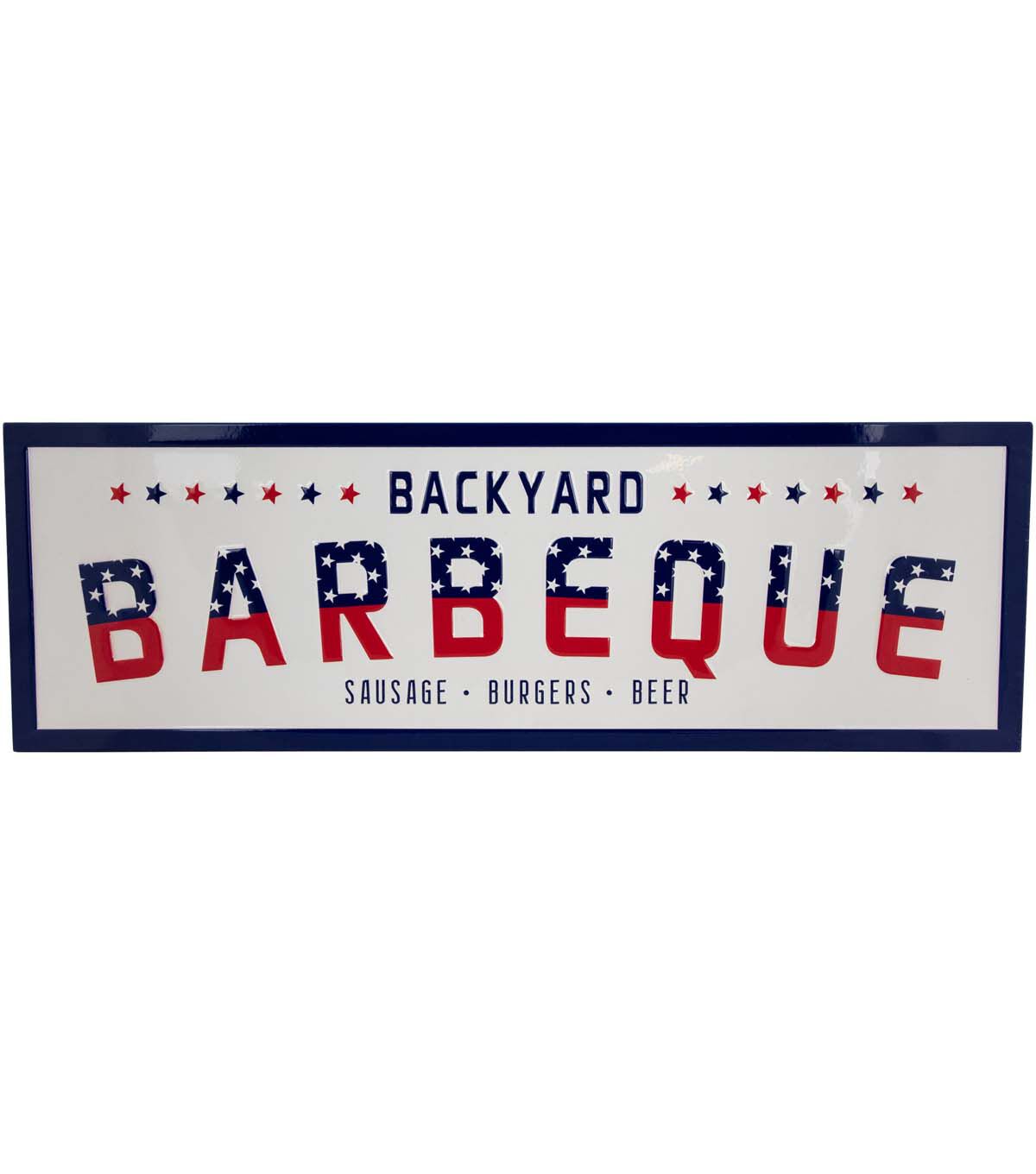 Enhance your any space with this metal wall sign. Featuring a classic red white and blue theme this sign proudly reads "Backyard Barbeque - Sausage Burgers and Beer." It's the perfect addition to your grilling haven adding a touch of Americana charm to your outdoor gatherings. Bring a slice of the good old days to your home or backyard and let the flavors of summer sizzle in style.