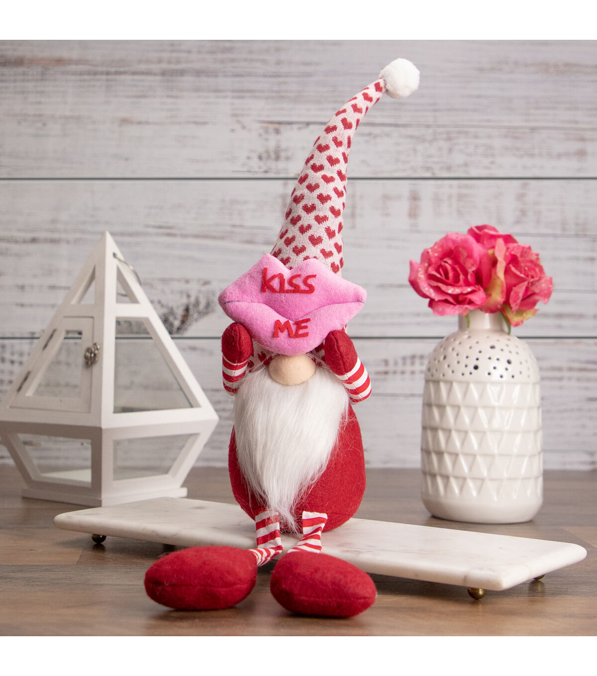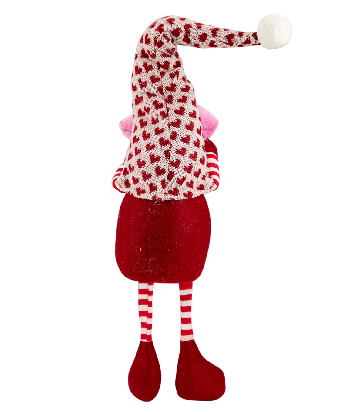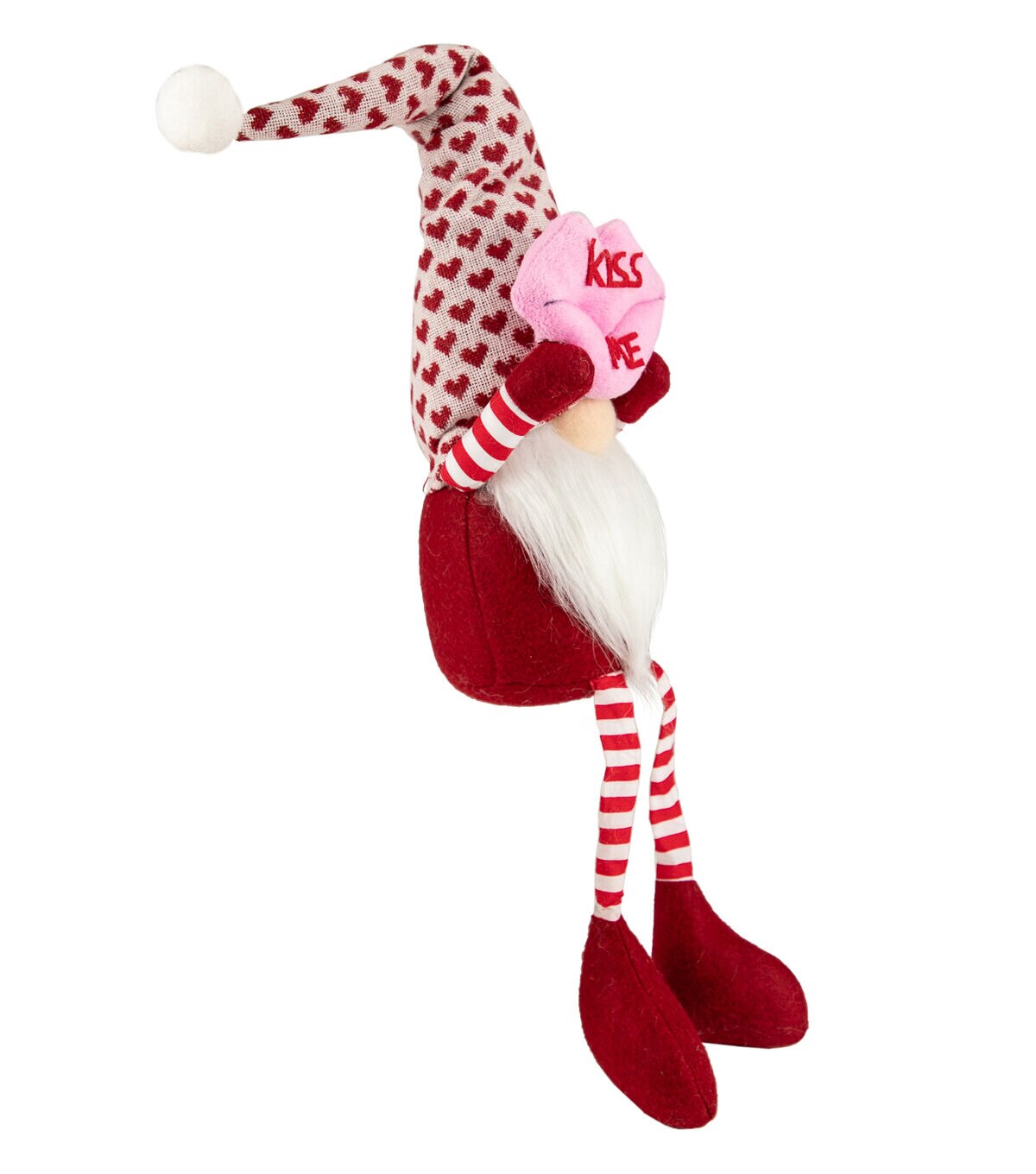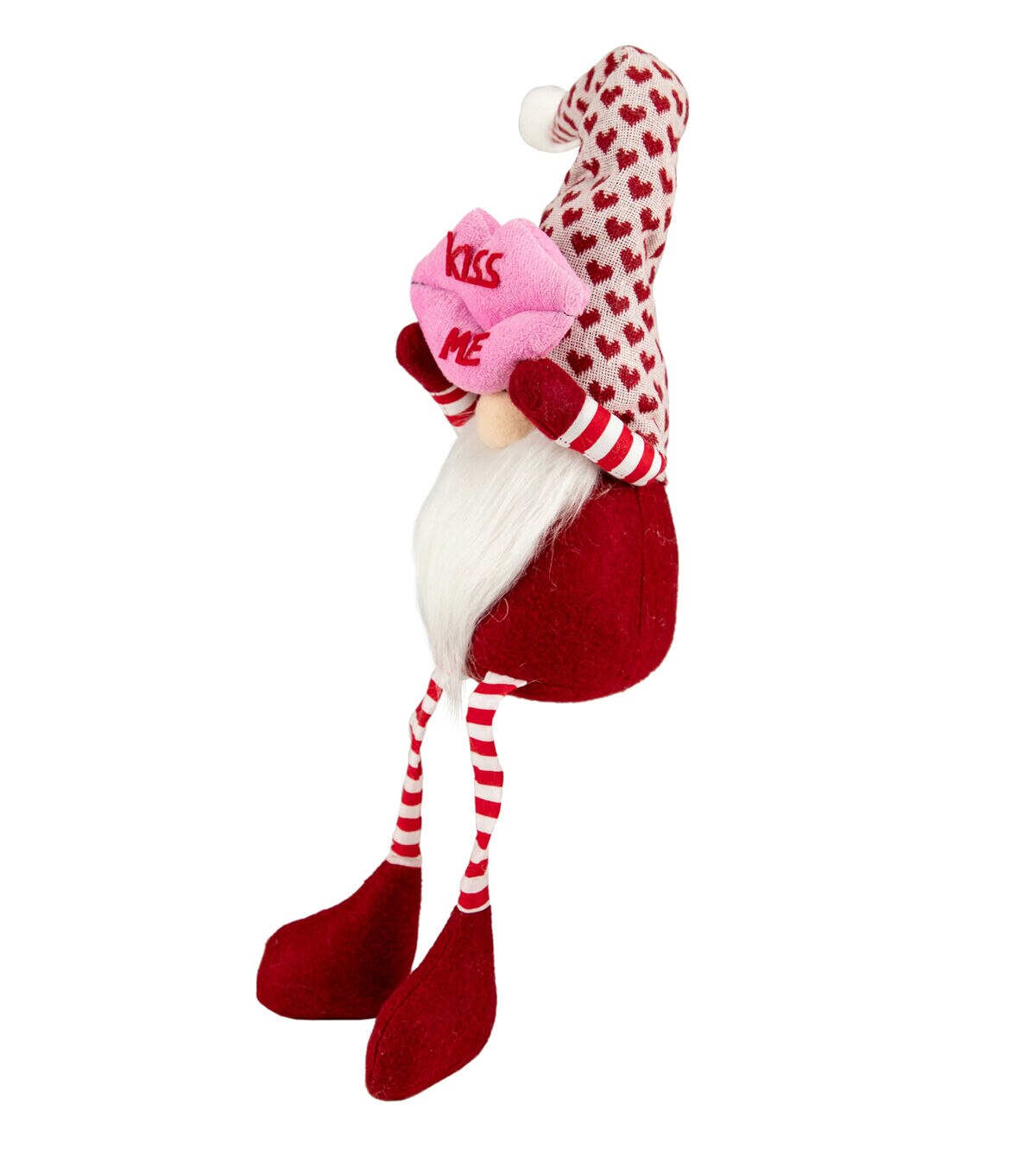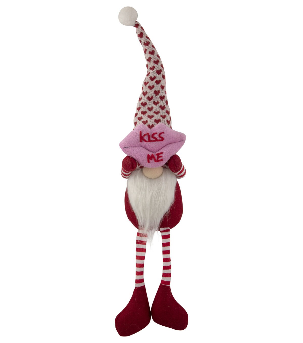 Gnomes are best known for guarding Earthly treasures providing good luck and are perfect for protecting your goodies. This gnome has super long legs clad in red and white stripes and is wearing white hat with red hearts. The gnome had the traditional long white beard with its bulbous nose poking out from under his hat. He is holding large pair of pink lips that read 'kiss me' over his head. Place this gnome on your mantle or on any table of your choice for a fun festive touch. Product Features: Valentine's day gnome figure with long legs. Wears a red and white heart patterned hat. The gnome has on red and white str[ed pants. Holds a pink pair of lips that read 'kiss me'. Gnome has long white beard and bulbous nose. Weighted bottom keeps gnome steady. Recommended for indoor use only Dimensions: 23"H x 4.5"W x 4.5"D. Material(s): fabric/faux fur