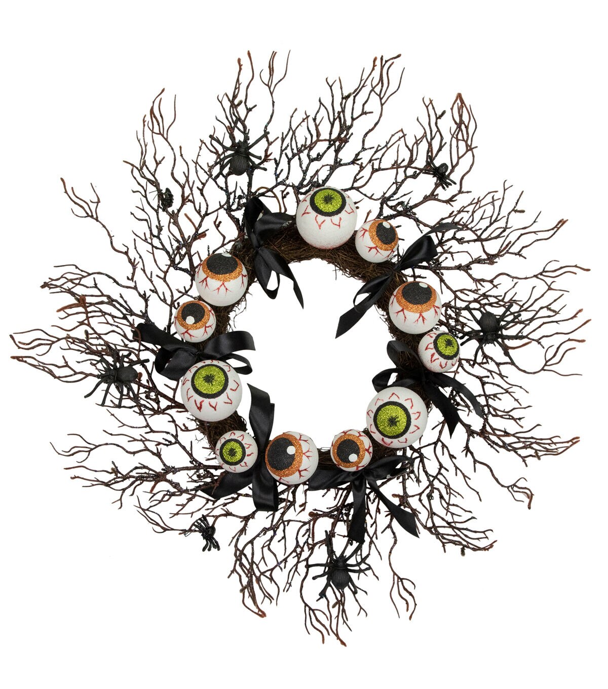 Do you feel like someone watching you? This spooky wreath features a twig base and is accented with glittered back branches spiders bows and eyeballs. This wreath is perfect for hanging on walls doors and windows or add candles to create a unique table decoration.