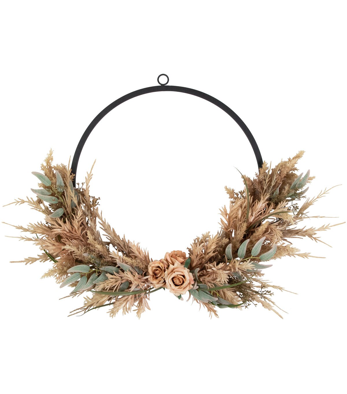 This beautiful harvest wreath is the perfect addition to your Autumn decor. Mixed foliage of grasses and leaves give the look of a dried floral arrangement. Pale blooming roses and thistle florets take center stage. The sturdy metal ring makes it ideal for hanging on walls or doors.