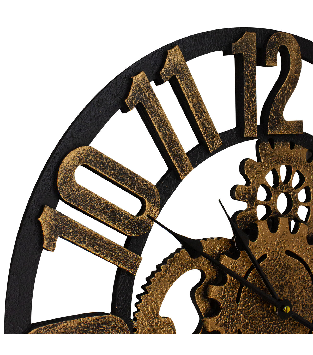 This unique clock is designed with block numbers and accented with cogs. A great wall piece for an industrial decor design. You don't have to worry about electric cords since it is battery-operated. Product Features: Gold and black round wall clock Features block numbers Black hour and minute hands Designed gold and black cogs Requires (1) AA battery not included Recommended for indoor or outdoor use Dimensions:24"H x 24"W x 1.5"D Material(s):MDF/plastic/metal