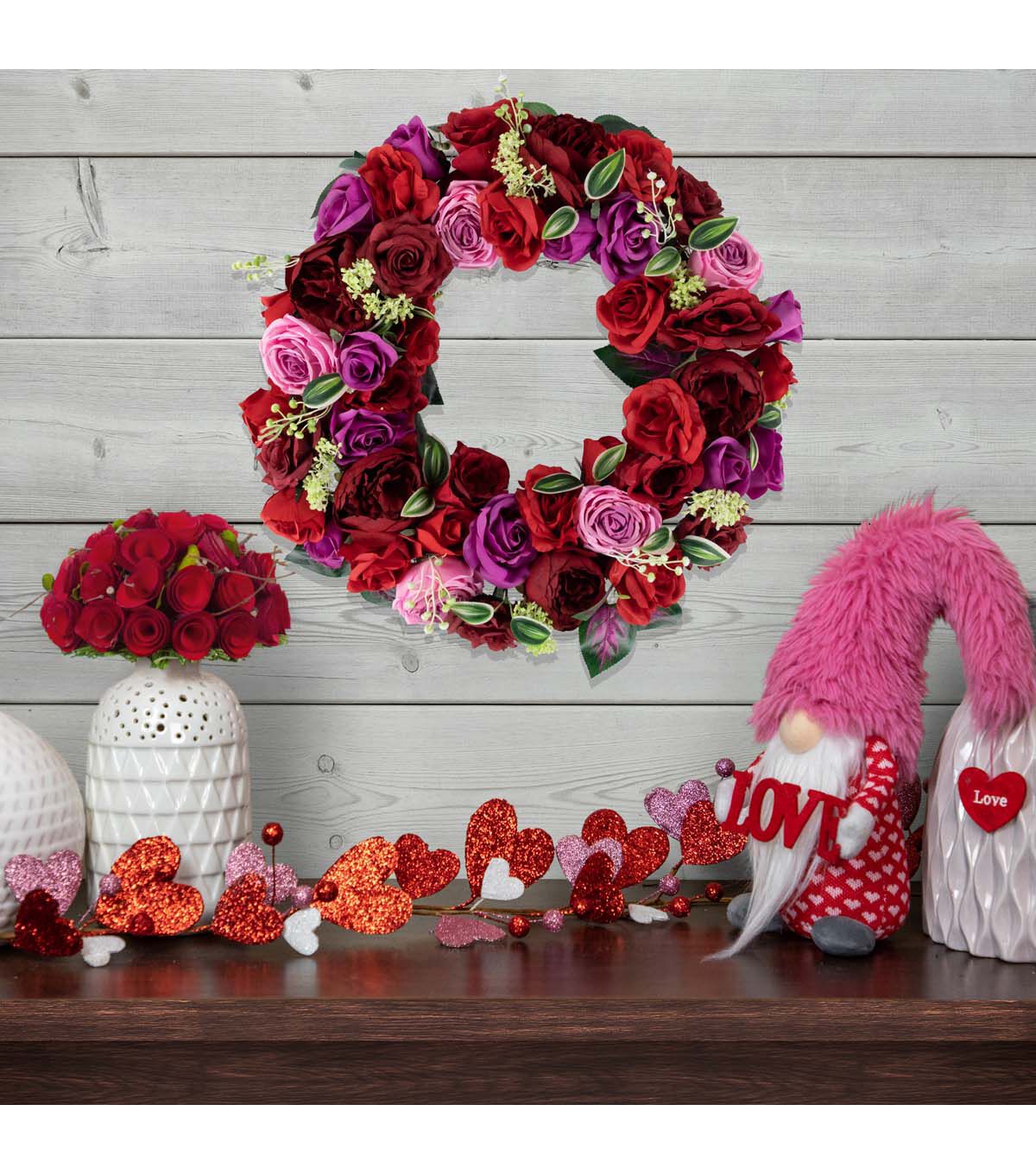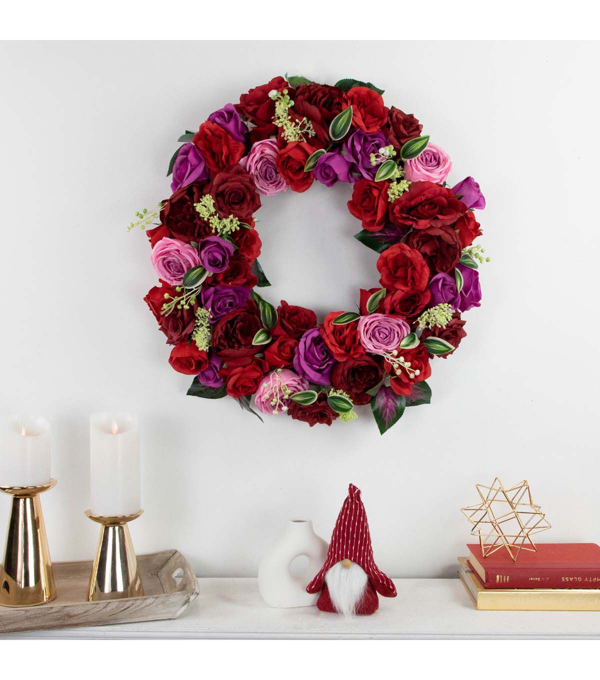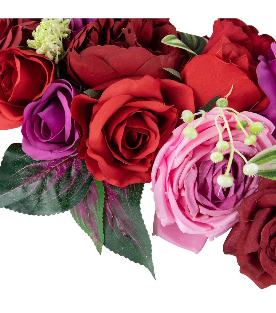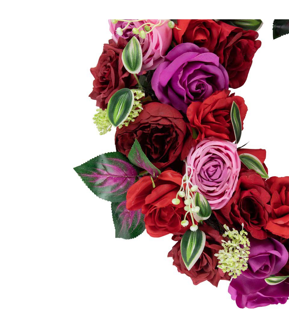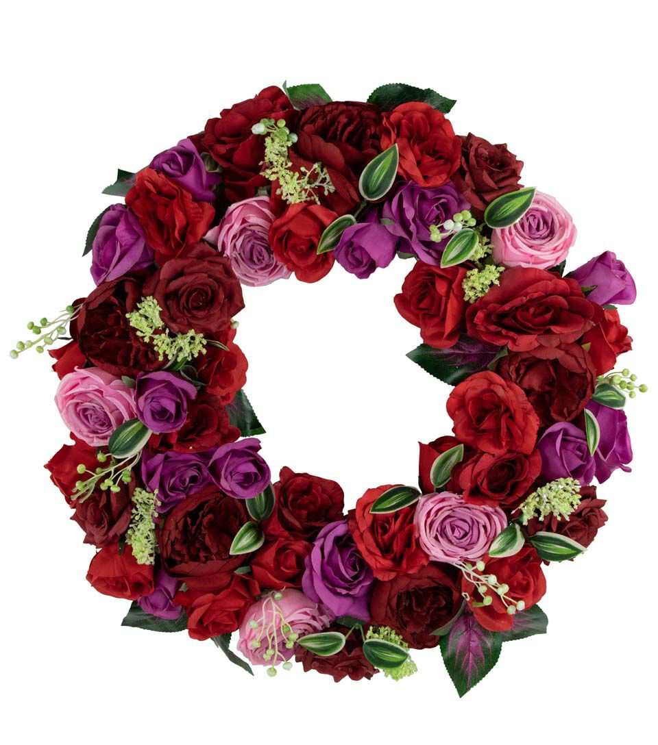 Add a soft and delicate touch to your home decor with this artificial floral wreath. This wreath is constructed of garden and cabbage roses in full bloom with touches of variegated green leaves and pops of white berries with yarrow flowers. The sturdy grapevine backing is the perfect base. The mix of reds and pinks is the perfect spring and Valentine's day decor piece. This wreath would be a perfect addition to any bare corner or lonely door.