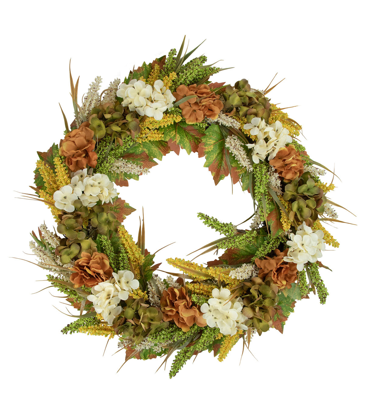 Capture the feeling of a crisp fall day with this beautiful autumn wreath. It features hydrangeas accented with wheat and green foliage. This wreath will give a pop of color to your home décor. Display this vibrant wreath on doors walls windows or over your mantle.