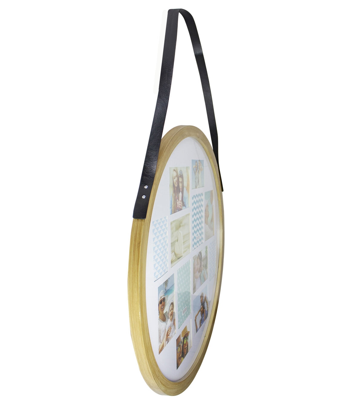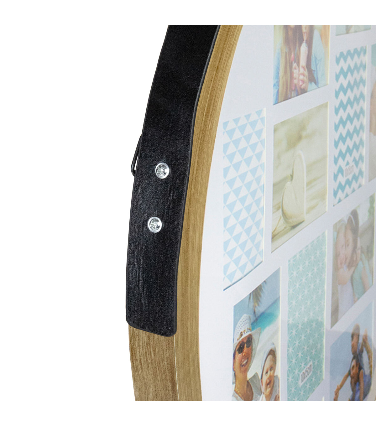 The Northlight 28" Wood 12 Photo Round Collage Frame is designed to be both stylish and functional. The frame features a single white pad and cardboard paper backing to protect your photos, and a hanging black strap for easy placement. Please note that this frame is for indoor use only.