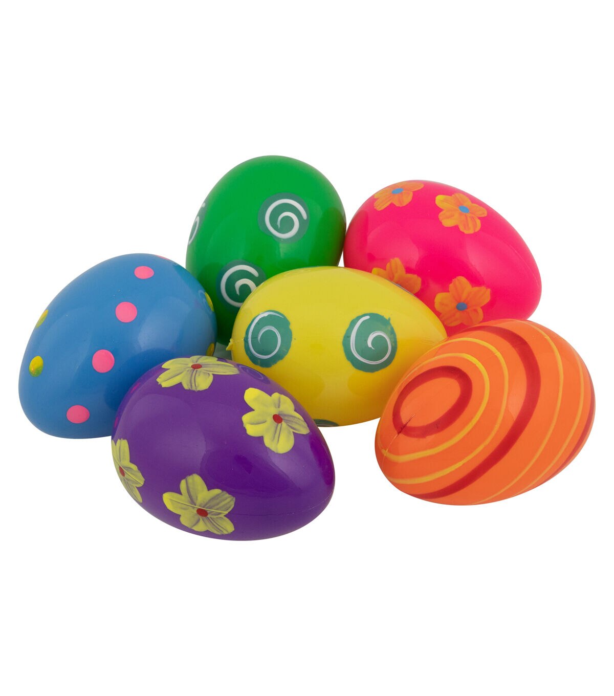 Celebrate this spring season with these adorable Easter eggs! They modify your living space to the peak of elegance. Get to witness the festive ambiance it delivers!. Product Features: Perfect for creating your own unique centerpiece or Easter wreath. Includes a pink orange yellow green blue and purple egg each with a different design. Each egg has a pre-drilled hole on the bottom. Recommended for indoor use only Dimensions: 3.25" high x 2.5" diameter. Material(s): plastic