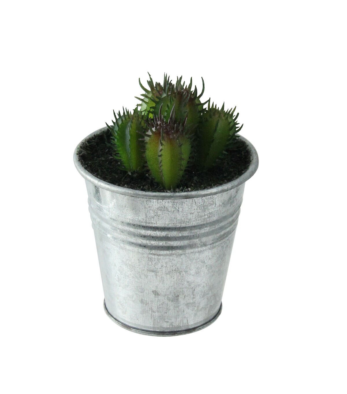 Love plants but lacking time to nurture them? Then this two-toned tropical artificial cactus with pot will be the apt plant for you. It is easy to maintain and doesn't need to be watered and remains as pristine as a natural. Product Features: Extremely realistic cactus in a silver tin pot Set in faux dirt for stability Recommended for indoor use or outdoor covered use Dimensions: 3.5" high x 2.5" diameter Material(s): plastic/tin