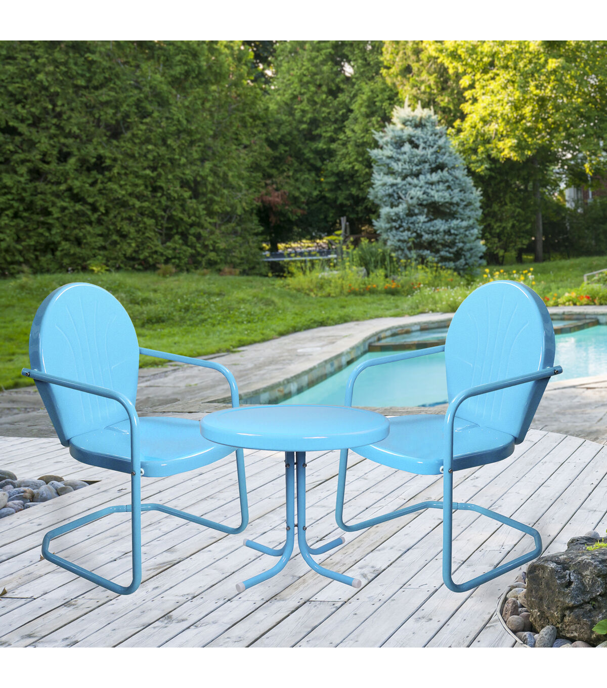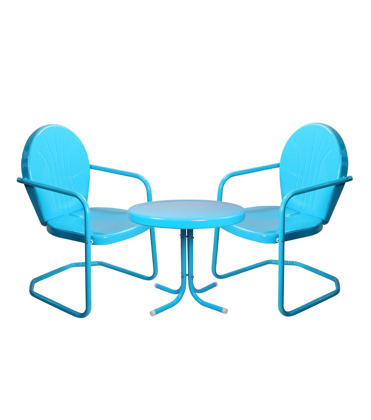 Just like those that your parents and grandparents had growing up. With its weather-resistant powder-coated finish you will have years to enjoy this classic set. Perfect for enjoying a glass of wine on the patio with family and friends or a good book by yourself. Features: 3-piece retro tulip chairs and side table set Color: white Long-lasting enamel paint Powder-coated finish Chairs have a 350-pound weight limit Table has a 180-pound weight limit 5-piece easy assembly Comes with white caps All weather resistant For indoor or outdoor use Overall chair dimensions: 34"H x 23.5"W x 21"D Seat height: 16.5" Seat width: 19.5" Seat depth: 19" Seat back: 20.5" high x 19.5" wide Armrest height: 24.25" Table dimensions: 19" high x 21.75" diameter Material(s): steel/plastic