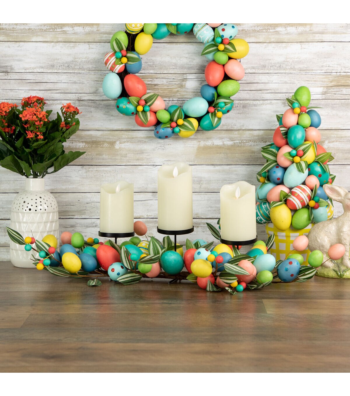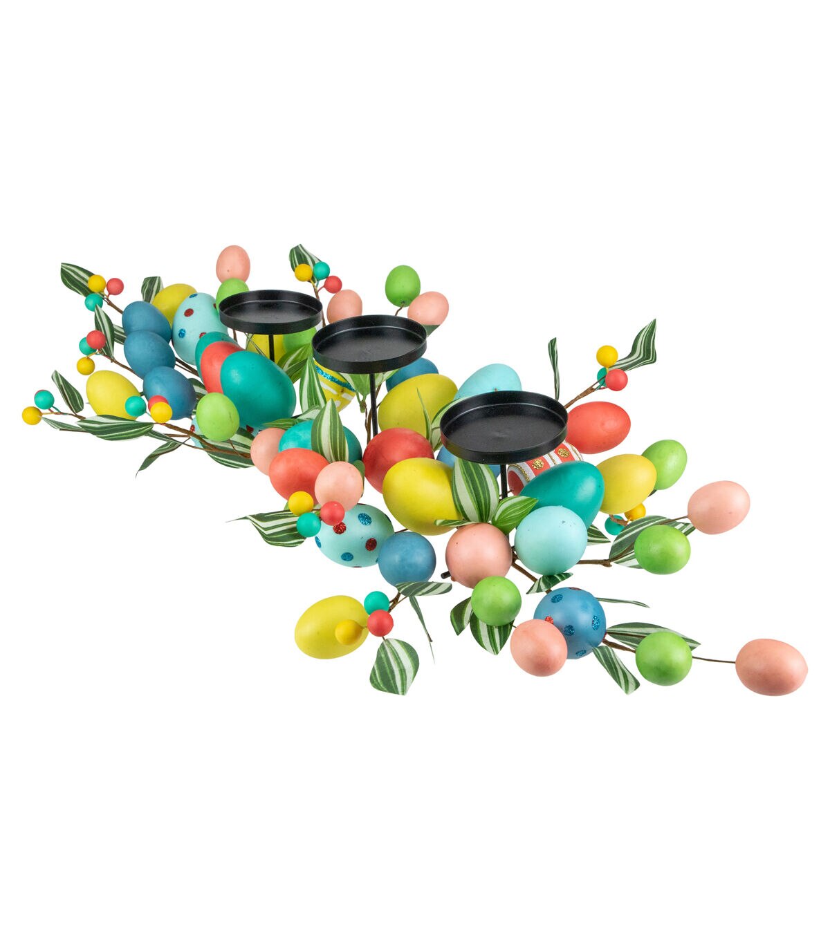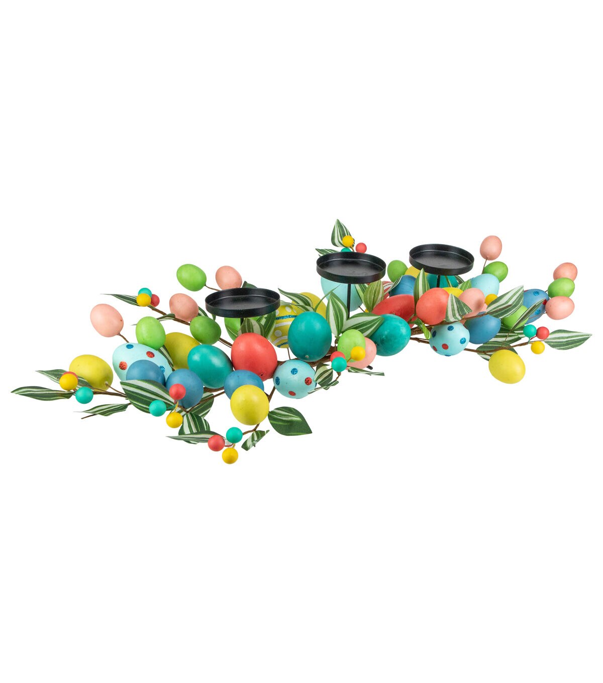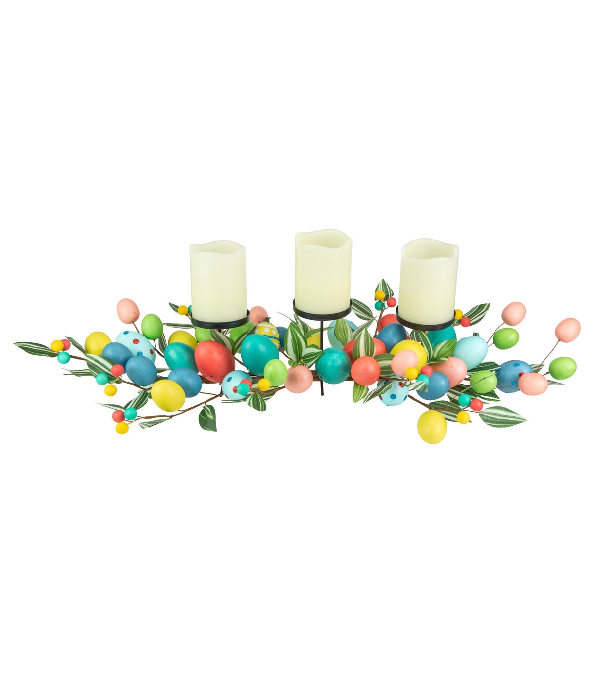 This wonderful Easter Egg candle holder is a must have for the holiday. Expertly colored eggs surround 3 pillar candle holders with green foliage and colorful berries tucked in all the right places. The perfect centerpiece for your Easter celebration.