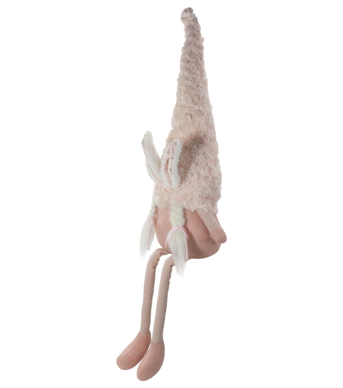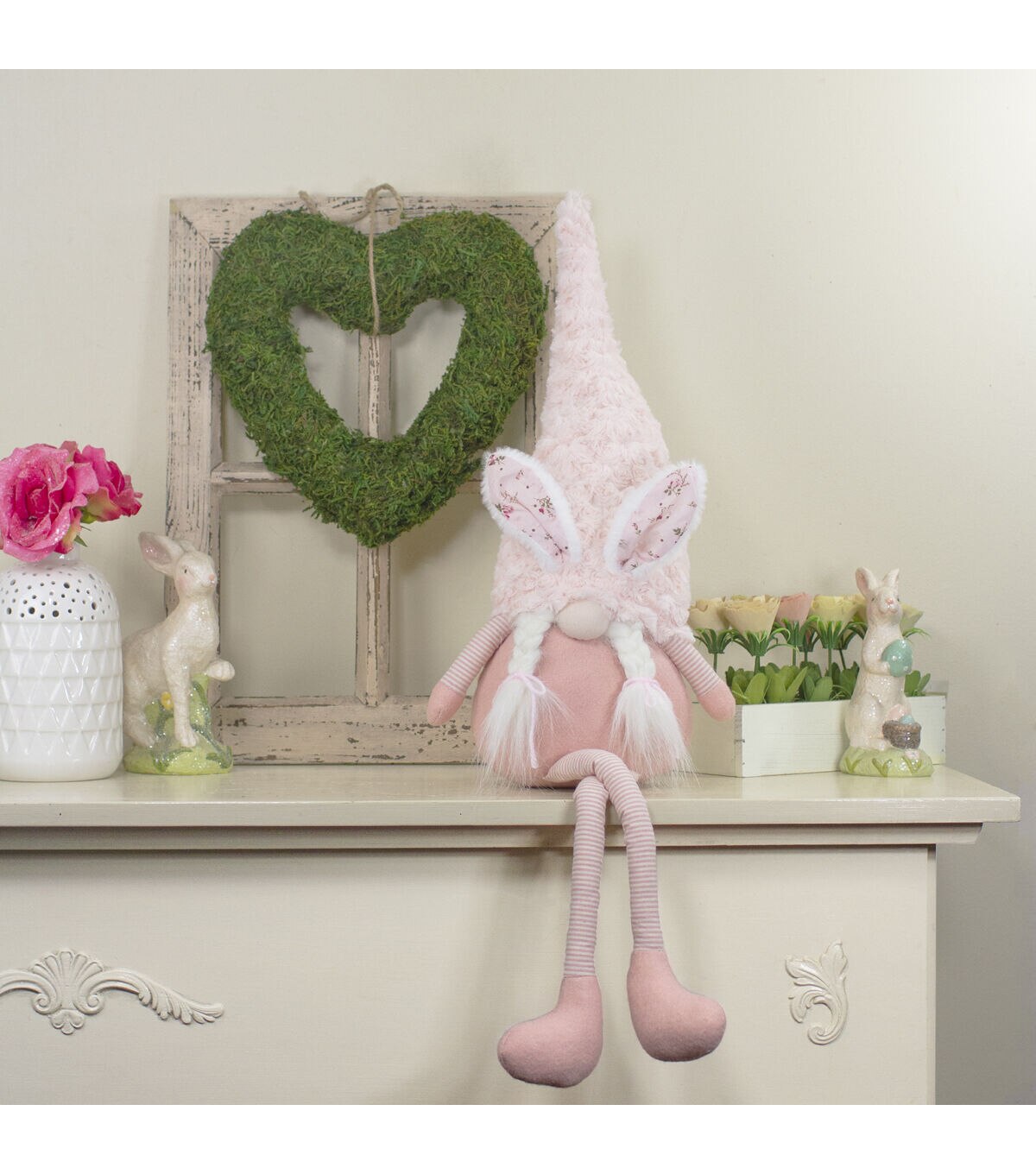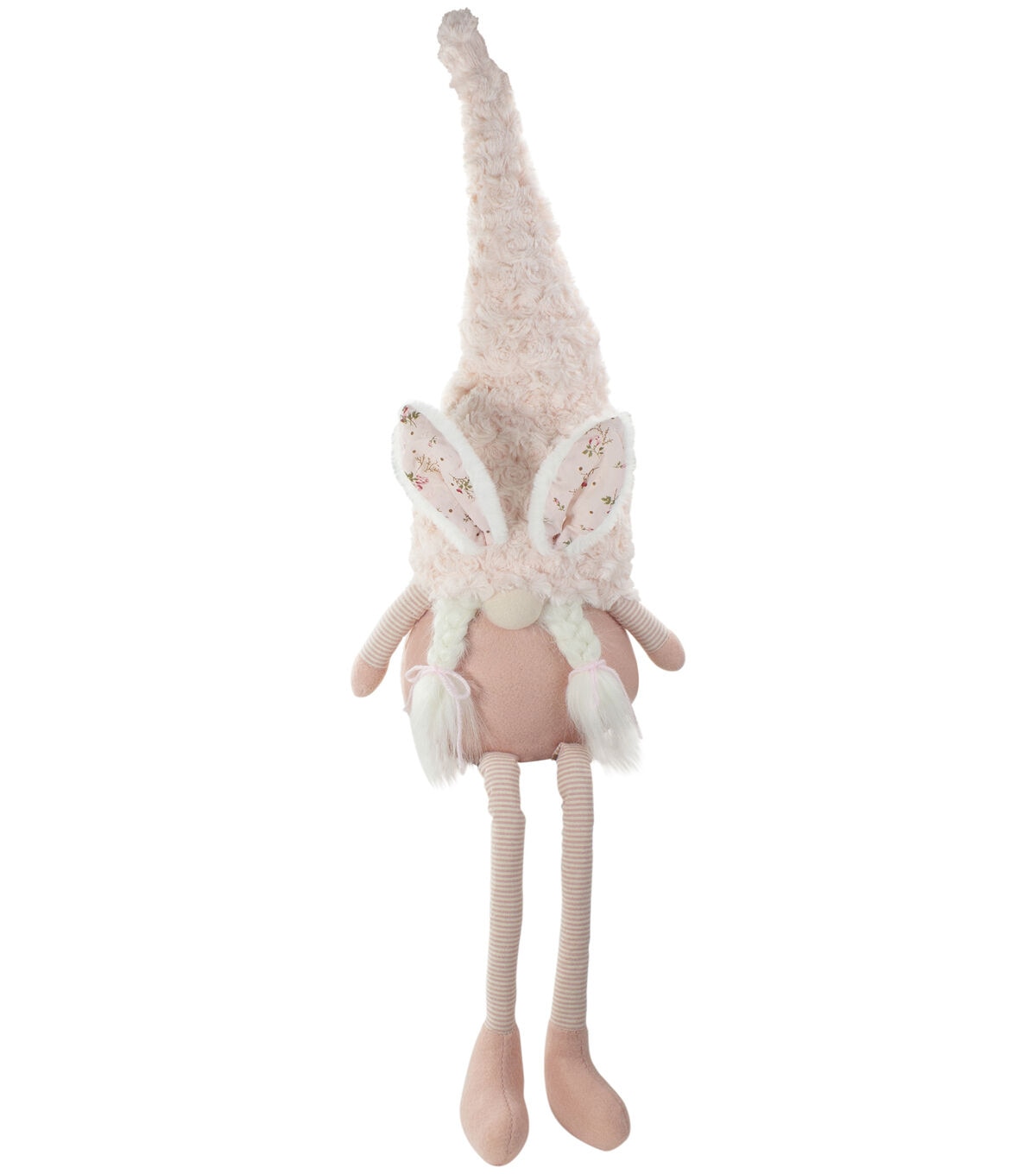 Add this adorable sitting gnome to your Spring or Easter decor this year. Designed wearing a plush pink hat with bunny ears. The hat has a bendable wire in it so you can position the hat however you like. Perfect to place on a tabletop or mantel in your home.. Features: Spring gnome figure with a pink body. Wears a plush pink hat with bunny ears. Pink bunny ears have a floral design with faux fur. Wears smooth pink shoes and mittens. Striped arms and dangling legs. Long braids with pink yarn bows. Has a weighted bottom for stability. Recommended for indoor use only Dimensions: 32"H x 9"W x 5"D. Material(s): polyester/cotton/wire