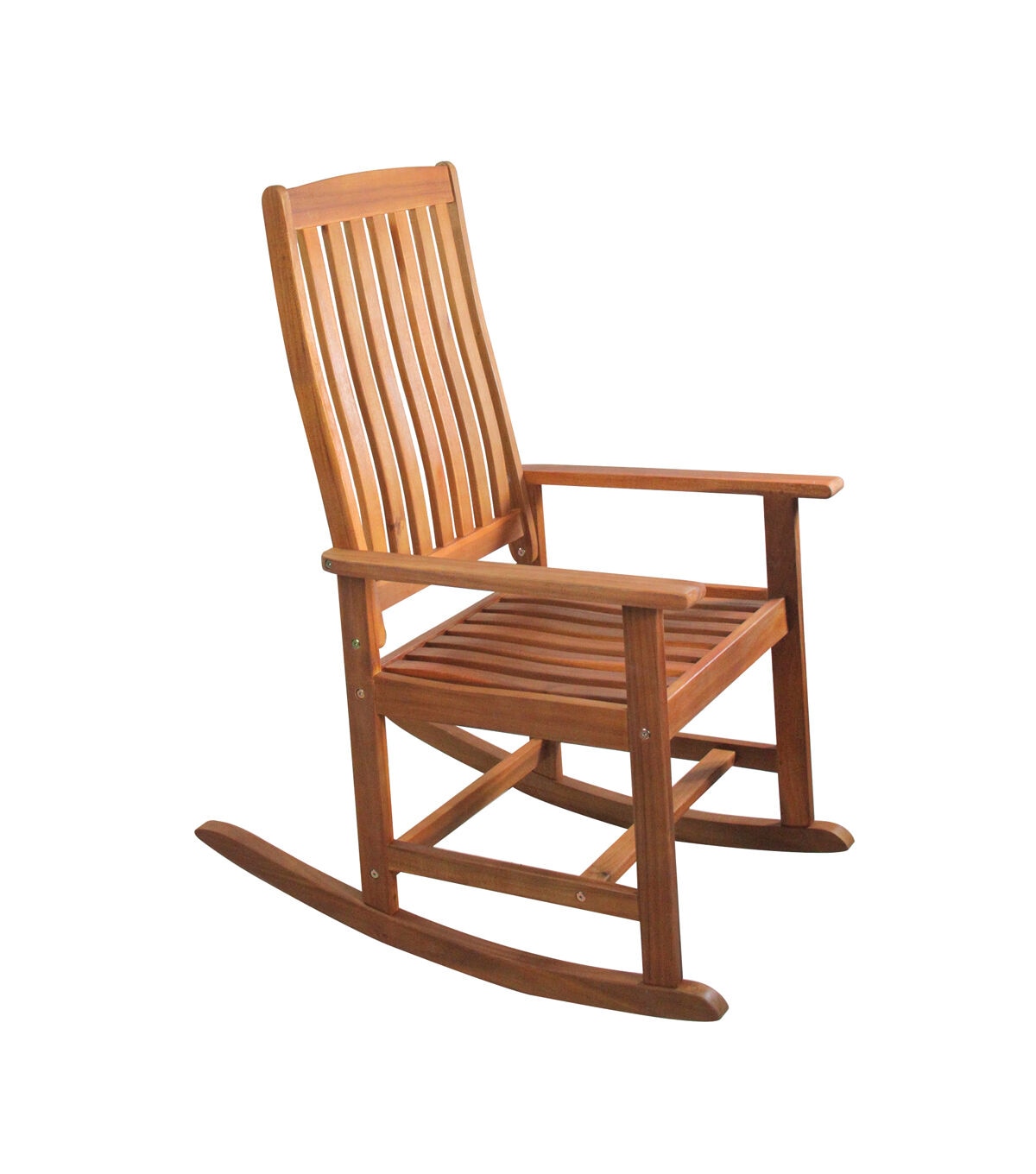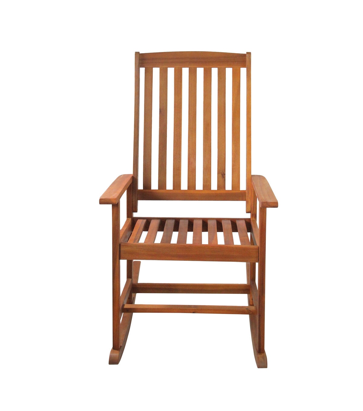 Summertime is about enjoying the sunshine with family and friends. This rocking chair will be the perfect addition to your summertime decor and to use year-round. The rocking chair is ideal for rocking on the porch at night with your other half children or grandchildren. Product Features: Brown wooden outdoor rocking chair Comfortable curved seat and back Long lasting wood with water-based and waterproof coating finish There is an easy 8-piece assembly - seat and back are assembled you simply have to attach the arms and legs Contains brass colored hardware and joints There are instructions included for an easy assembly Weatherproof for indoor or outdoor use Dimensions: Overall: 43" high x 24.5" wide Back: 28" high x 19.75" wide Seat: 20" wide x 18.5" deep Material(s): acacia wood/metal