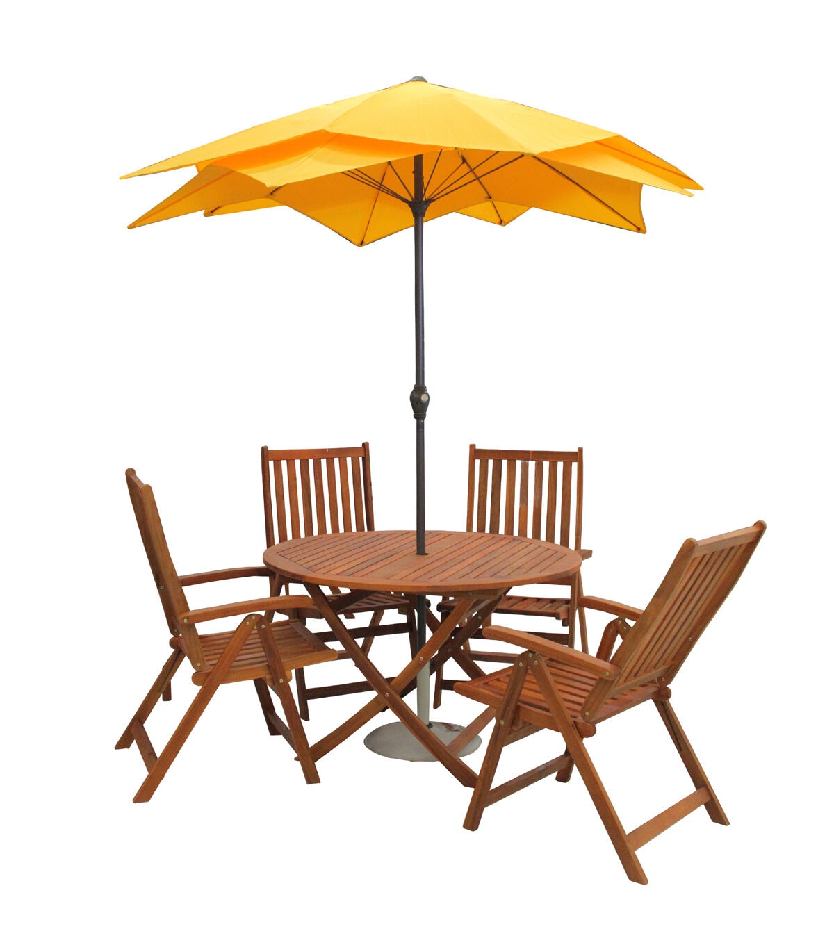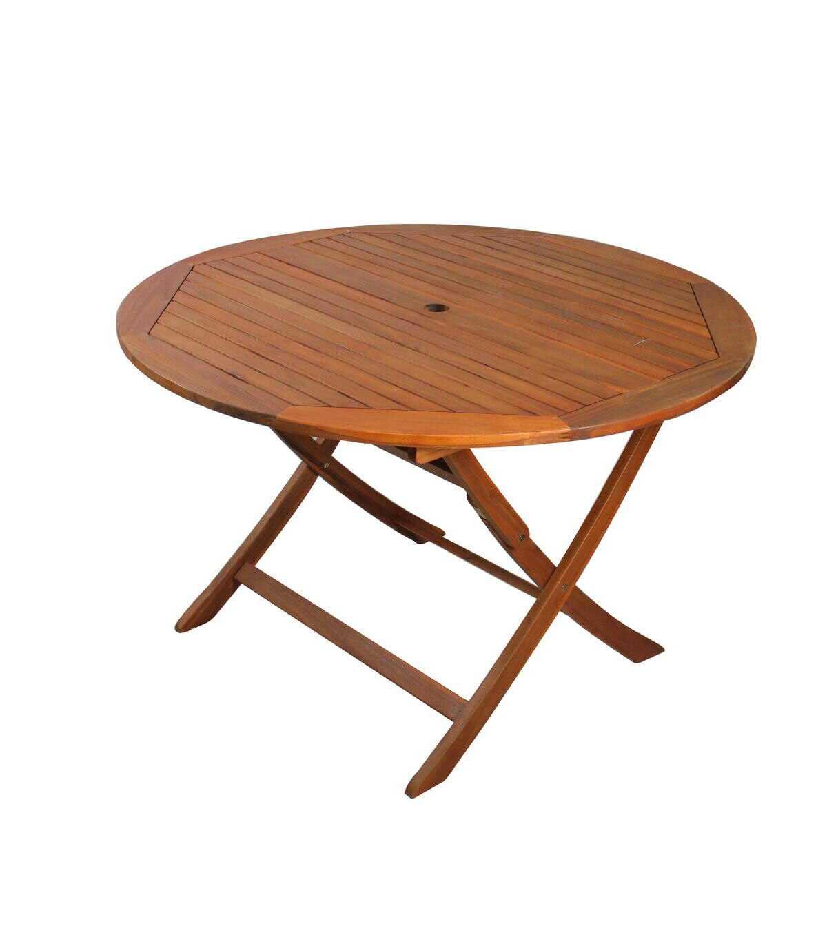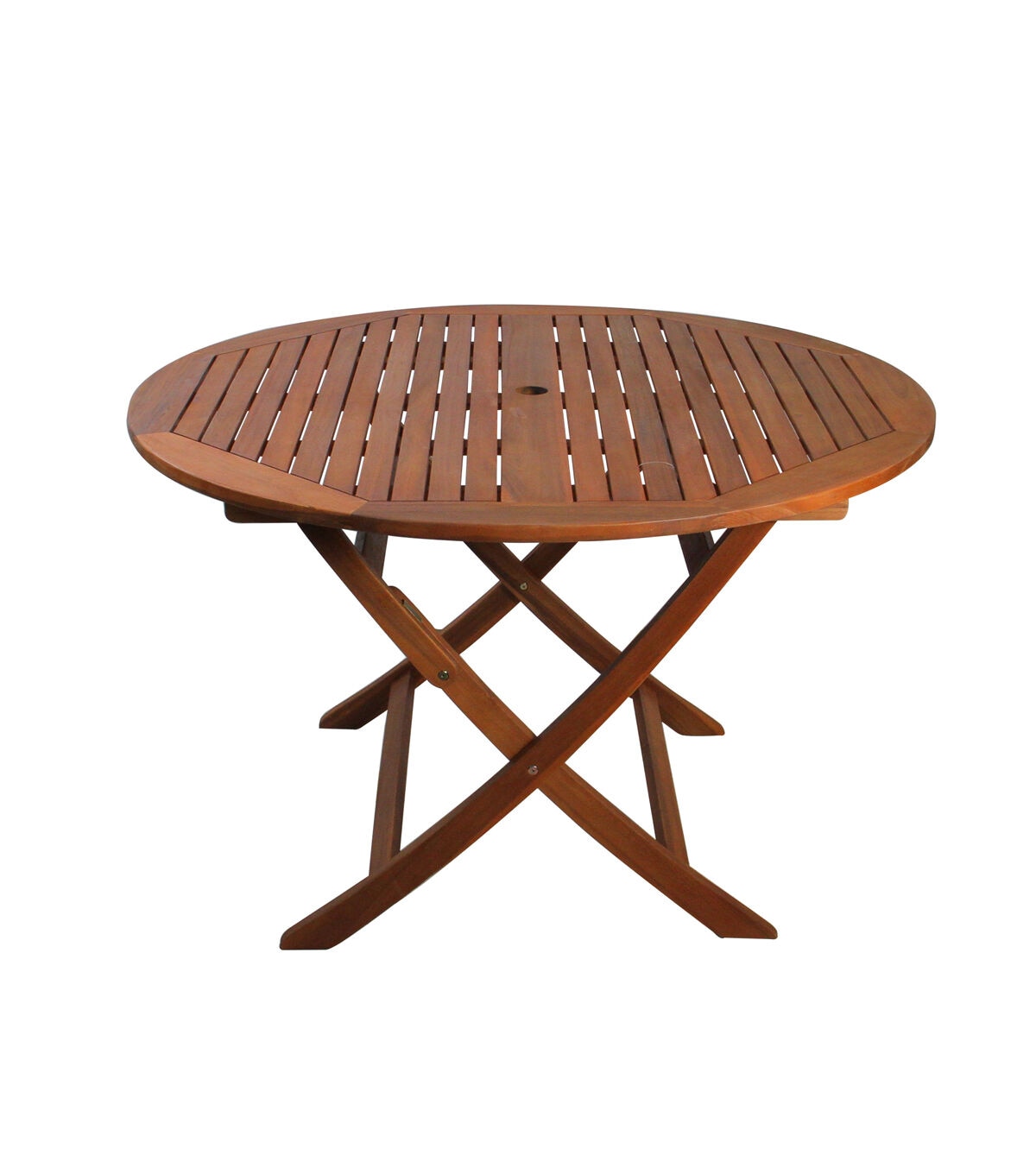 Summer time is about enjoying the sunshine with family and friends. This folding table will be the perfect addition to your summertime decor and to use year-round entertaining your guests with seating is the best way to go. This table has a wood pallet design and folds up which makes it easy to transport and to store when not in use. Product Features: Wooden outdoor dining table Brown in color Features a wooden pallet design on top This table folds for easy storage when not in use Outdoor table is circular shaped The table features long-lasting wood with water-based and waterproof coating finish Outdoor table comes with brass colored hardware and joints Easy assembly Weatherproof for indoor or outdoor use 2-inch diameter hole in the middle of the table for an umbrella pole Dimensions: 29" high x 47" diameter Material(s): acacia wood/metal