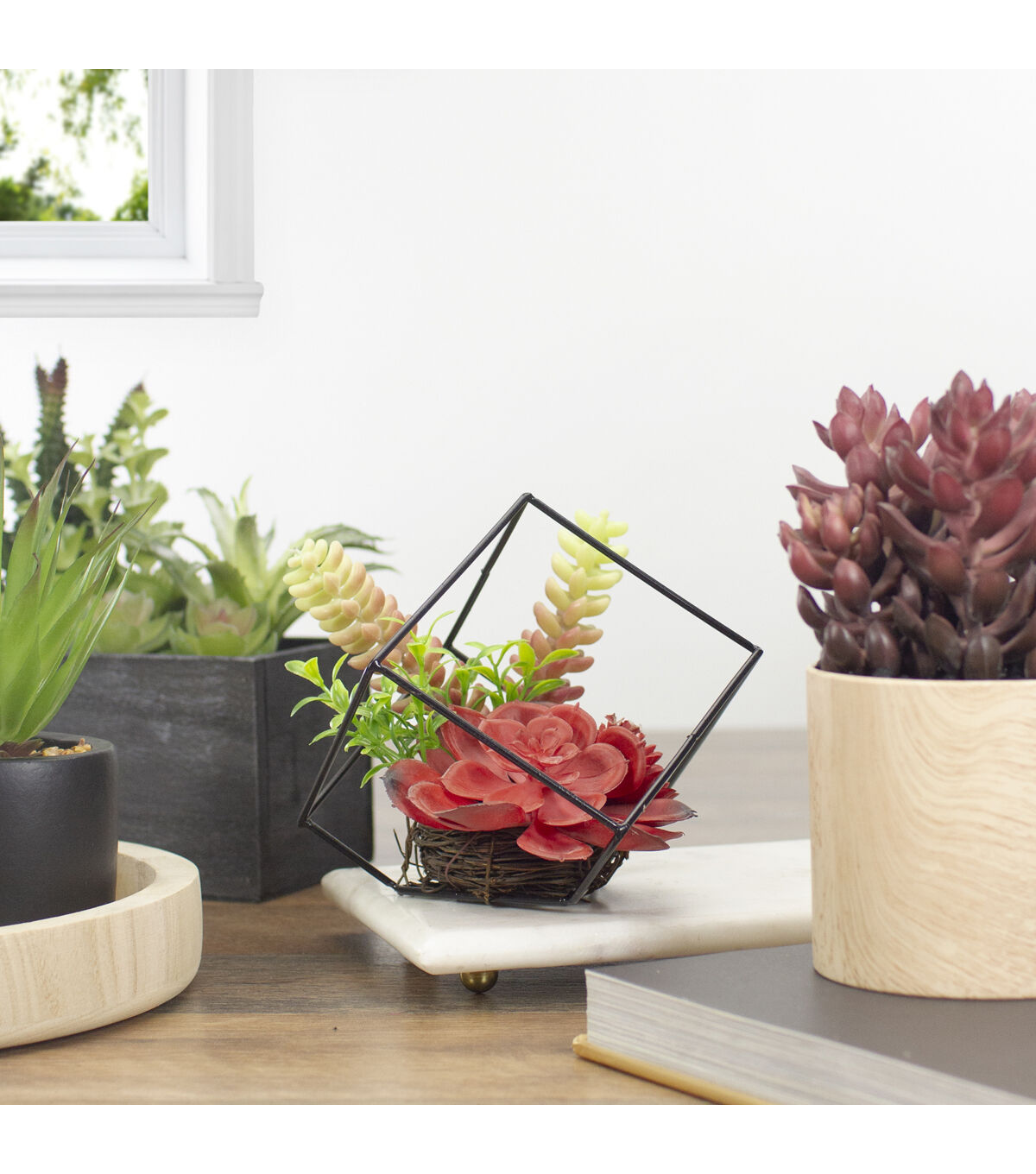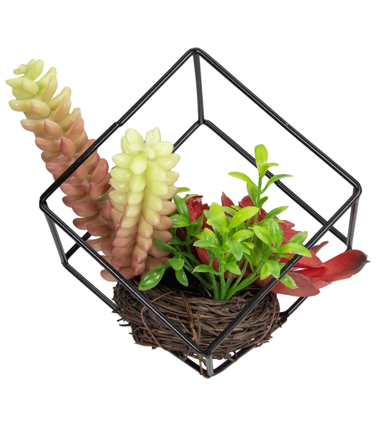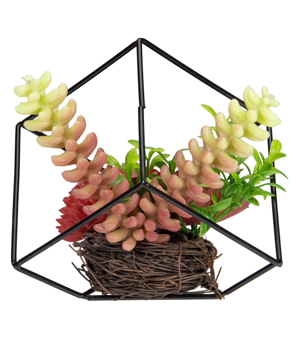 Don't let your brown thumb hold you back. Show off your love of plants with this beautiful intriguing artificial succulent. Encased in a metal geometric frame this piece is sure to give your decor a charismatic look. Easily maintained this artificial succulent is perfect for your home or office. Features: Mixed artificial succulent arrangement Nestled in a black abstract metal frame Greens and reds add rich color to any decor Succulents are set in a grapevine nest Recommended for indoor use only Dimensions: 5.5"H x 5.5"W x 5.5"D Material(s): plastic/metal