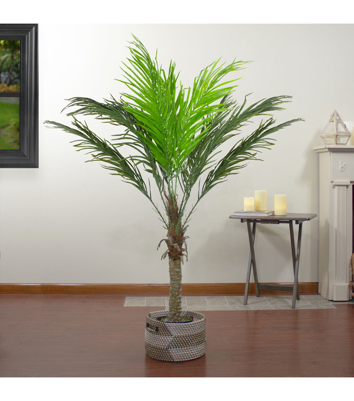 Bring a piece of the tropics home with this stunning artificial palm tree. It will add a touch of nature while enhancing your decor. Place it on your porch or in your living rooms and earn the admiration of your guests effortlessly. Product Features: Sturdy trunk with vibrant two-tone green fronds Flexible branches allow the palm tree to be shaped as you wish Comes in a black plastic pot filled with artificial moss and dirt Recommended for indoor use or outdoor covered use No assembly required Dimensions: Tree: 58.5" high x 40" diameter (fully fluffed) Pot: 7" high x 8" diameter Material(s): plastic/natural fiber