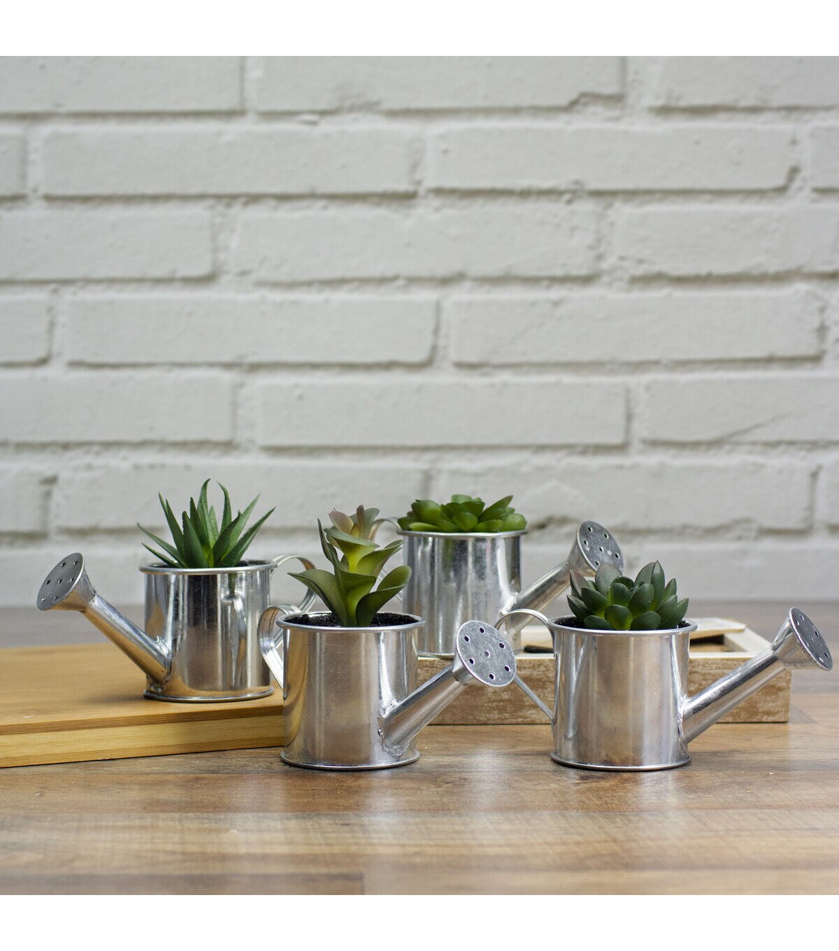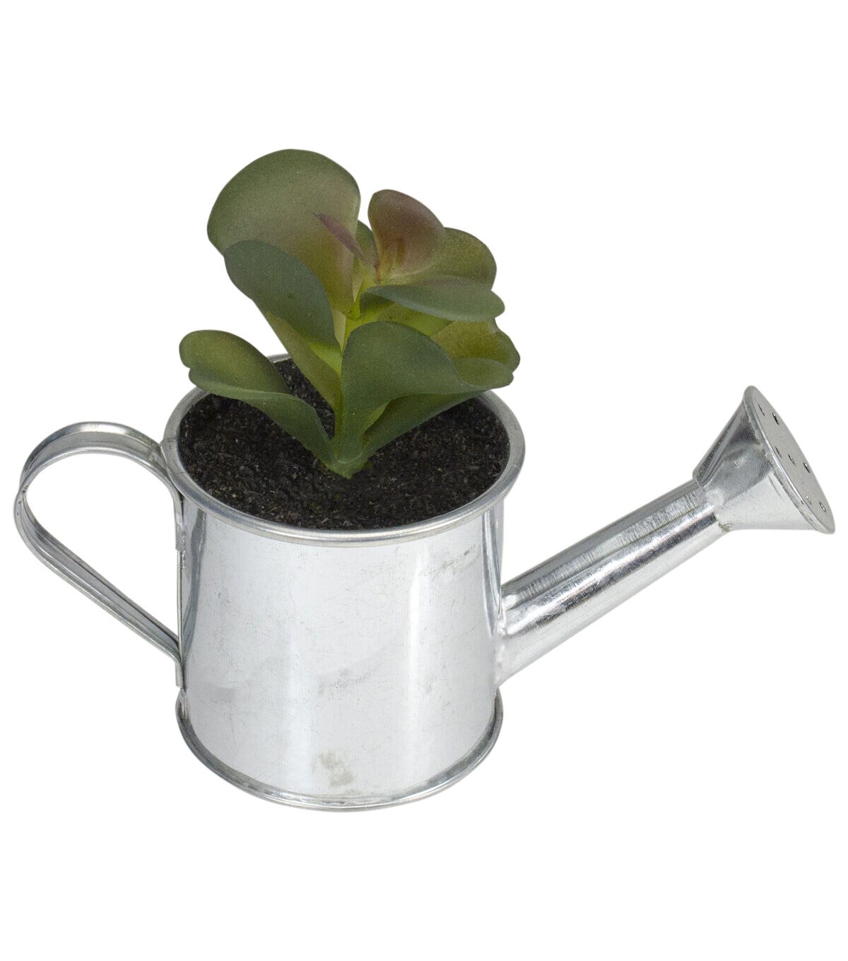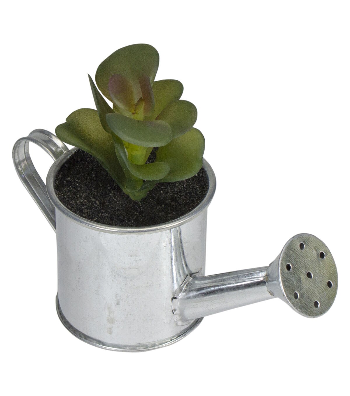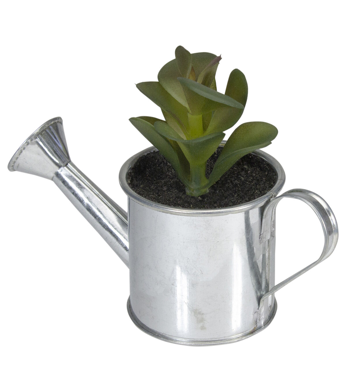 Do you love plants but do not have a green thumb or the time to care for them? Then this artificial potted cactus will be the perfect addition to your home. Pick this and redecorate your home effortlessly! Product Features: Artificial atlantis potted succulent Succulent is nestled in a silver tin watering can Set in faux dirt for stability Recommended for indoor use or outdoor covered use Dimensions: Overall Dimensions: 4"H x 6"W x 2.5"D Pot Dimensions: 2.5"H x 6"W x 2.25"D Material(s): plastic/tin