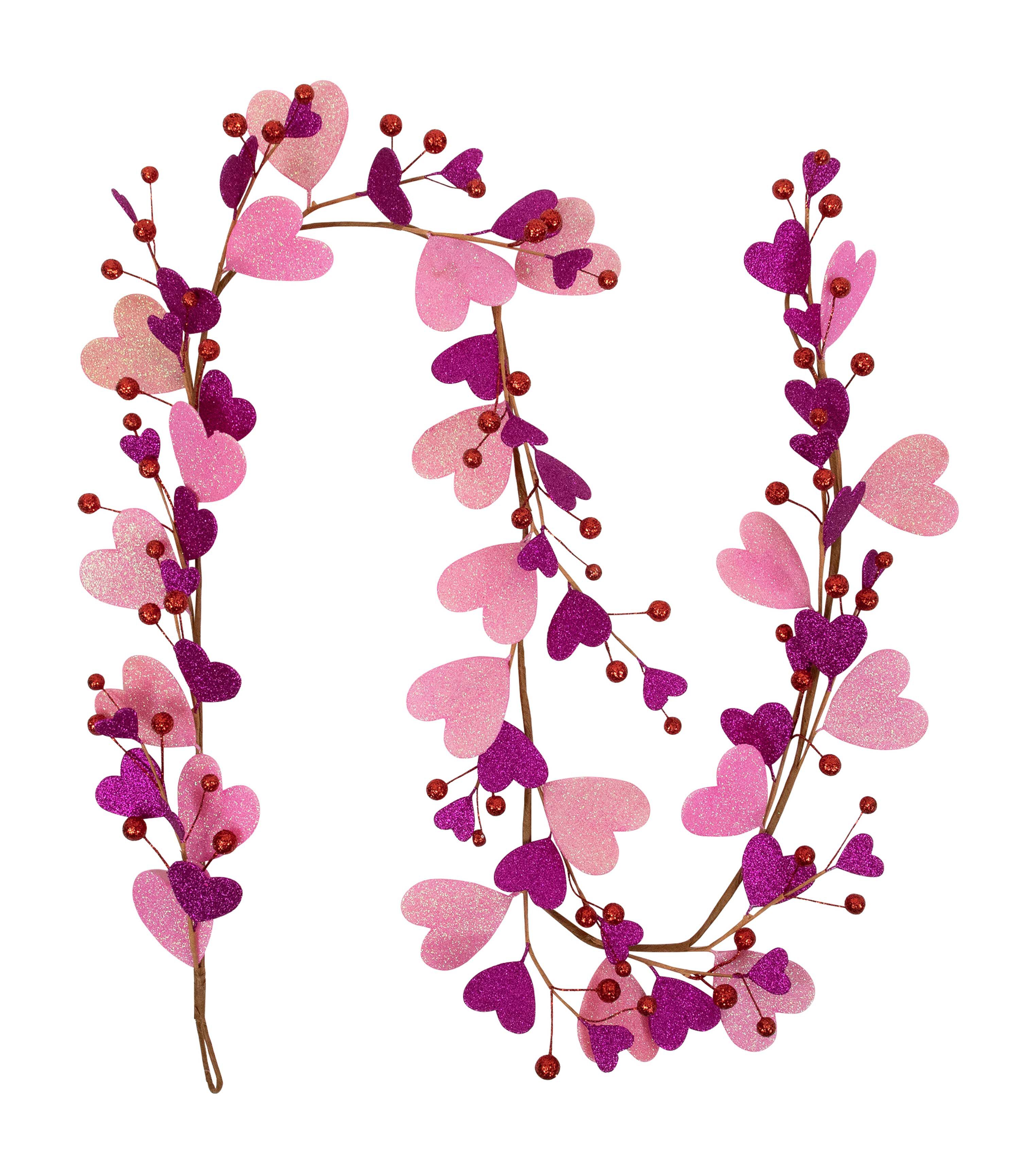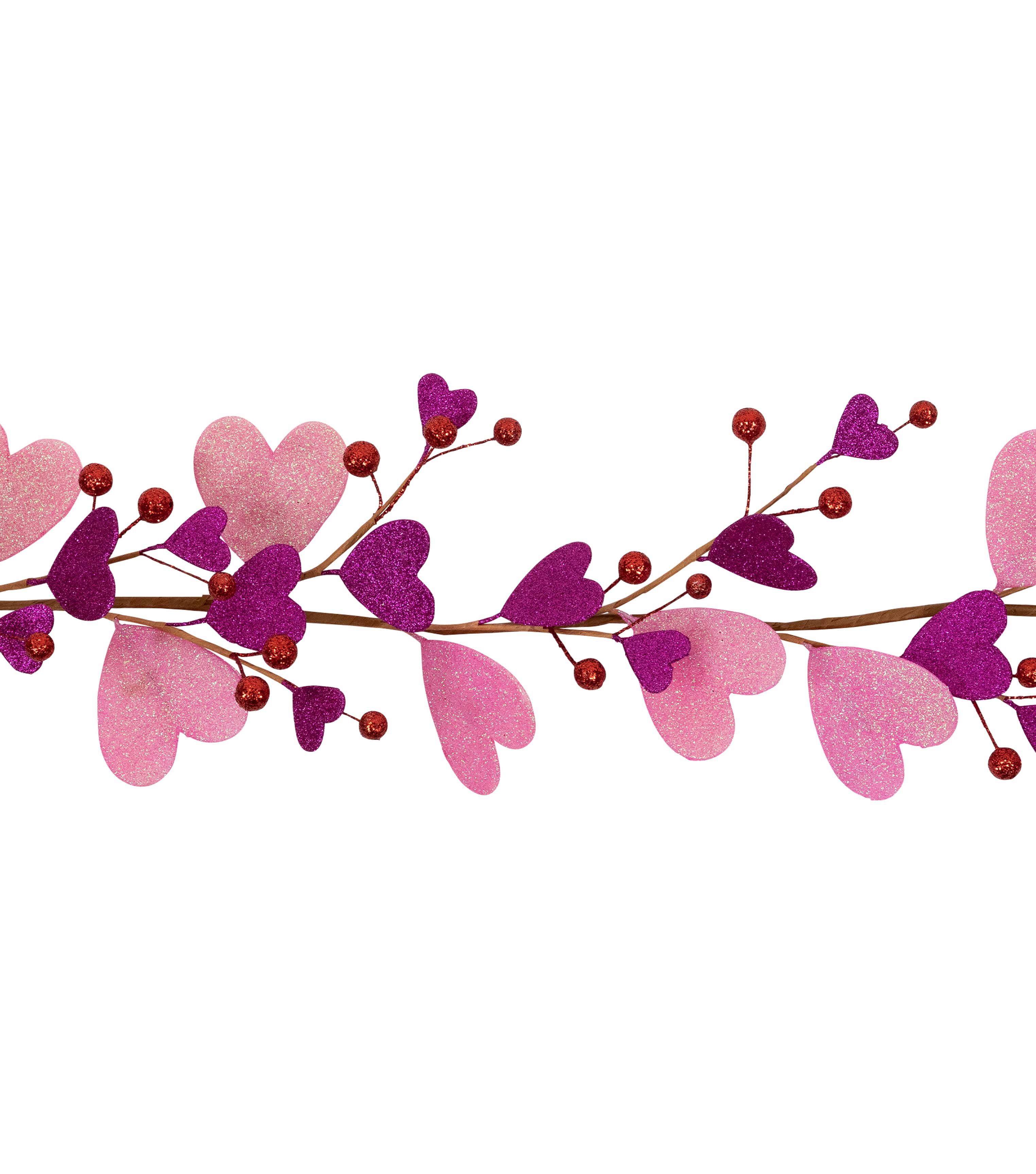 Set the stage for a truly enchanting Valentine's Day with Northlight's glitter heart garland. This charming garland is the perfect addition to your Valentine's Day decor, showcasing a delightful combination of pink and purple hearts intertwined with delicate berries. The garland's bendable wire center allows for customization, giving you the freedom to add your own personal touch with string lights or other decorative elements.