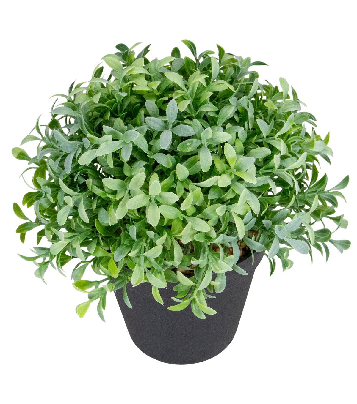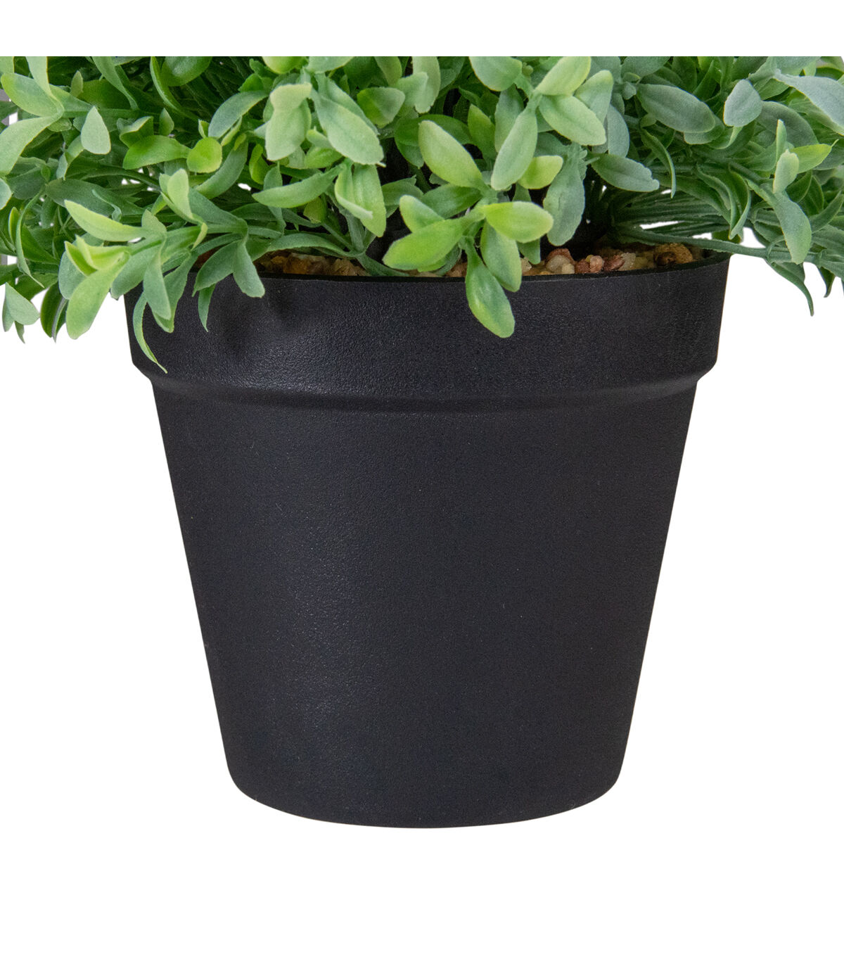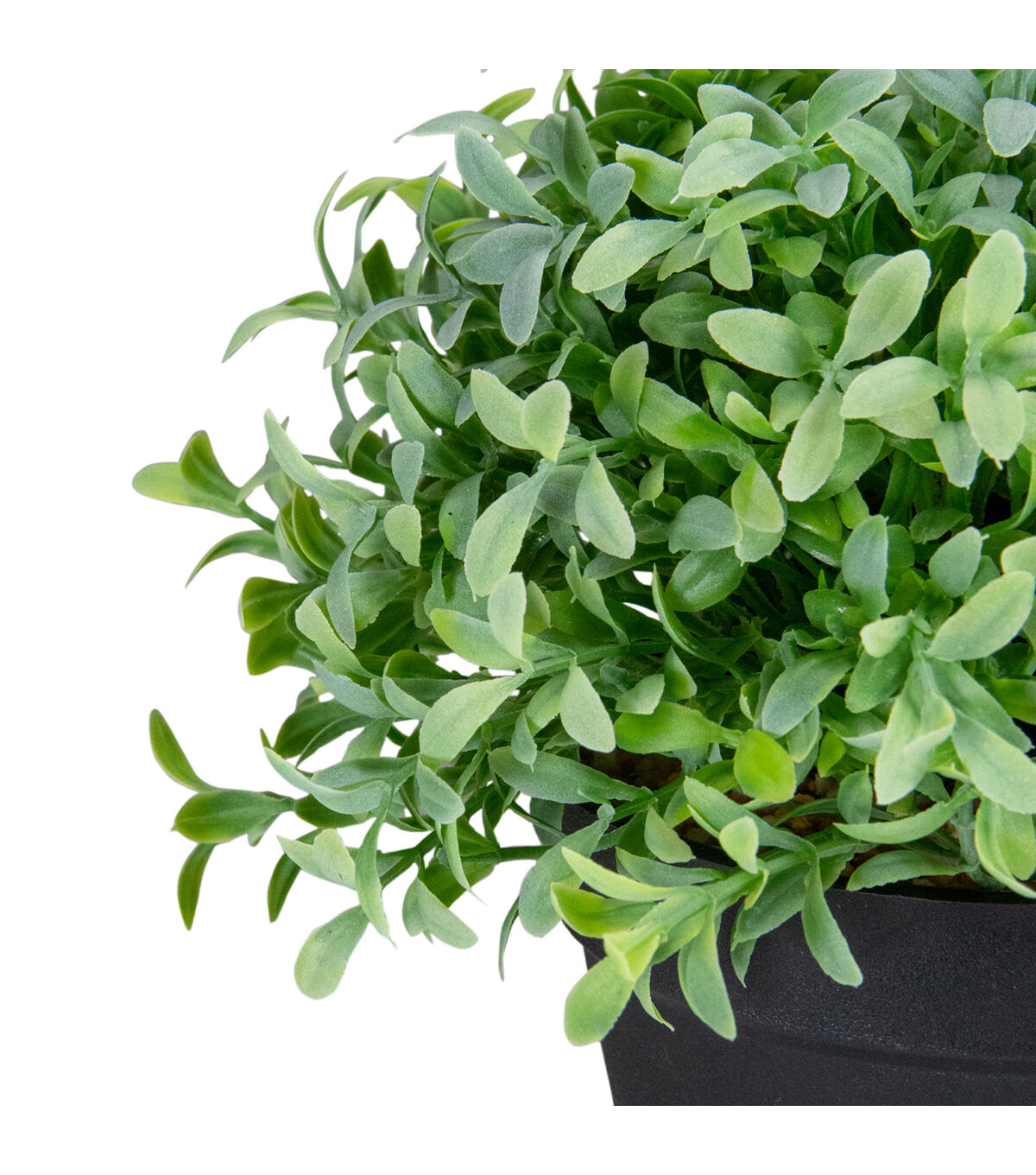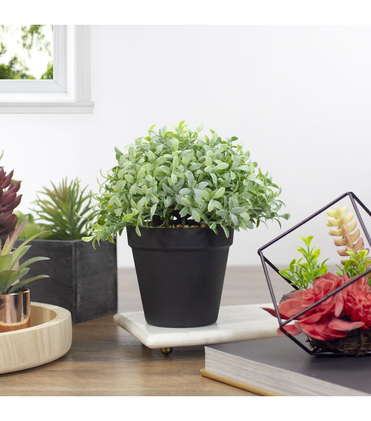 Don't let your brown thumb hold you back. Show off your love of plants with this artificial boxwood arrangement. This faux plant is held in a black pot with faux dirt and stone for a realistic look. Easily maintained this artificialplant is perfect for your home or office. Features: Artificial boxwood plant in a pot Nestled inside of a black plastic pot Plant is set in "faux dirt" and stone for stability Recommended for use indoors only - if using outdoor keep in a covered area Overall dimensions: 7.5" high x 7" diameter Pot dimensions: 4" high x 4" diameter Material(s): plastic