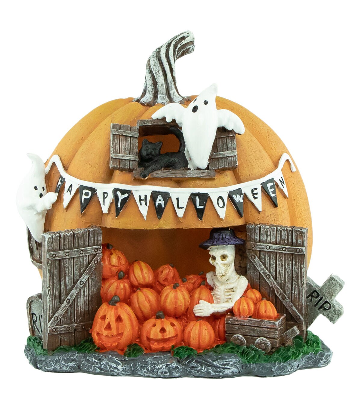 Features a pumpkin with windows doors a "Happy Halloween" banner