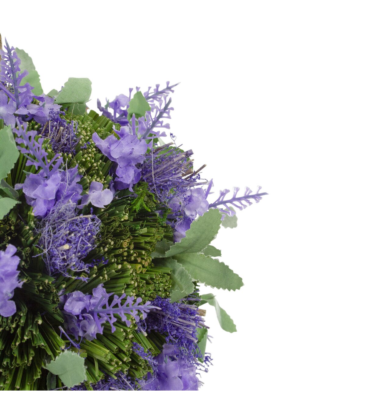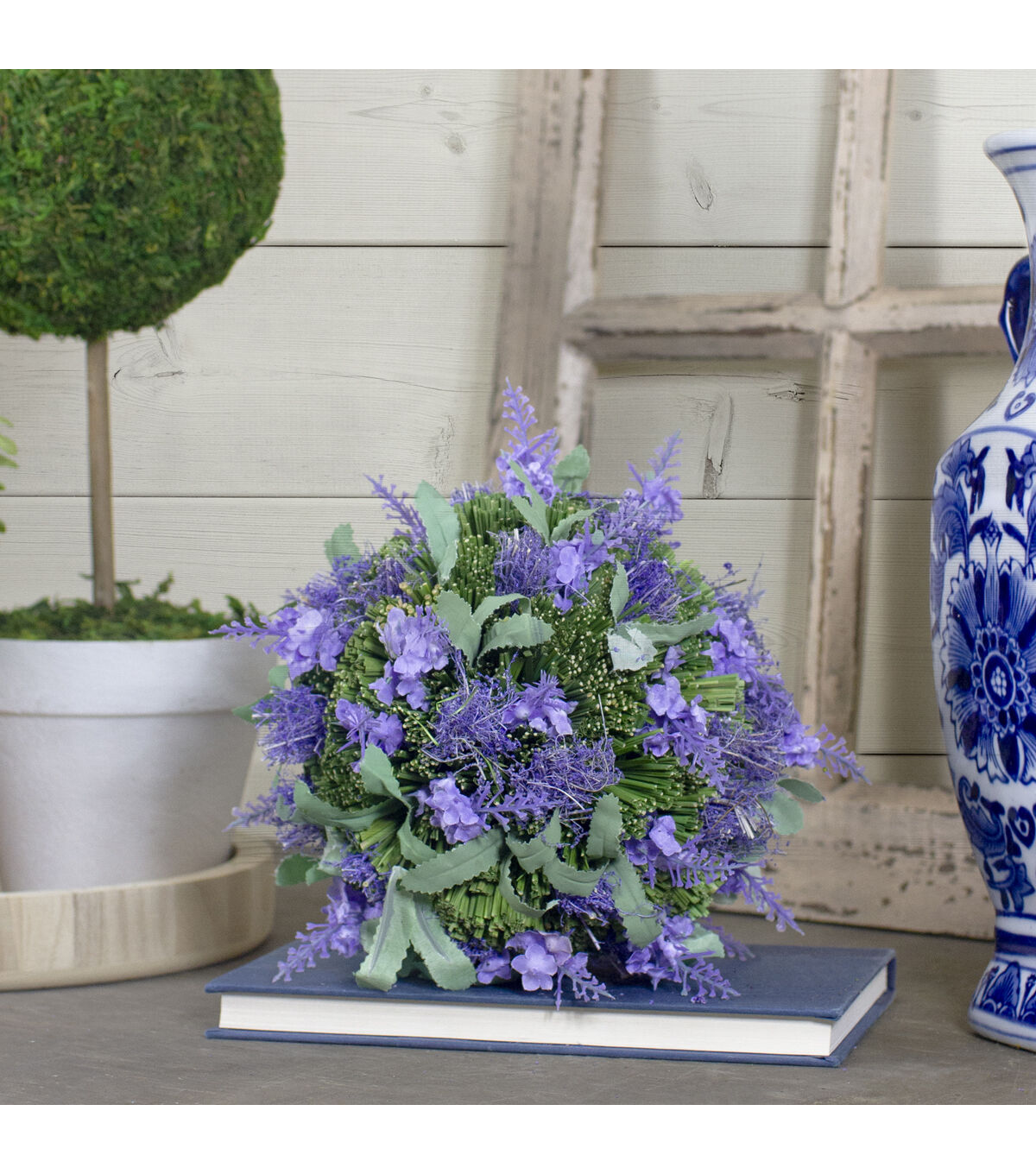 Looking for a swift way to spruce up your tables this festive season? This lavender with greenery infused foliage ball is perfect for decorating all year round. With a gorgeous array of colors use the ball can also be placed around vases or under bowls for an artistic touch. Product Features: Purple and green artificial floral and foliage hanging spehere Comes with light shades of green and purple Comes ready to hang Recommended for indoor use only Dimensions: 7" high x 7" diameter Material(s): plastic/sisal