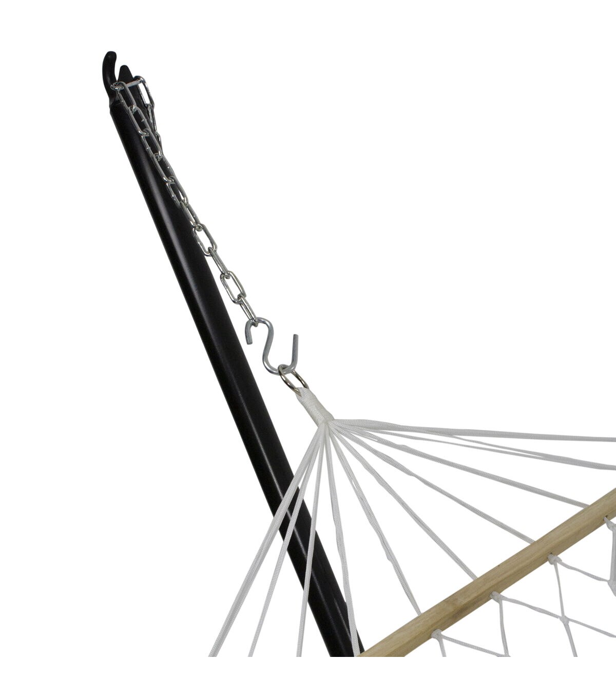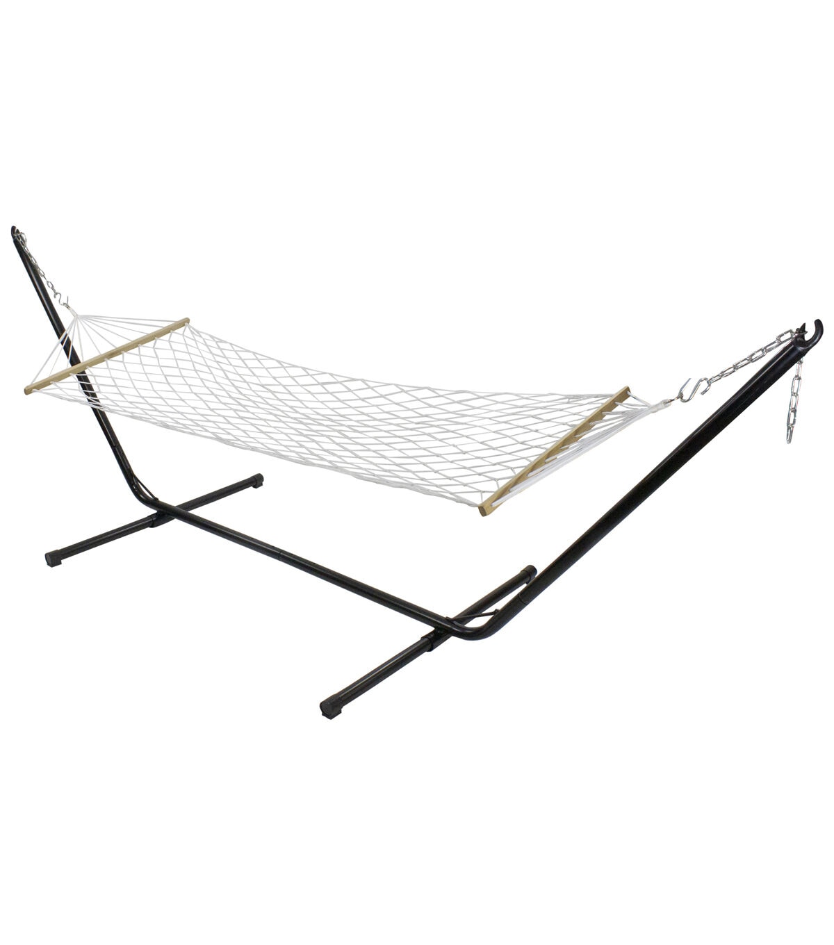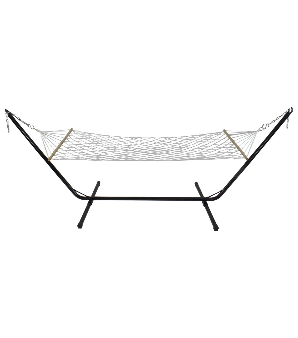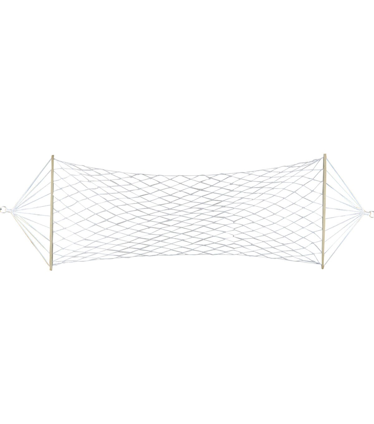 Add this relaxing hammock to your outdoor living space for some cozy trendiness. This hammock would be the perfect addition to your outdoor space. Bring this hammock camping keep it in your back yard or in an enclosed space for easy comfort. Features: White rope hammock with lattice pattern rope design Comes with attached rope and wooden bars for easy hanging and stability 1-person hammock Recommended for adults children need to be supervised Can be used indoor or outdoor Weight capacity: 265lbs Dimensions: 78" long x 31" wide Material(s): polyester/wood Note: Hammock only - stand and hanging hardware are not included