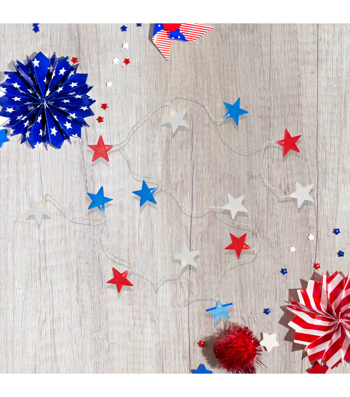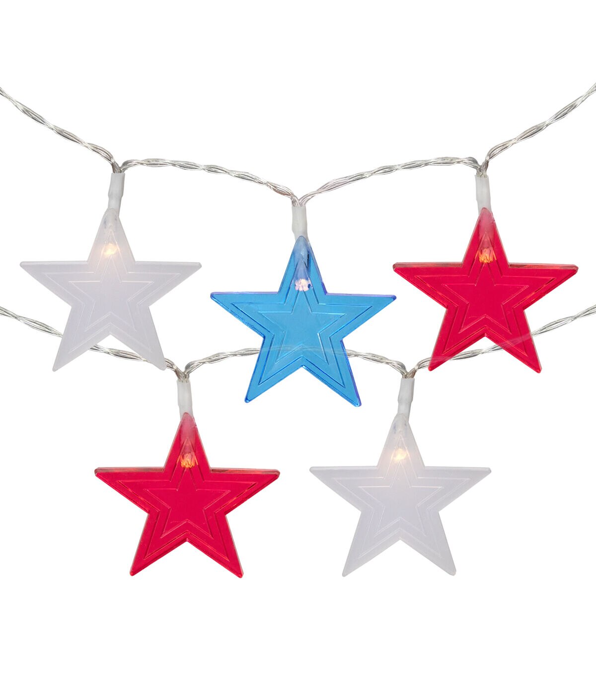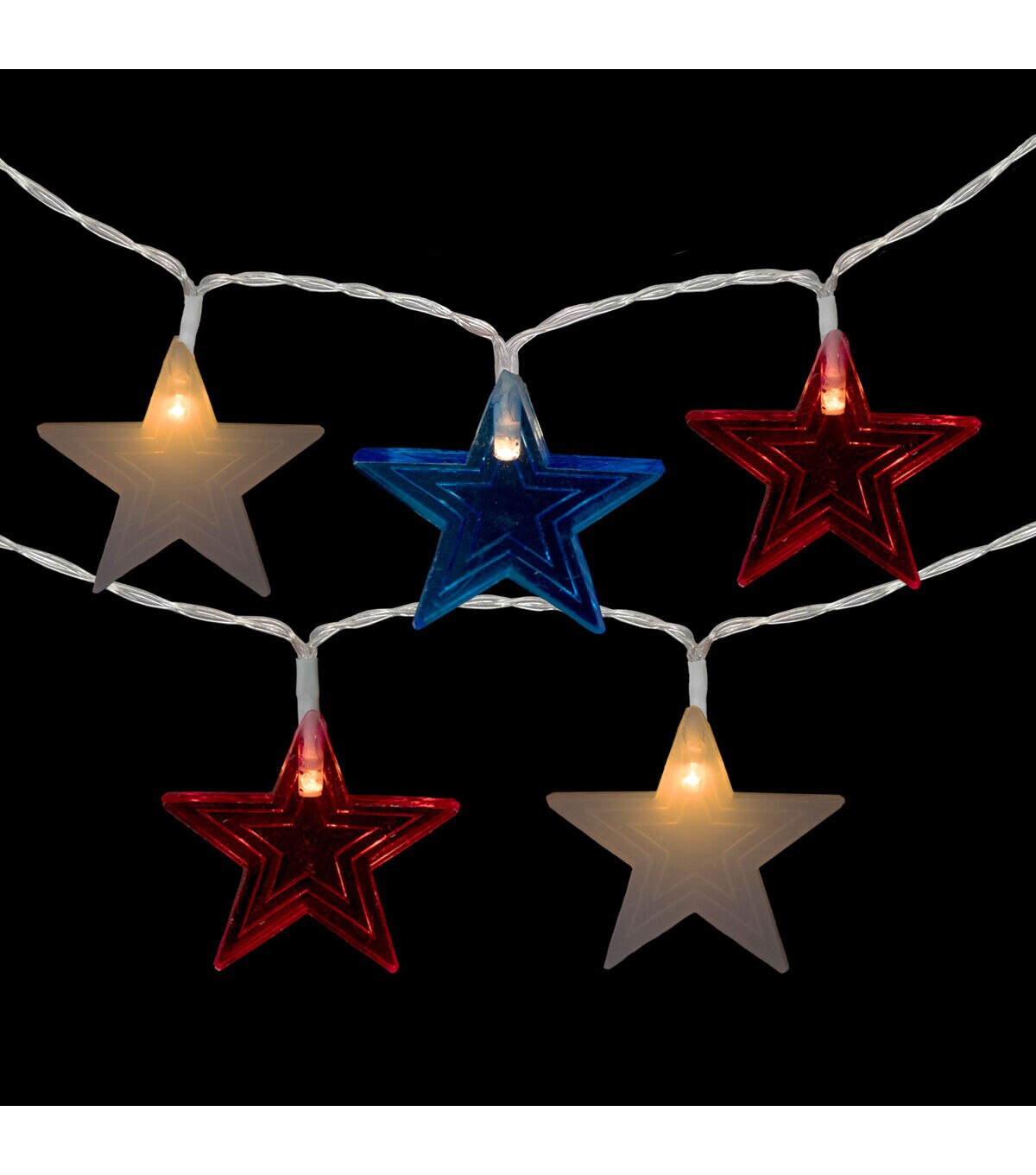 Display your patriotism this 4th of July with our string of Americana star string lights. The stars are red white and blue and each houses one warm white micro LED light that provides a warm cozy glow. Also perfect for Memorial Day decorating!