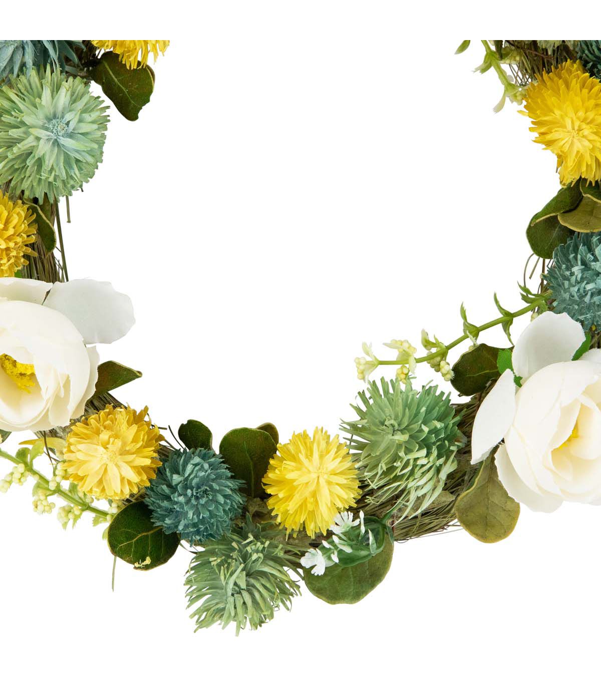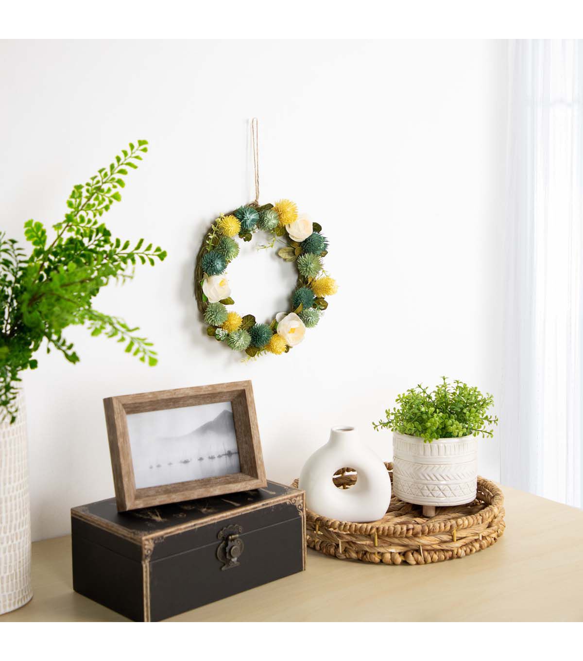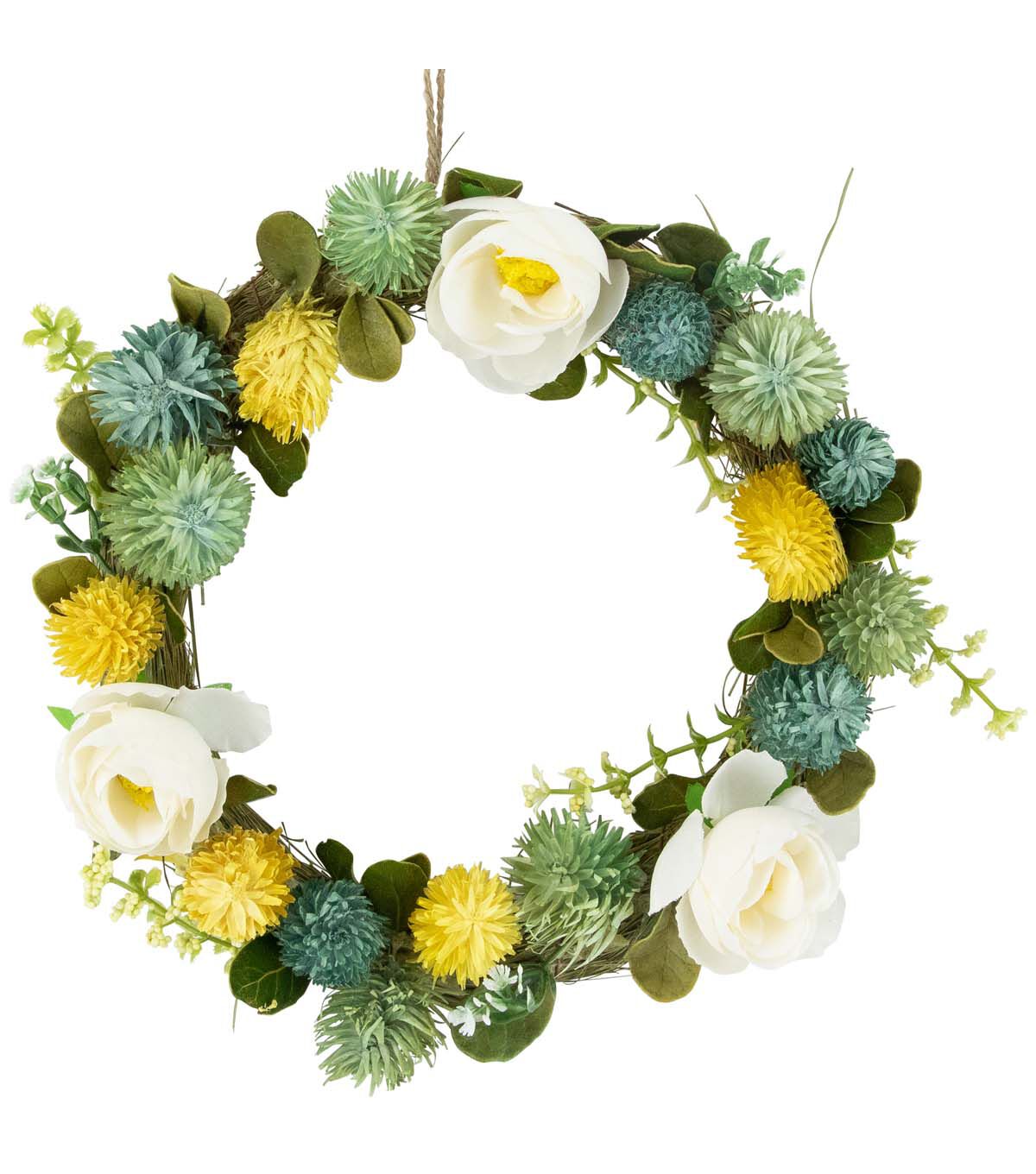 Bring the beauty of spring into your home with this stunning spring rose wreath. Handcrafted with care this faux grass wreath features cream roses and pops of bright yellow and green thistle. Green leaves and delicate flower buds surround the flowers. The natural jute rope provides a charming rustic touch making it easy to hang on any door or wall. Whether you're looking to refresh your home decor or add a touch of warmth to your living space this wreath is the perfect choice for the spring season. Its timeless design will elevate any room in your home bringing the beauty of nature right to your doorstep or mantles.