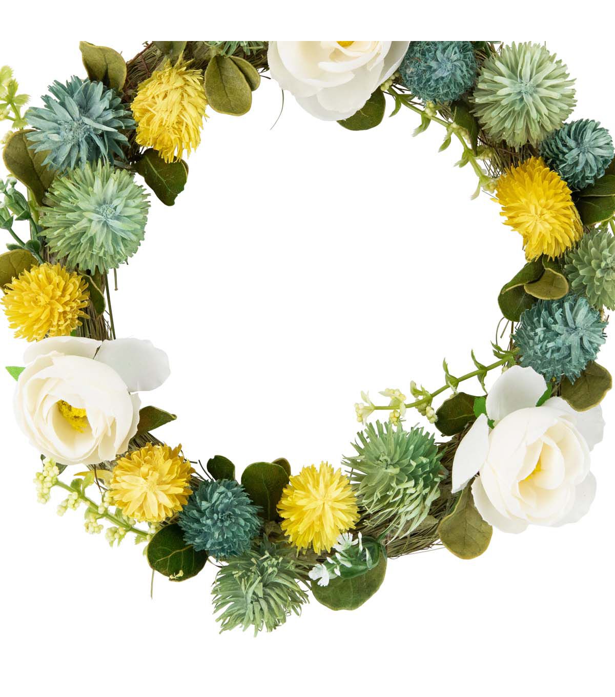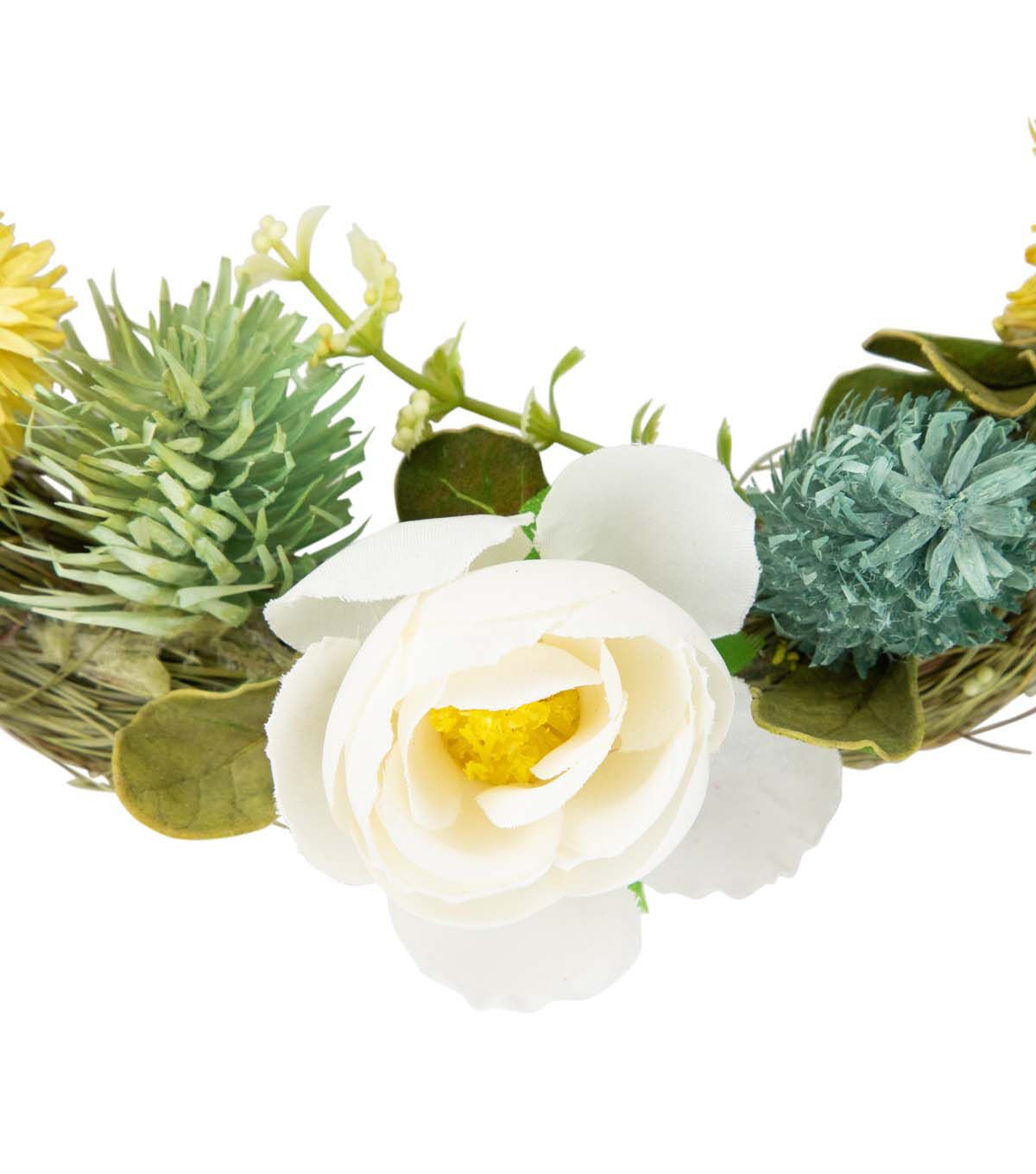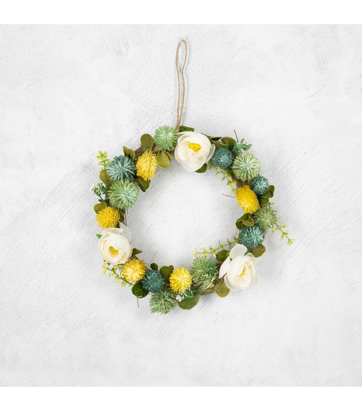 9" Cream Rose Green and Yellow Thistle Hanging Spring Wreath