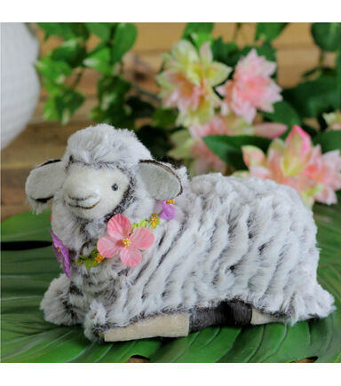 This adorable sheep is all dressed and ready for spring and Easter to come around. This kneeling sheep lends a vintage feel and features life-like details! Perfect for adding a little springtime feel to your kitchen or living room. Features: Depicts a kneeling sheep wearing a pink and purple floral lei around its neck. Super soft ultra plush life-like patterns mimic the coat of a natural sheep. For indoor decorative use. Care instructions: spot clean with soap and warm water air dry only Dimensions: 5"H x 6.75"W x 4"D. Material(s): foam/polyester/plastic